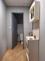 A l'intérieur on trouve un bureau de 17.5m², un WC avec lavabo, une pièce de stockage de 10m² et un espace de stockage en hauteur de 21 m².