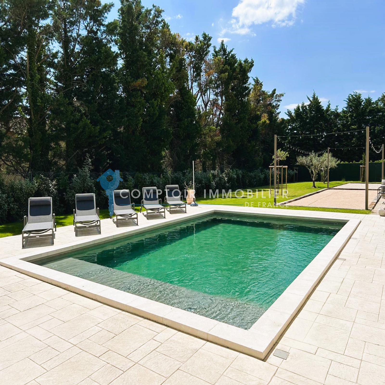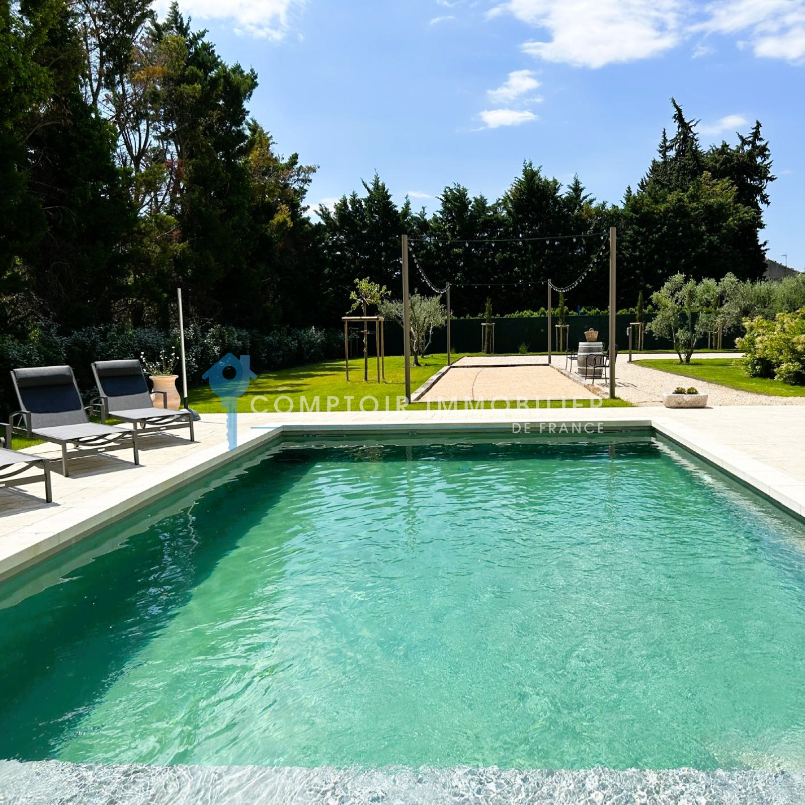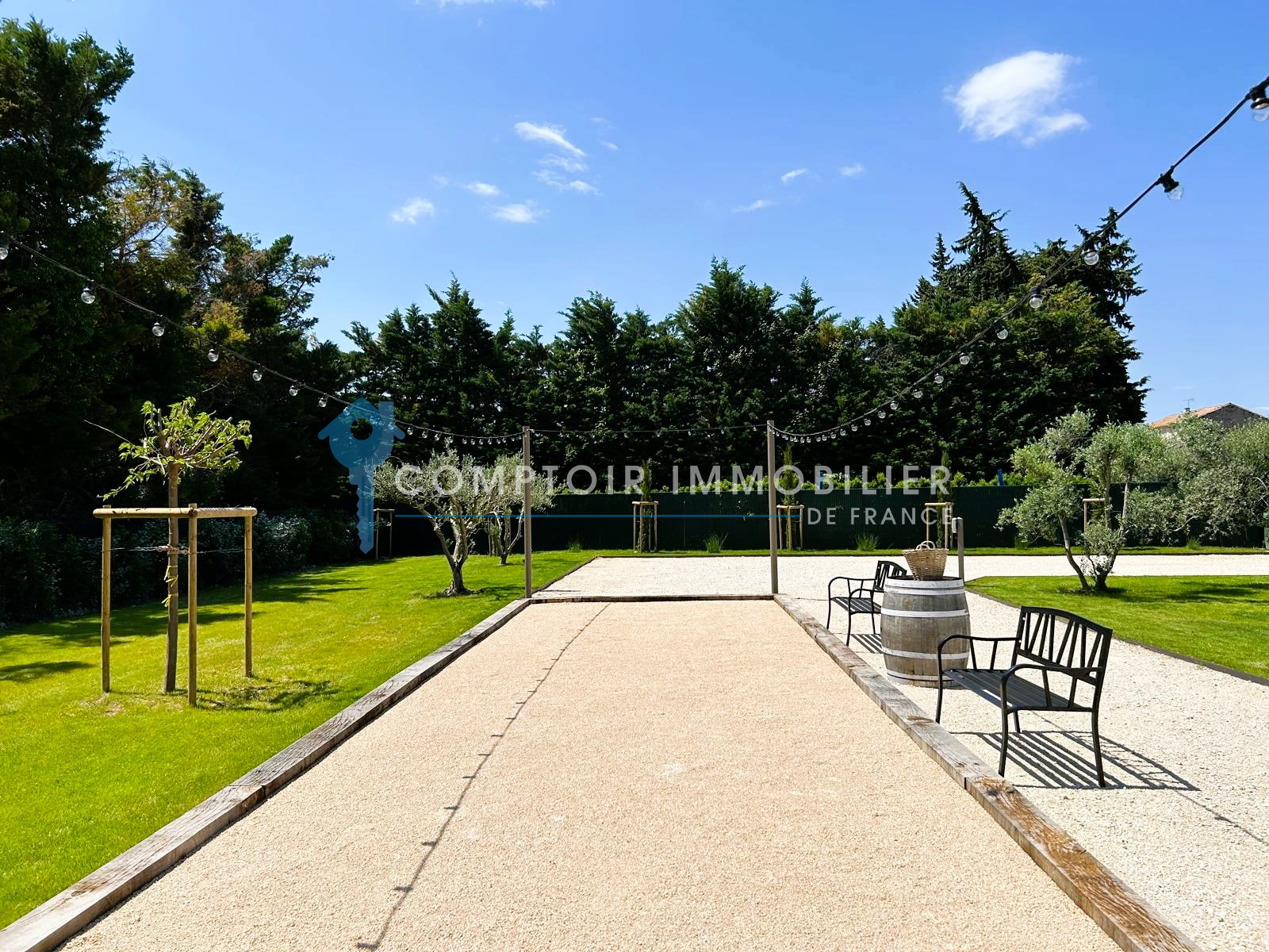 À l’extérieur, Piscine chauffée avec plage sécurisée et transats, salon de jardin avec barbecue à gaz, terrain de pétanque, parking privé avec borne de recharge électrique, le tout protégé par un portail éléctrique.