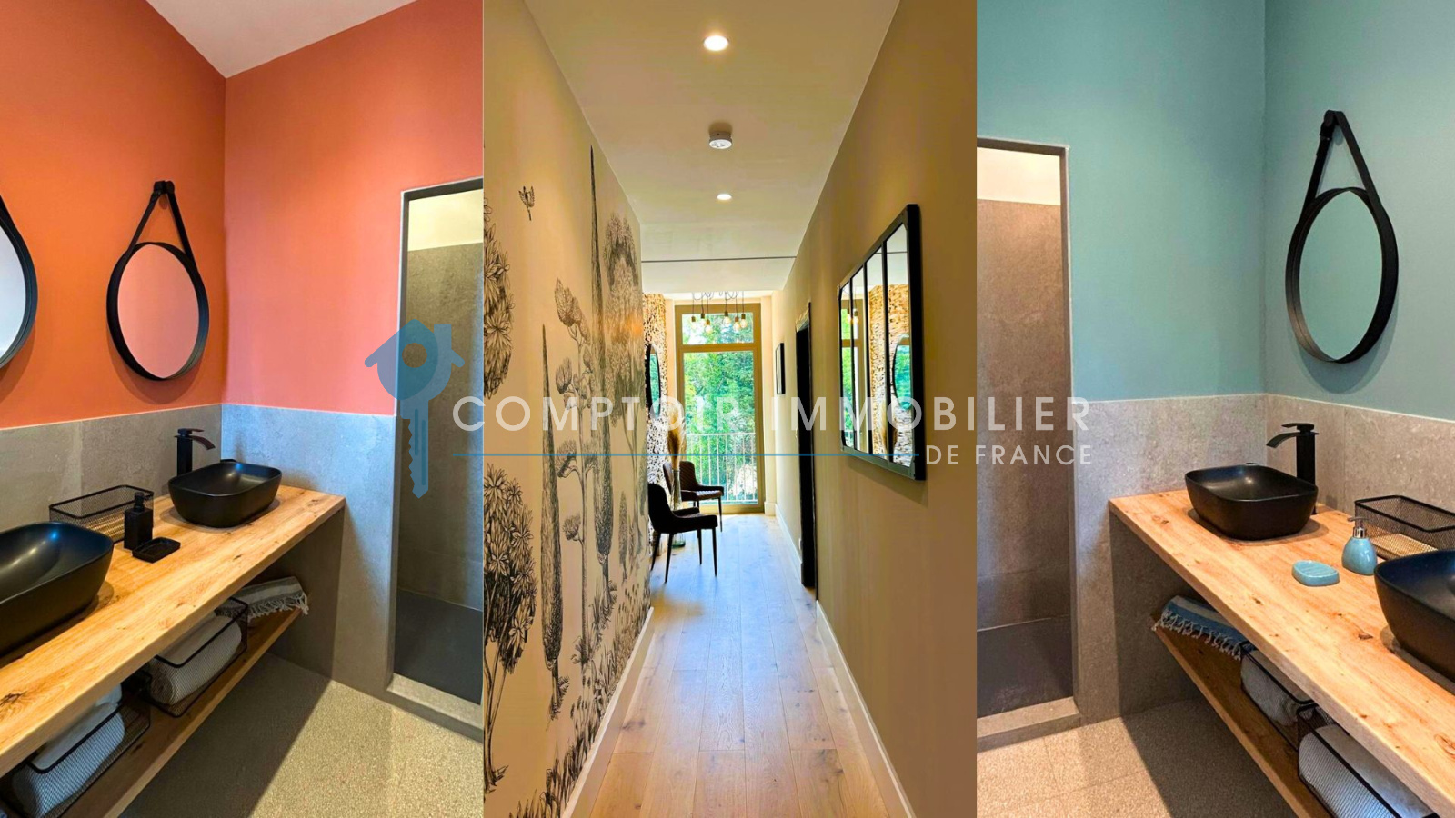 Côté nuit, cinq suites parentales tout confort, chacune avec salle d’eau privative, dont une accessible aux personnes à mobilité réduite au rez-de-chaussée.