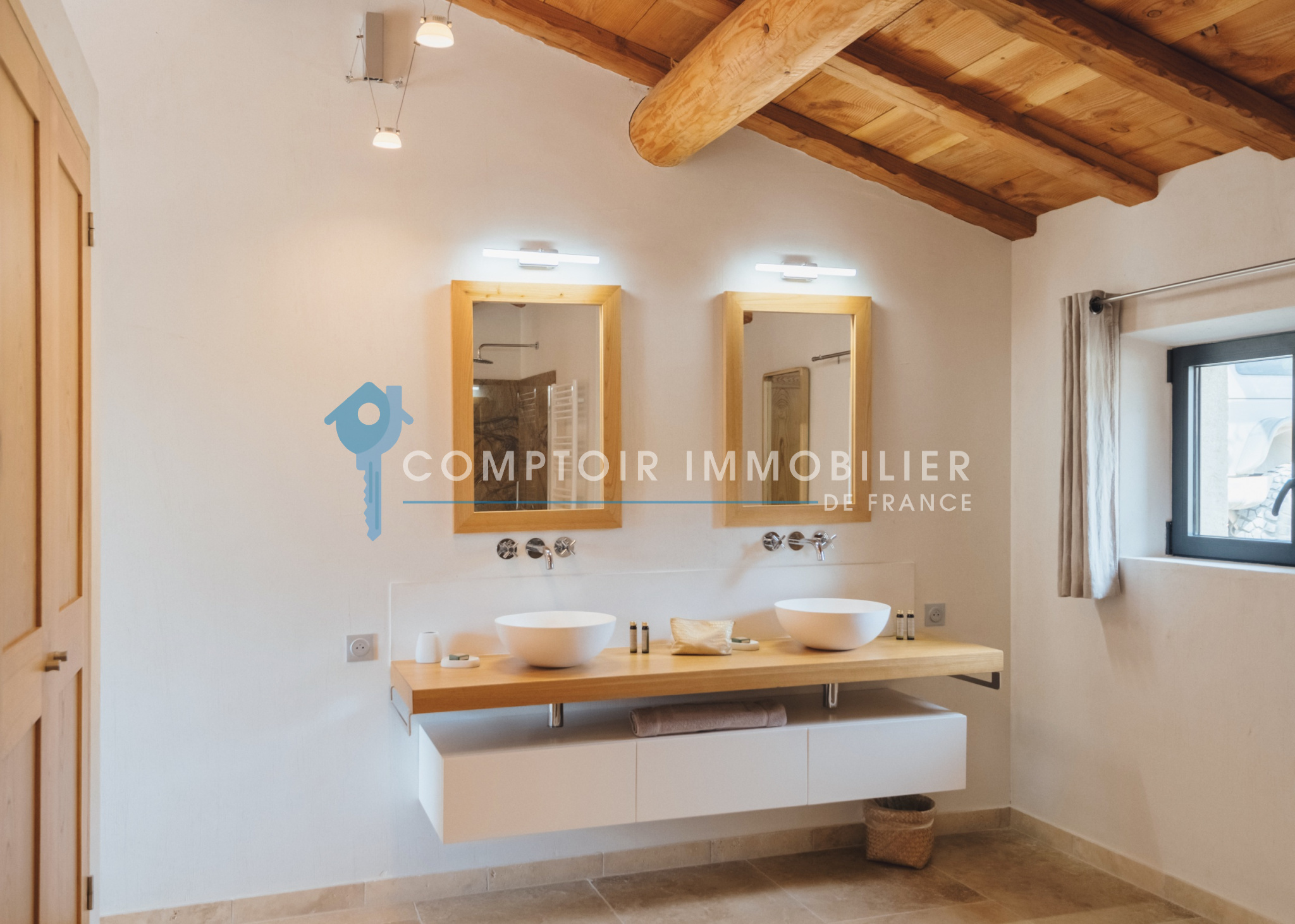 À l’étage, quatre chambres raffinées, chacune disposant de sa salle d’eau et de toilettes privatives, dont une suite master, sublimée par une baignoire.