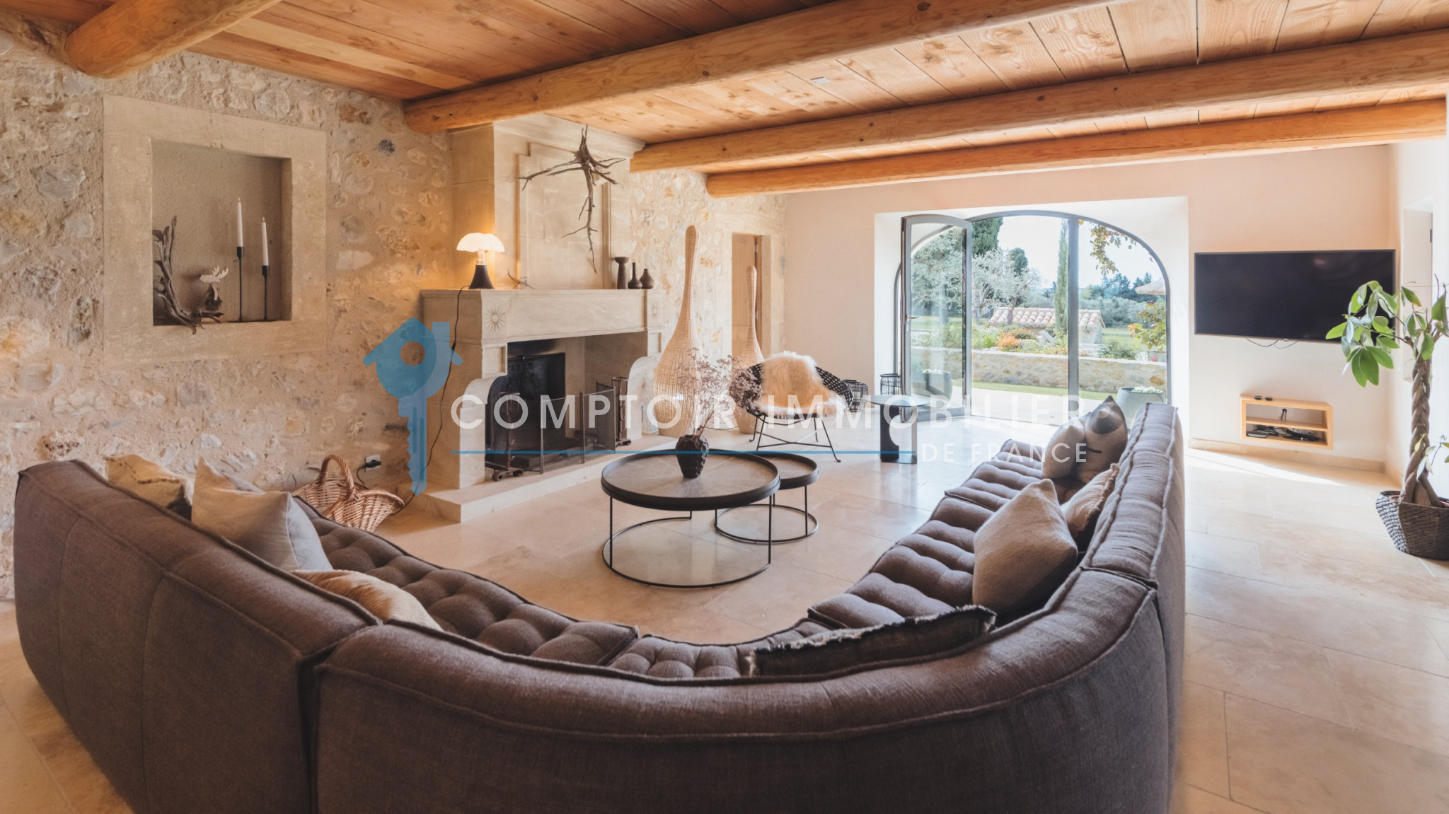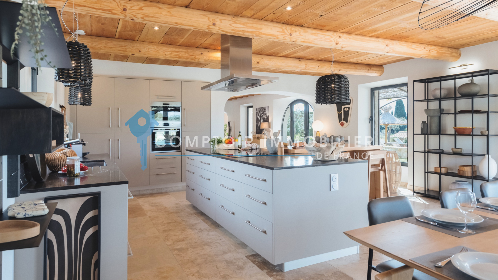 Au rez-de-chaussée, les espaces de vie se déploient avec élégance et convivialité. La cuisine ouverte, lumineuse et généreuse, prolongée par une buanderie, s’ouvre sur une vaste terrasse où les repas se savourent face à la piscine, bercés par une vue dégagée et apaisante. Le salon, sublimé par ses murs en pierre apparente, dans une atmosphère chaleureuse et authentique.