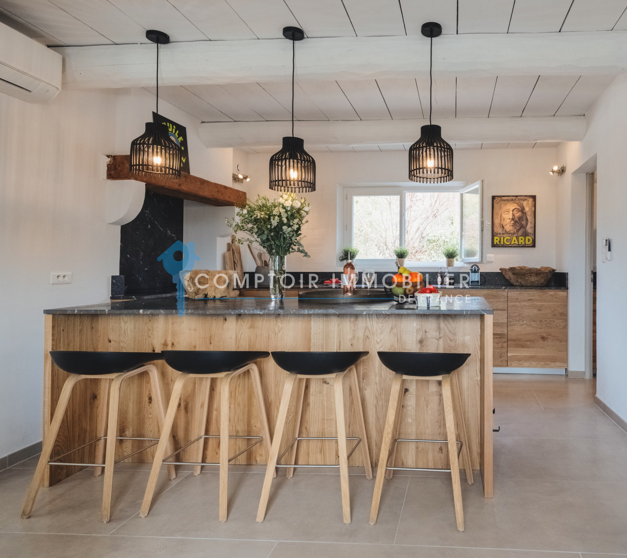 Elle se compose, au rez-de-chaussée, d’un hall d’entrée, d’un salon chaleureux avec cheminée, d’une cuisine américaine ouverte sur la salle à manger, ainsi que d’une buanderie. Une chambre avec salle d’eau (lavabo et WC) et accès direct au jardin complète ce niveau.
