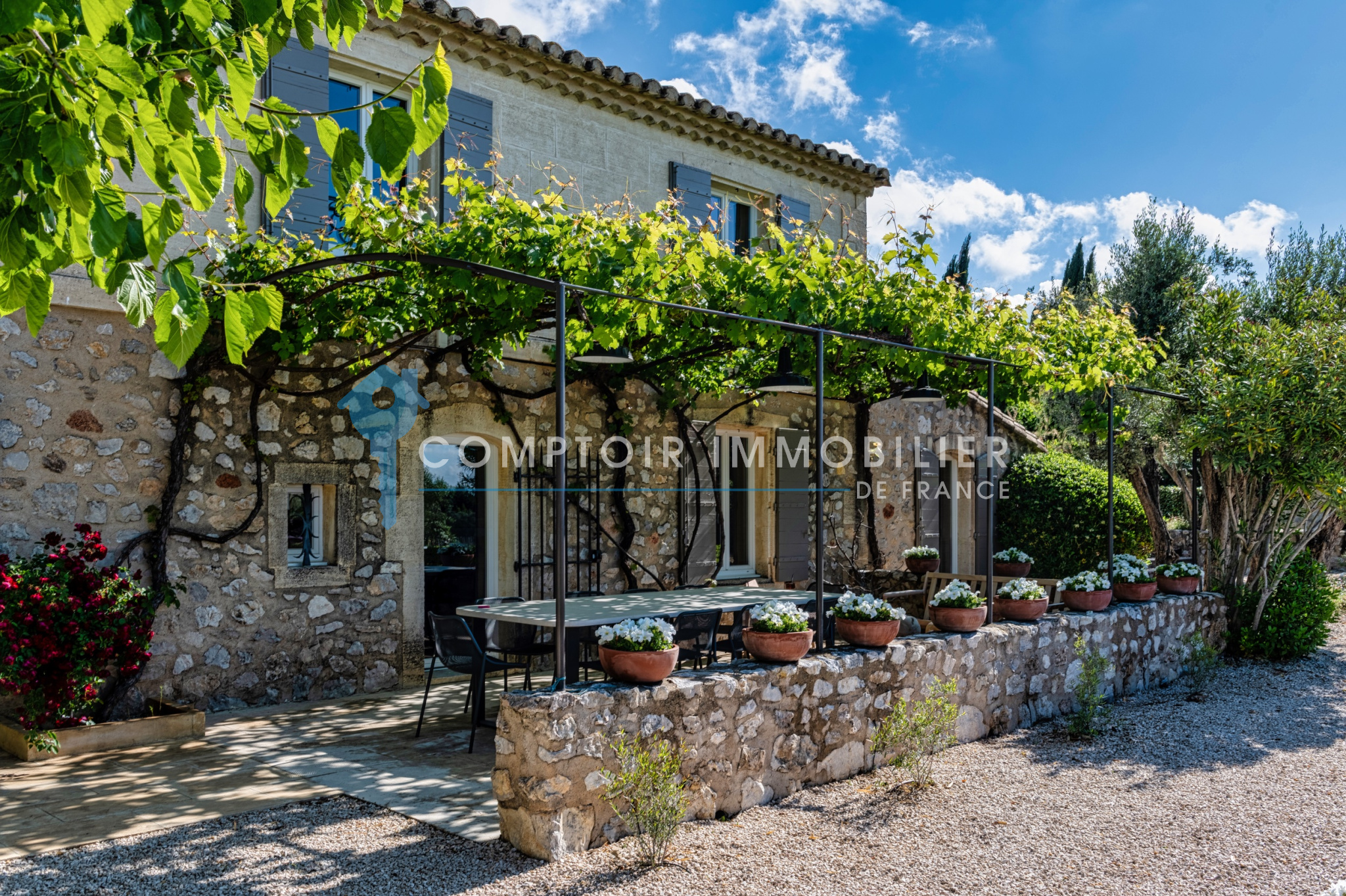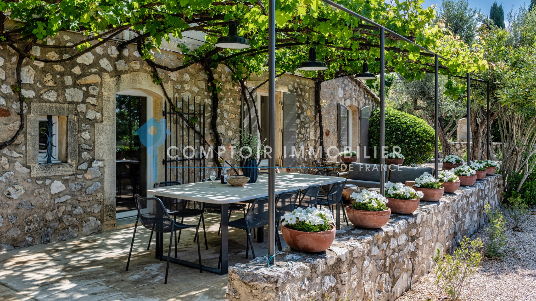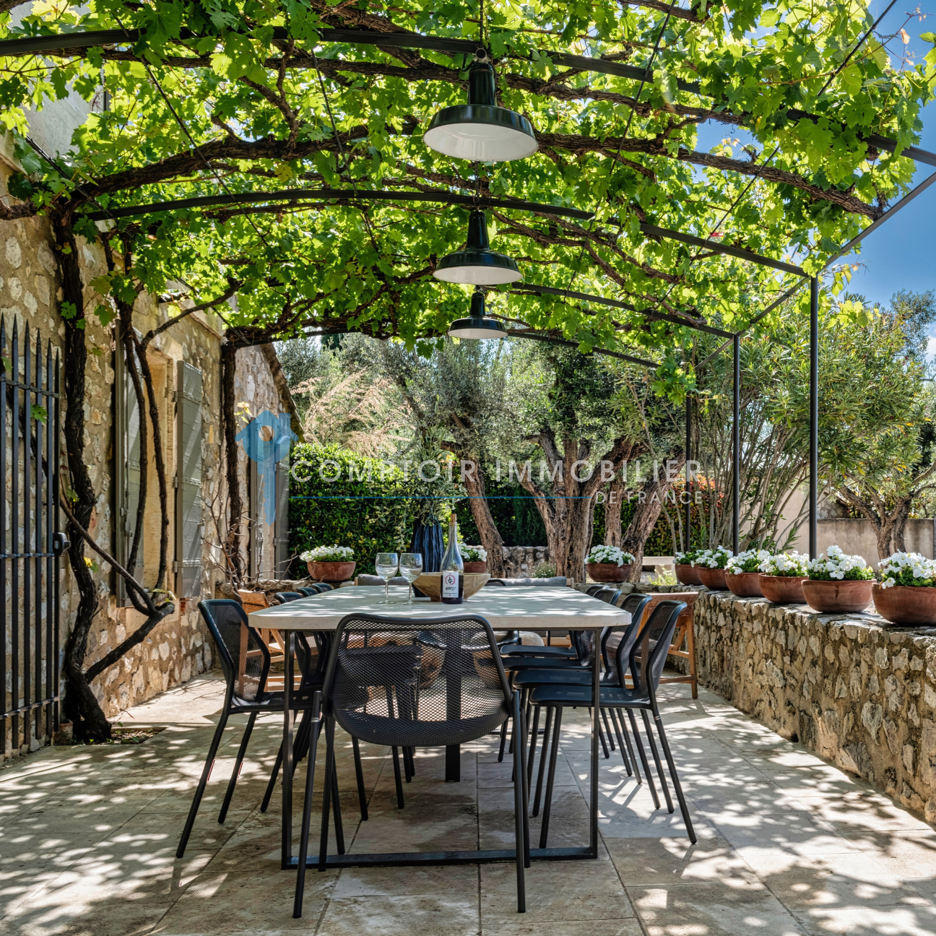 Une terrasse ombragée par une magnifique treille accueille une grande table pour vos repas en plein air, avec un accès direct à la cuisine. Un coin salon sous la vigne permet de savourer des instants de calme, tandis qu’un second salon extérieur est idéal pour partager des moments en famille ou entre amis.
