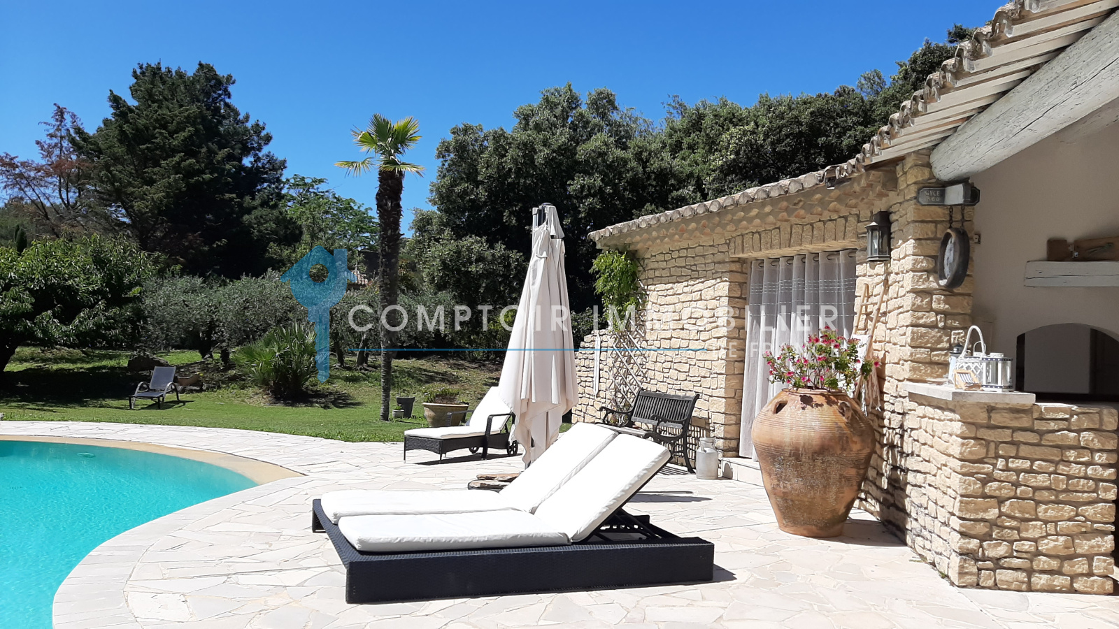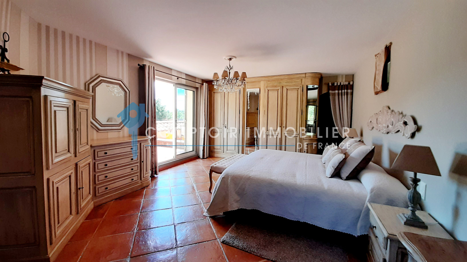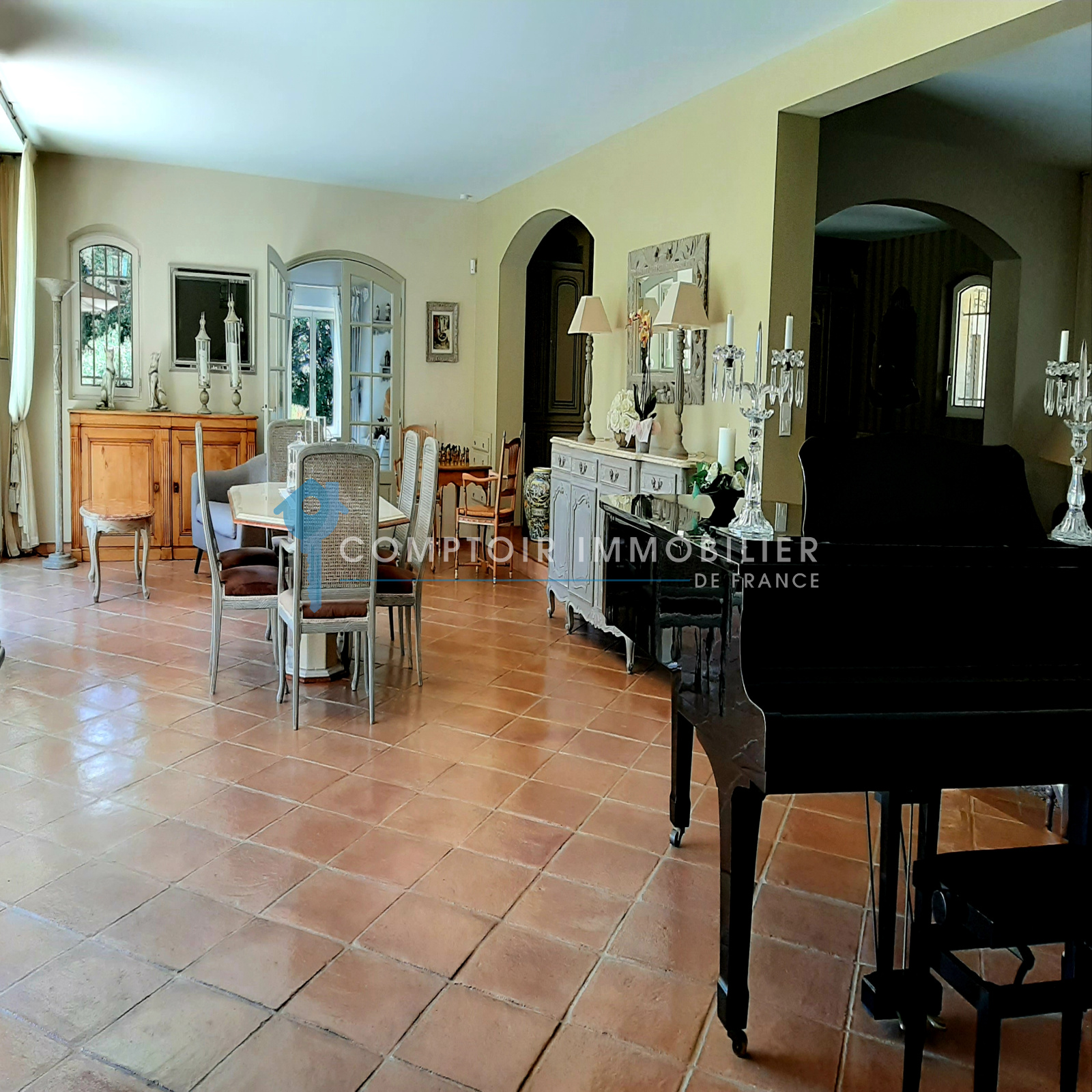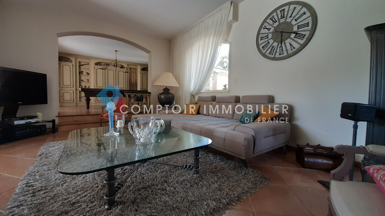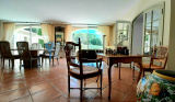 La maison comprend une entrée avec bureau et piano, une cuisine équipée, un salon avec TV et cheminée, un salon bibliothèque avec billard, une salle à manger, et une buanderie. Quatre chambres doubles, une salle d'eau, une salle de bain, et deux toilettes sont au rez-de-chaussée. À l'étage, une suite parentale climatisée avec terrasse surplombe la piscine et le jardin.