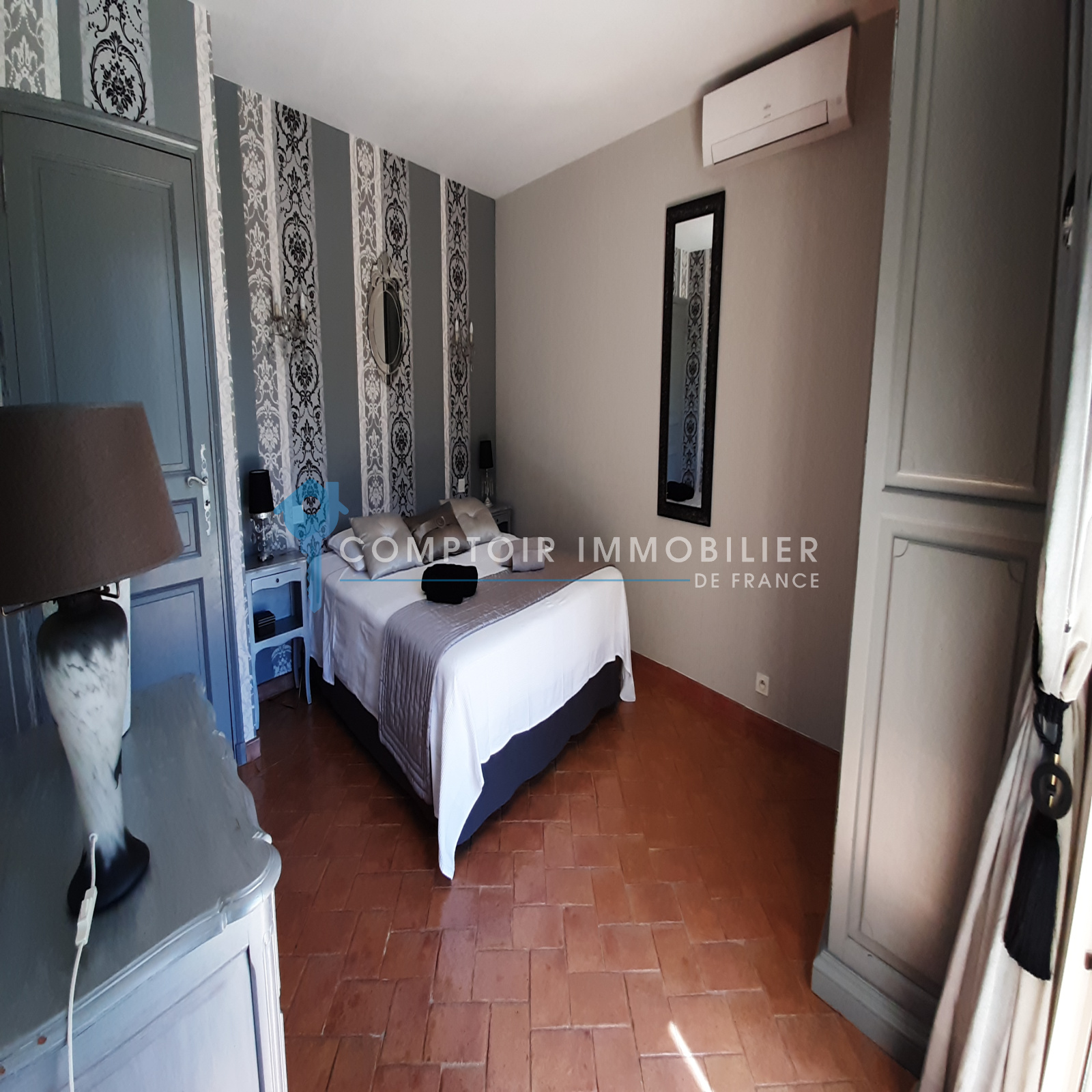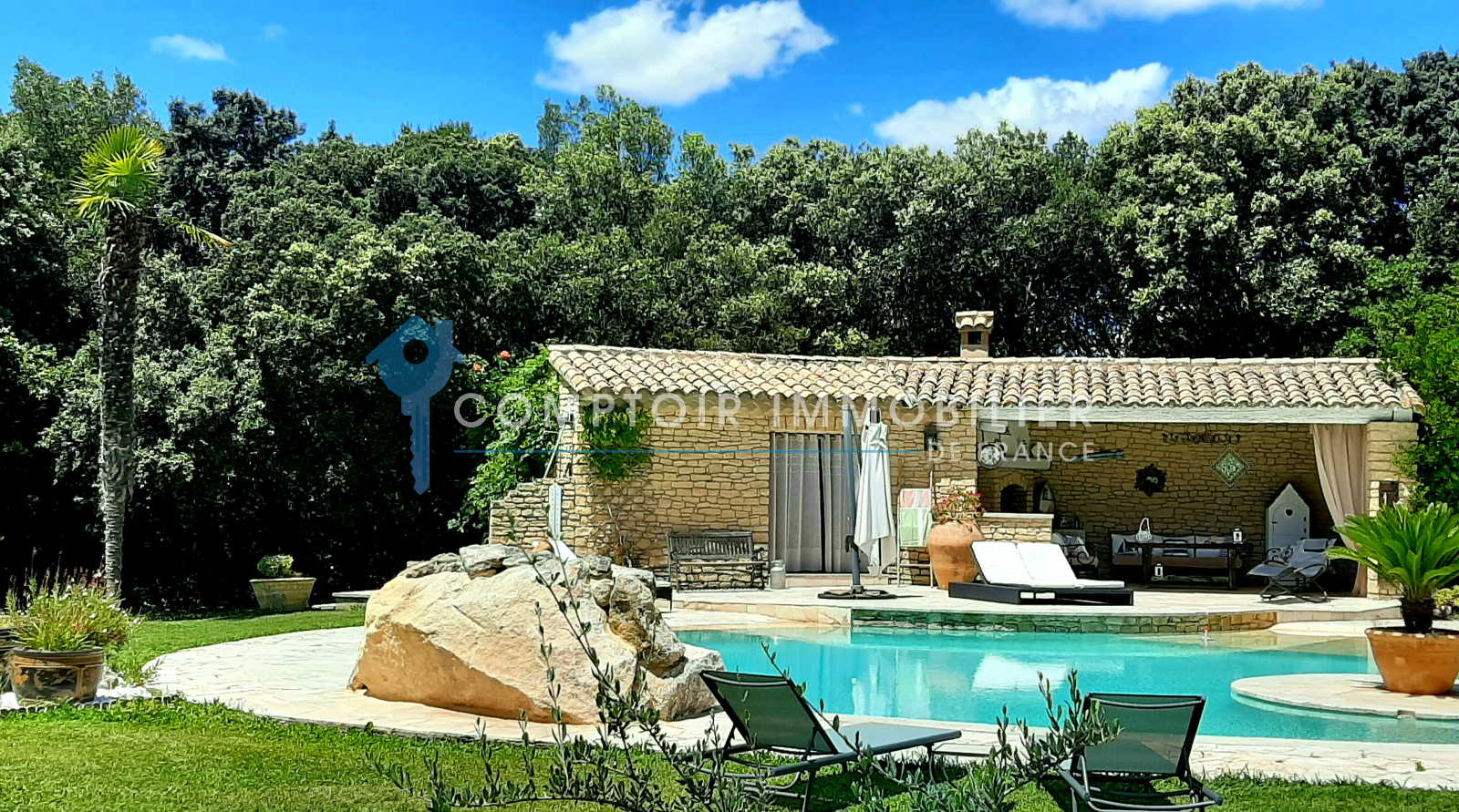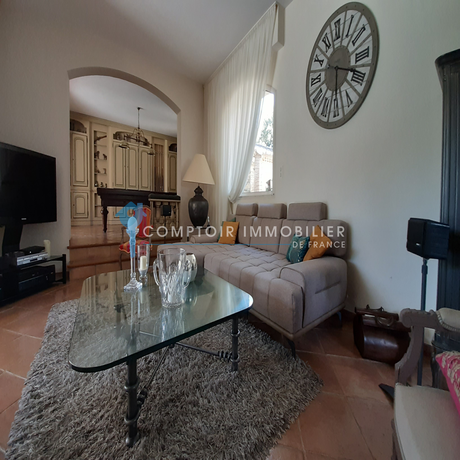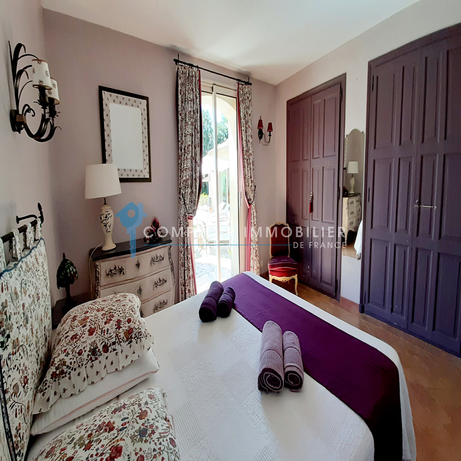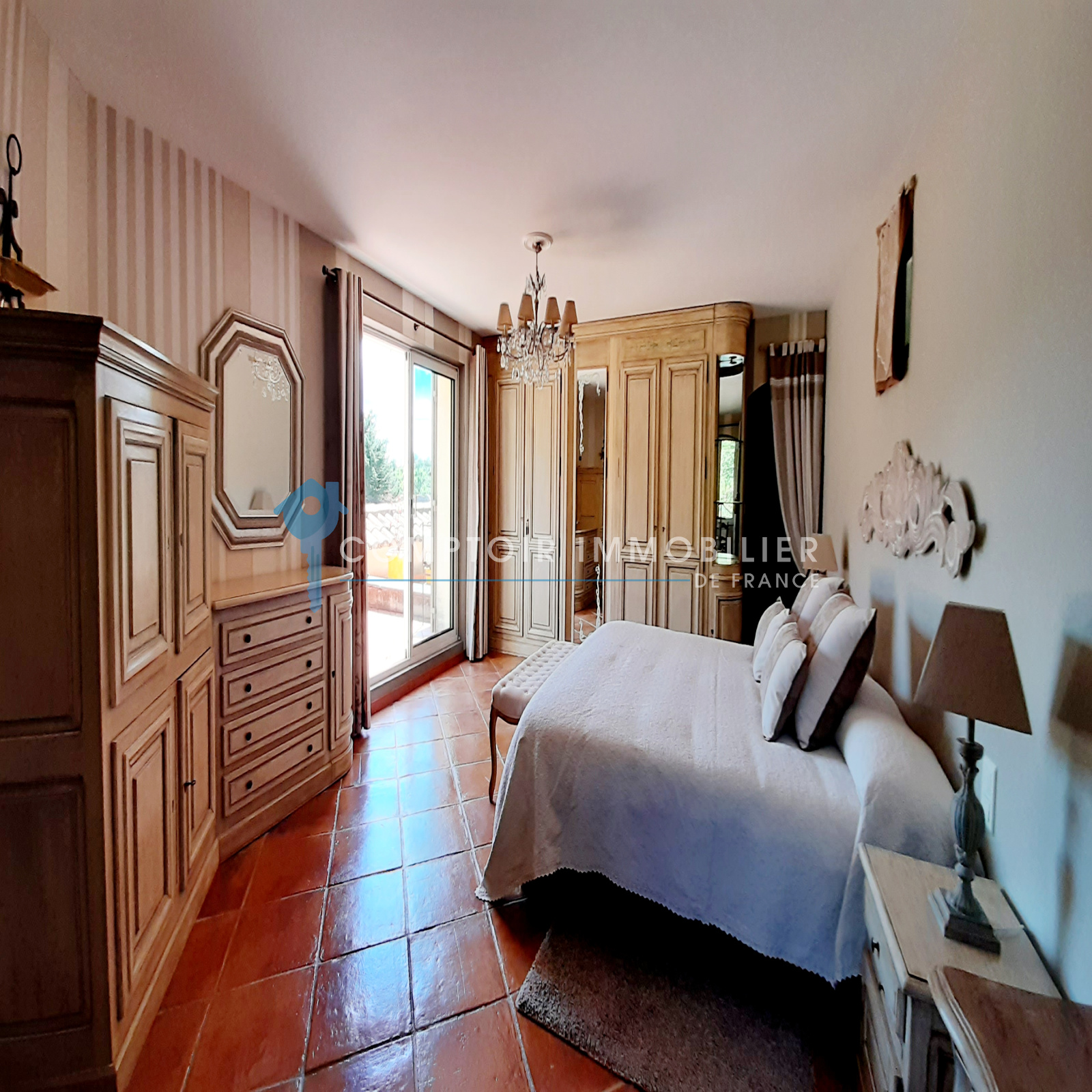 La maison comprend une entrée avec bureau et piano, une cuisine équipée, un salon avec TV et cheminée, un salon bibliothèque avec billard, une salle à manger, et une buanderie. Quatre chambres doubles, une salle d'eau, une salle de bain, et deux toilettes sont au rez-de-chaussée. À l'étage, une suite parentale climatisée avec terrasse surplombe la piscine et le jardin.