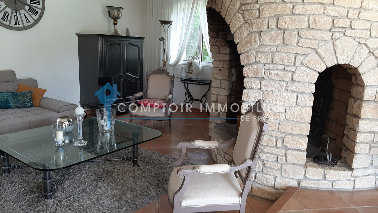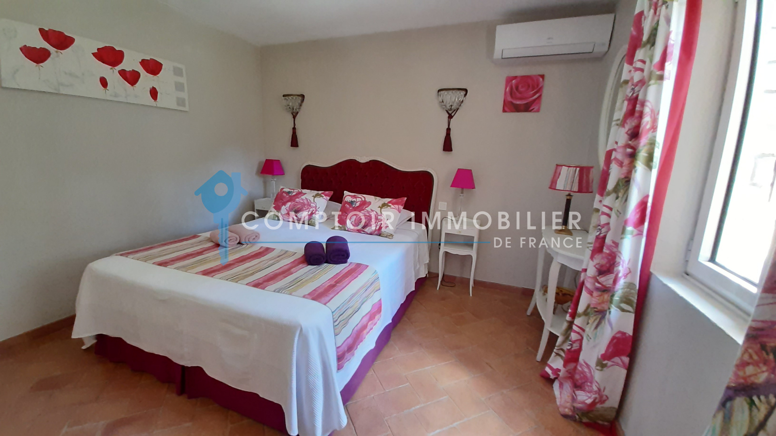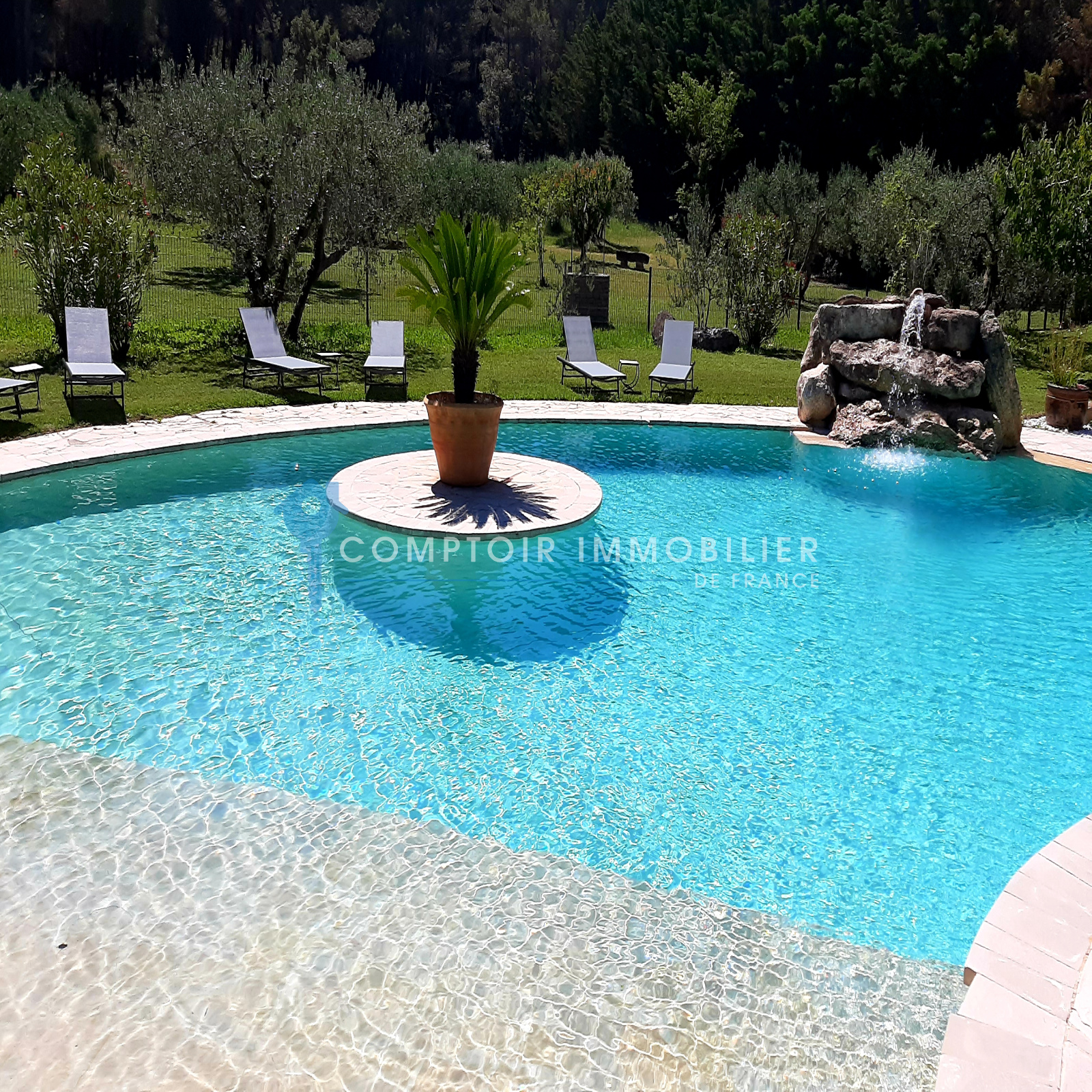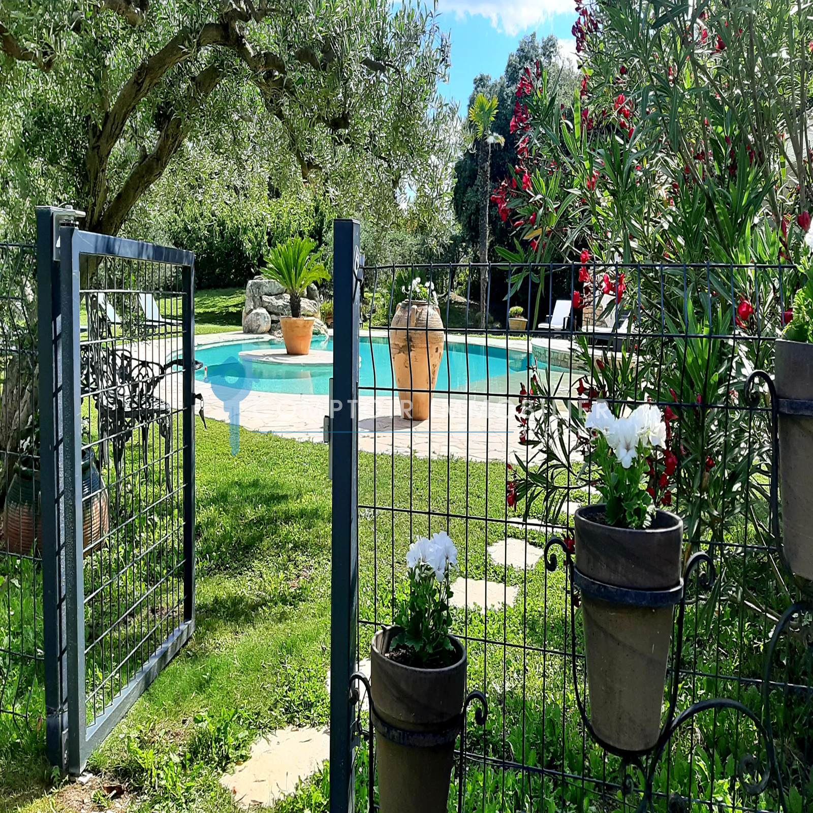 La maison comprend une entrée avec bureau et piano, une cuisine équipée, un salon avec TV et cheminée, un salon bibliothèque avec billard, une salle à manger, et une buanderie. Quatre chambres doubles, une salle d'eau, une salle de bain, et deux toilettes sont au rez-de-chaussée. À l'étage, une suite parentale climatisée avec terrasse surplombe la piscine et le jardin.