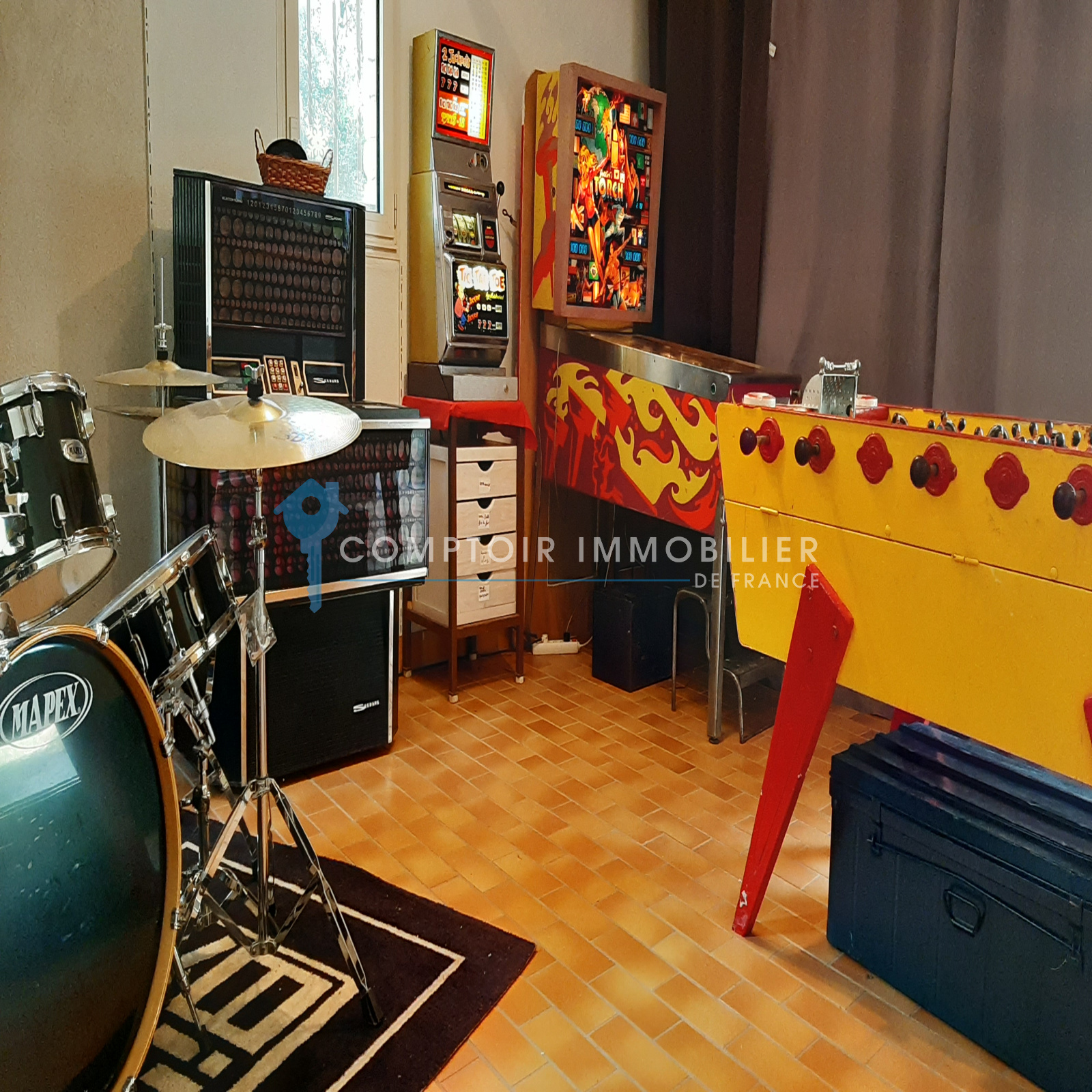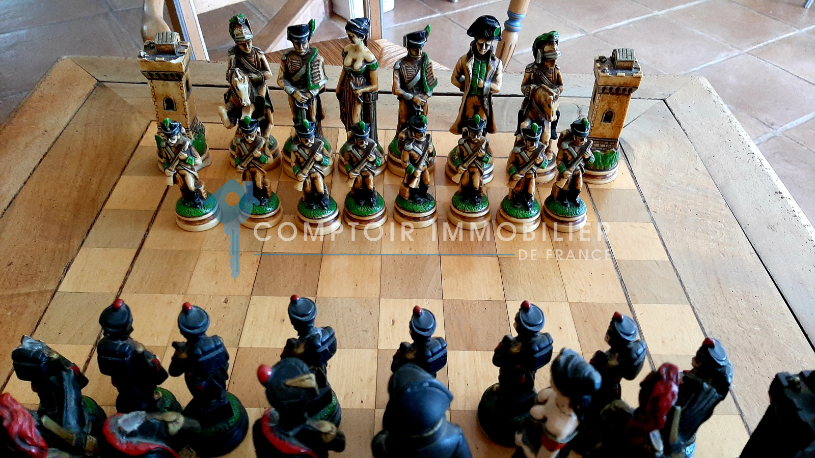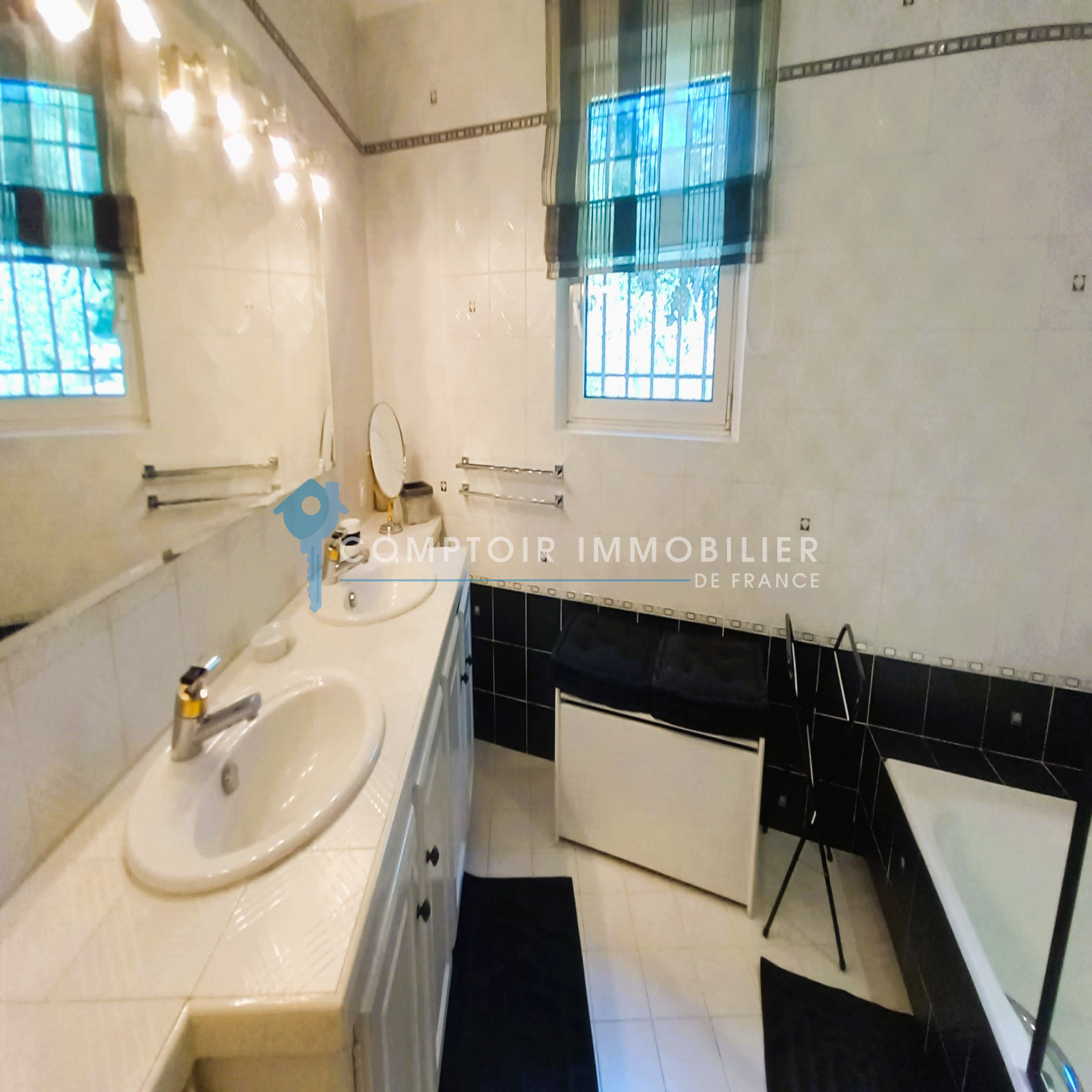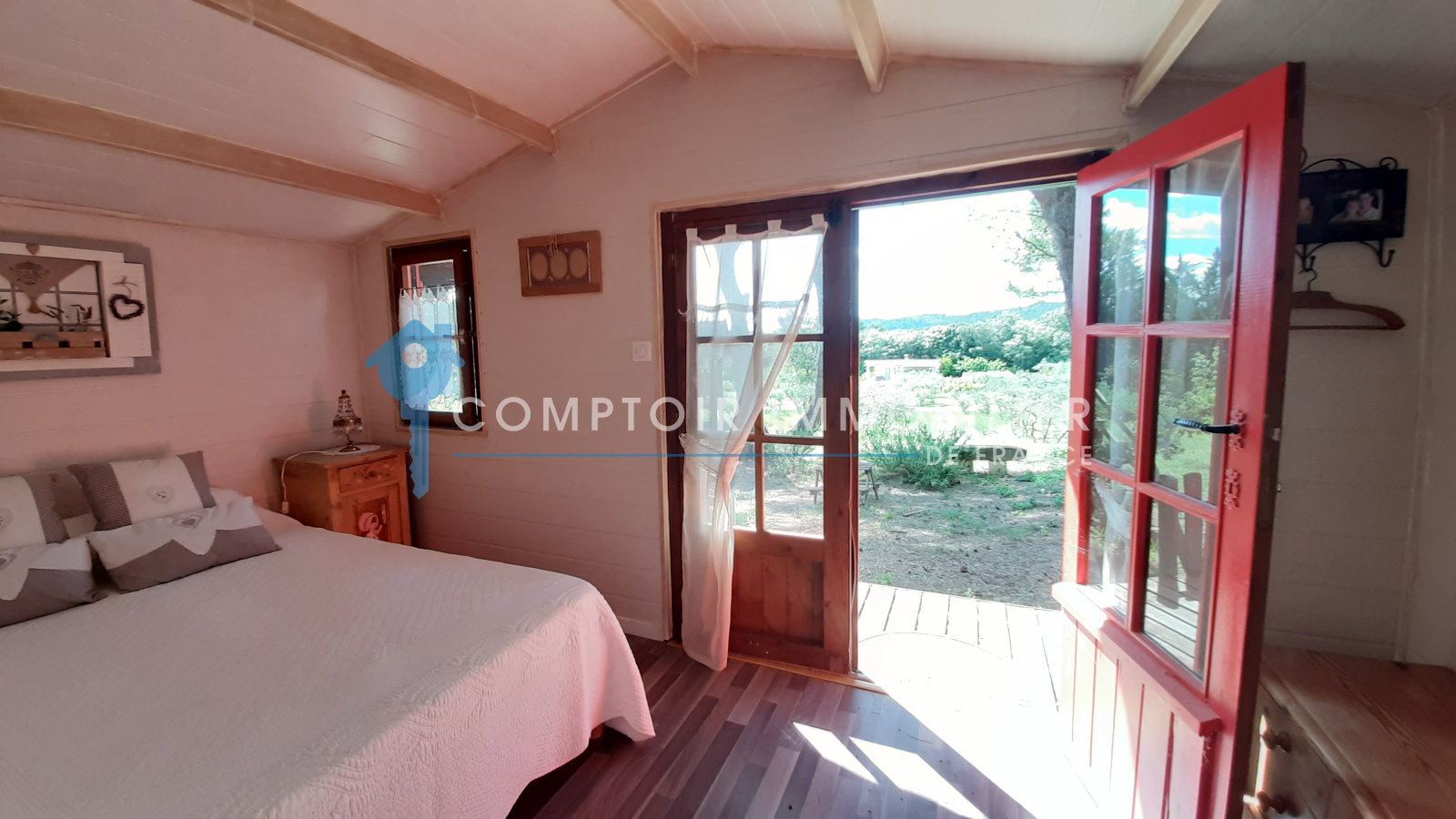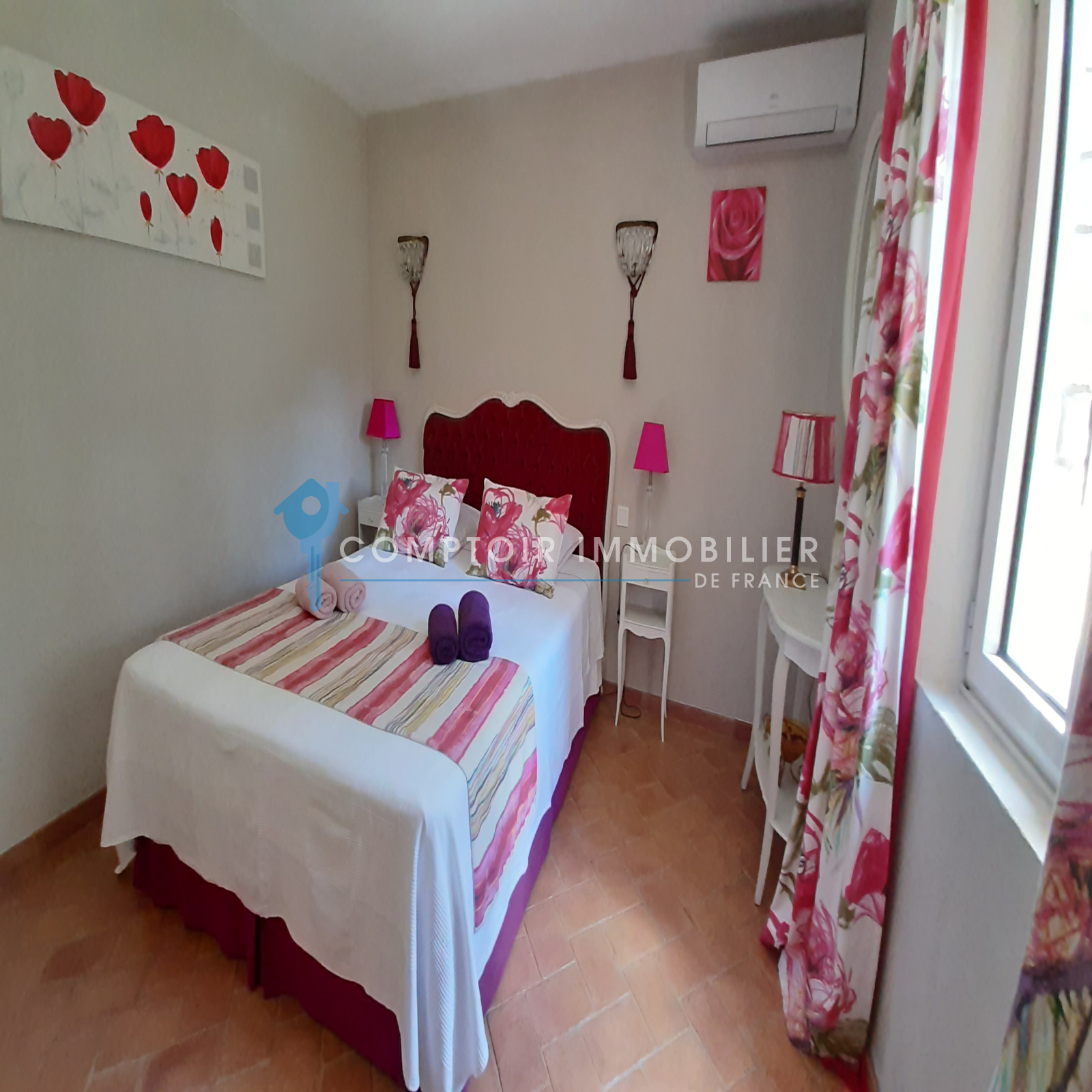 La maison comprend une entrée avec bureau et piano, une cuisine équipée, un salon avec TV et cheminée, un salon bibliothèque avec billard, une salle à manger, et une buanderie. Quatre chambres doubles, une salle d'eau, une salle de bain, et deux toilettes sont au rez-de-chaussée. À l'étage, une suite parentale climatisée avec terrasse surplombe la piscine et le jardin.
