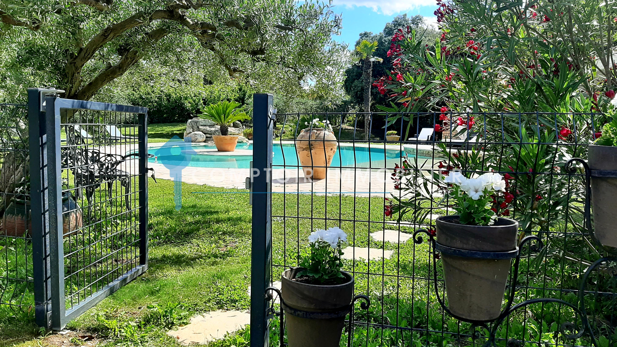 Implantée sur un domaine de 6 hectares, dont 2 hectares entièrement clos, la propriété est entourée de cyprès, d’oliviers et de pins, offrant un cadre naturel exceptionnel.