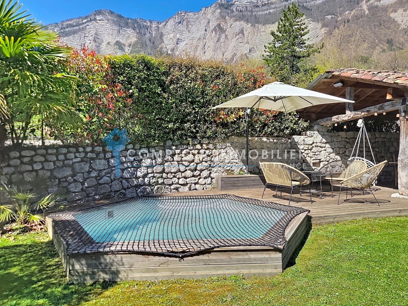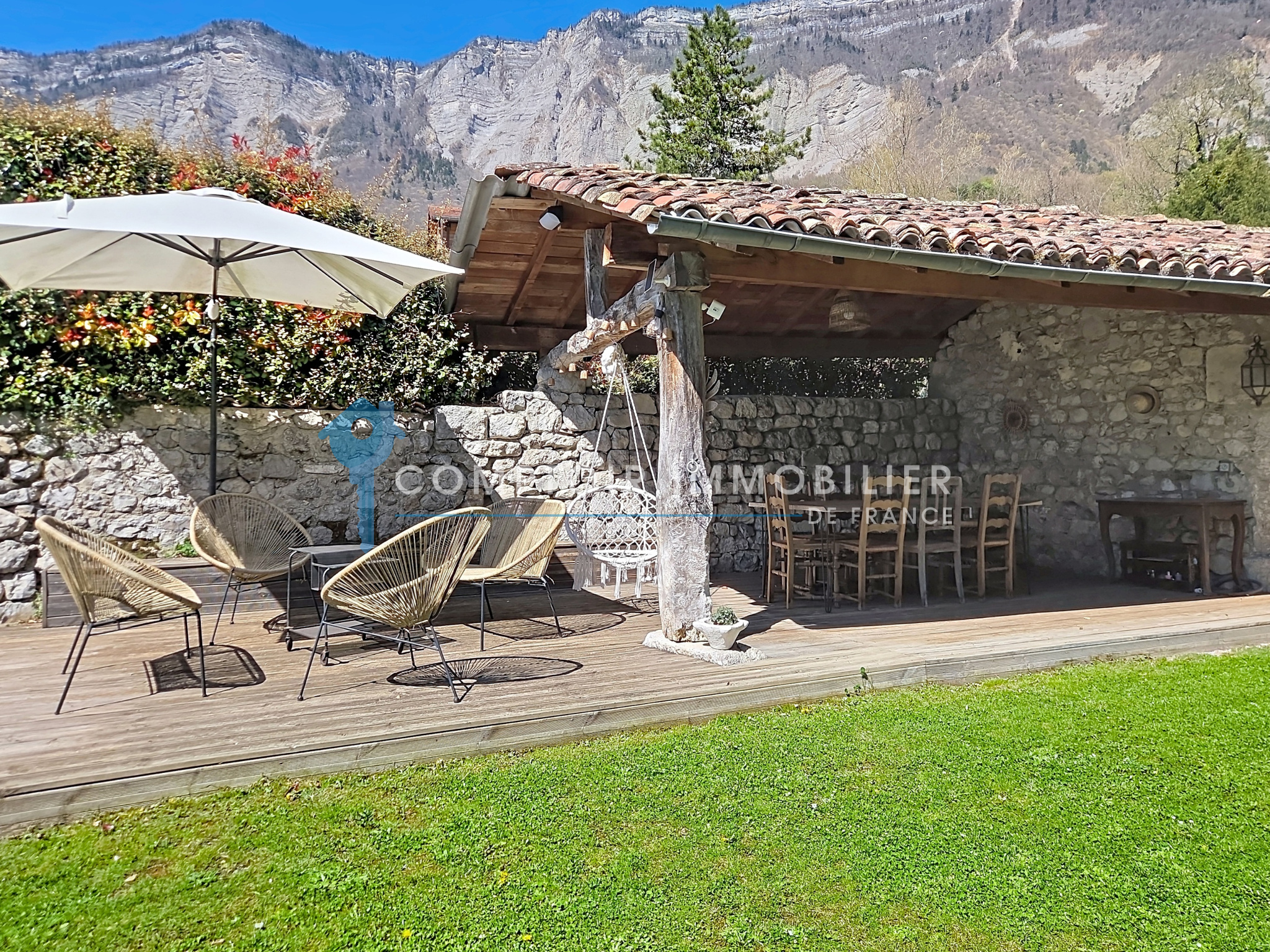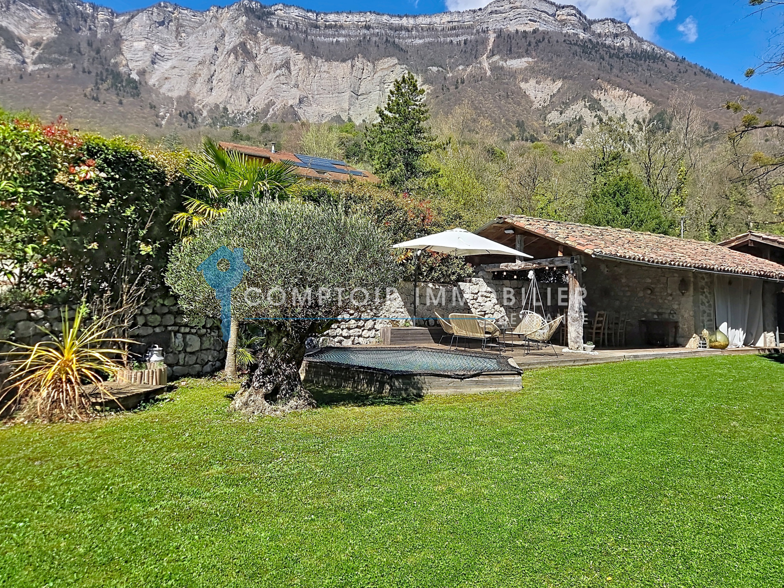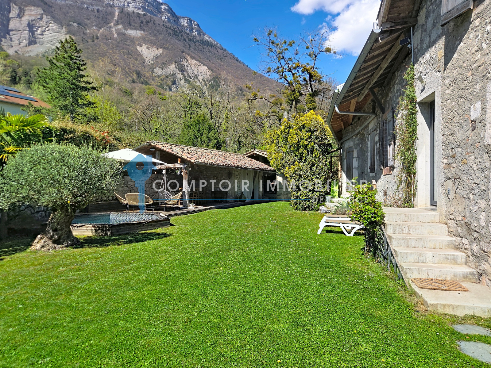 Maison T5 d’environ 128 m² habitables, louée meublée, construite sur 3 niveaux dans les années 1850 et entièrement rénovée en 2016, sur une parcelle close d’environ 400 m², bénéficiant d’une exposition Sud-Ouest et d’une vue imprenable sur la Chartreuse.
