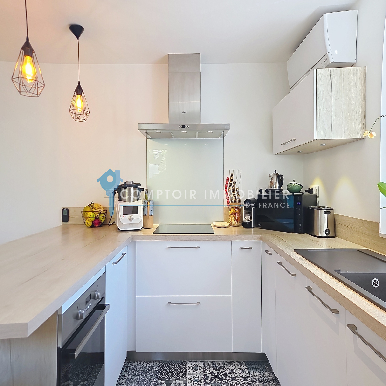 Elle se compose au rez-de-chaussée d’une entrée avec rangements et d’une pièce de vie de 35 m² intégrant une cuisine ouverte équipée Schmidt, un espace salle à manger et un séjour.