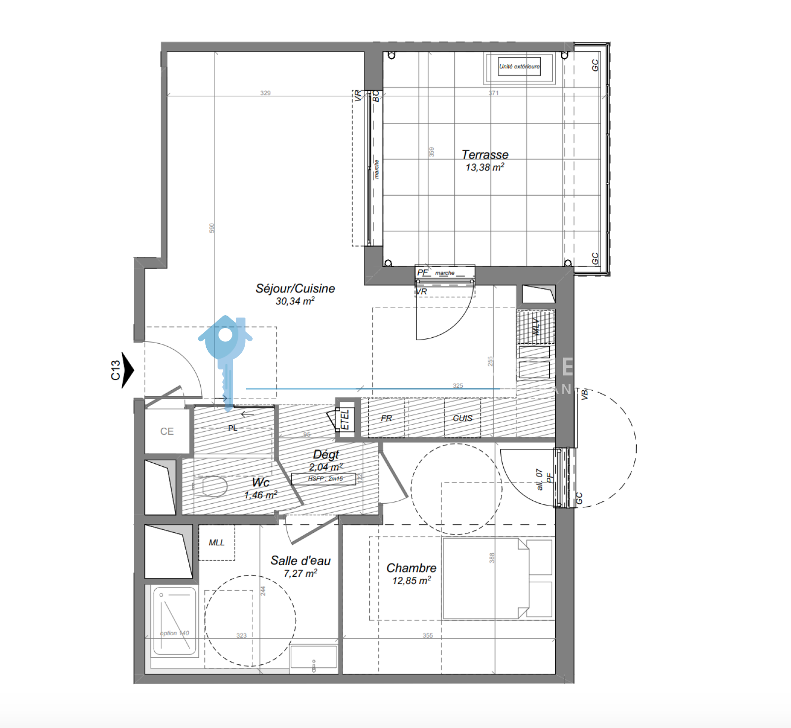 Prestations: Climatisation reversible gainable, cuisine entièrement équipée (sauf le frigo), placards, porte d'entrée sécurisée, terrasse profonde, ascenseur, dernières normes thermiques et phoniques...