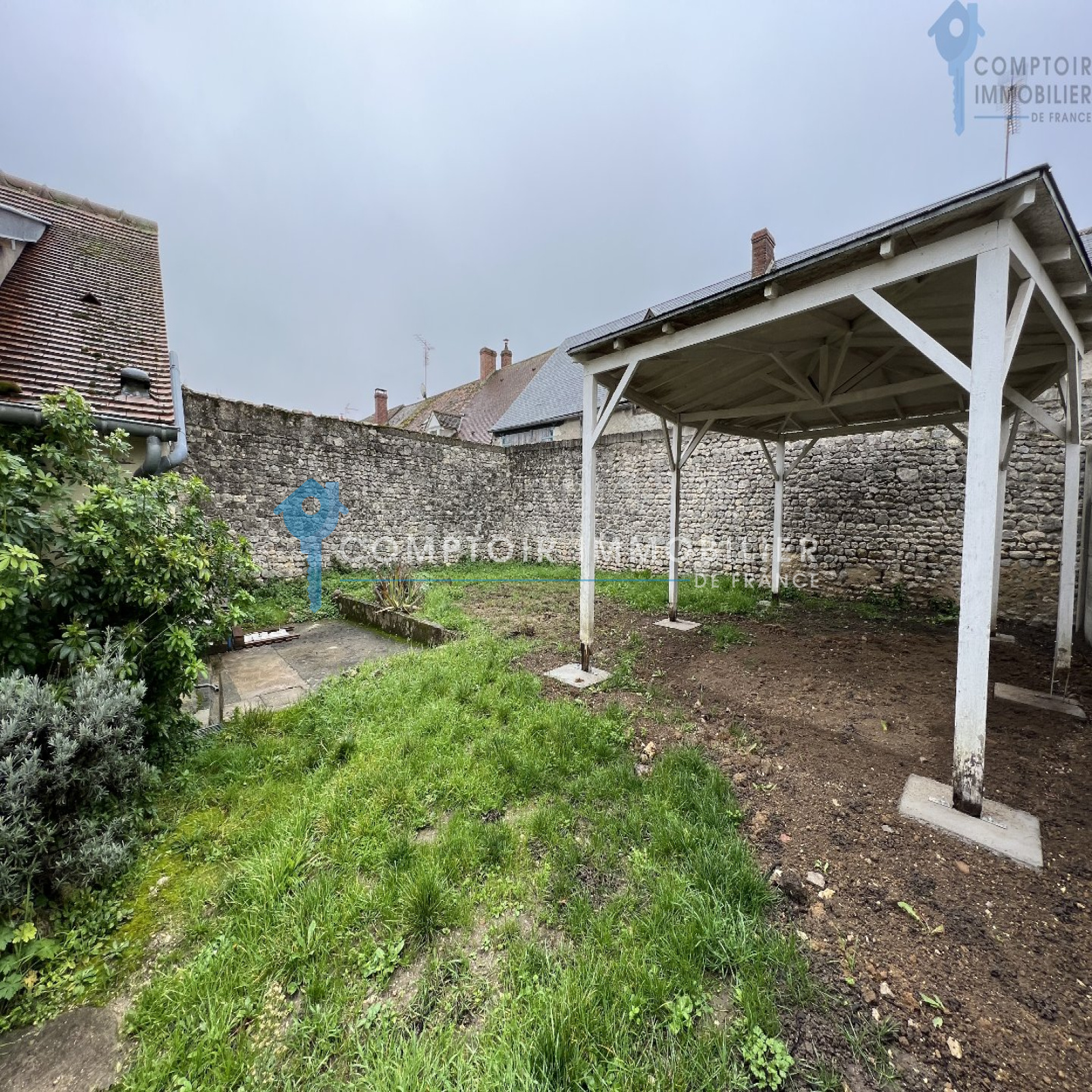Un jardin agréable avec pergola, idéal pour profiter des beaux jours et des repas d'été et une allée gravillonner pour le stationnement de votre véhicule.