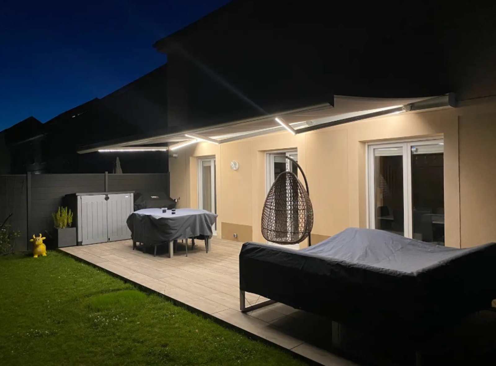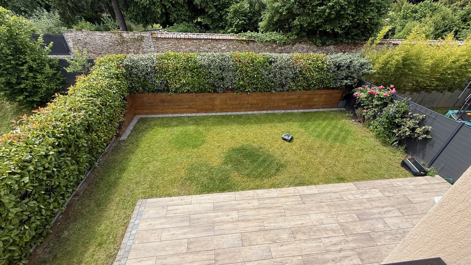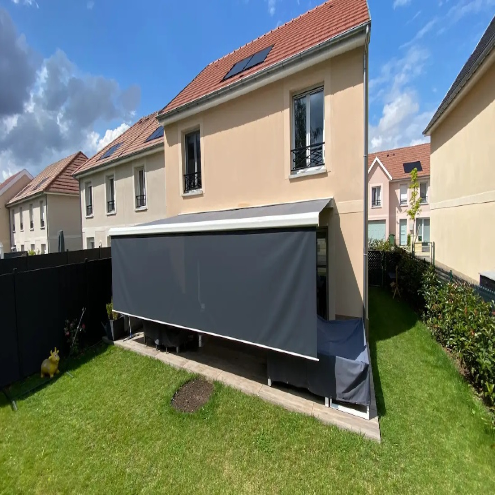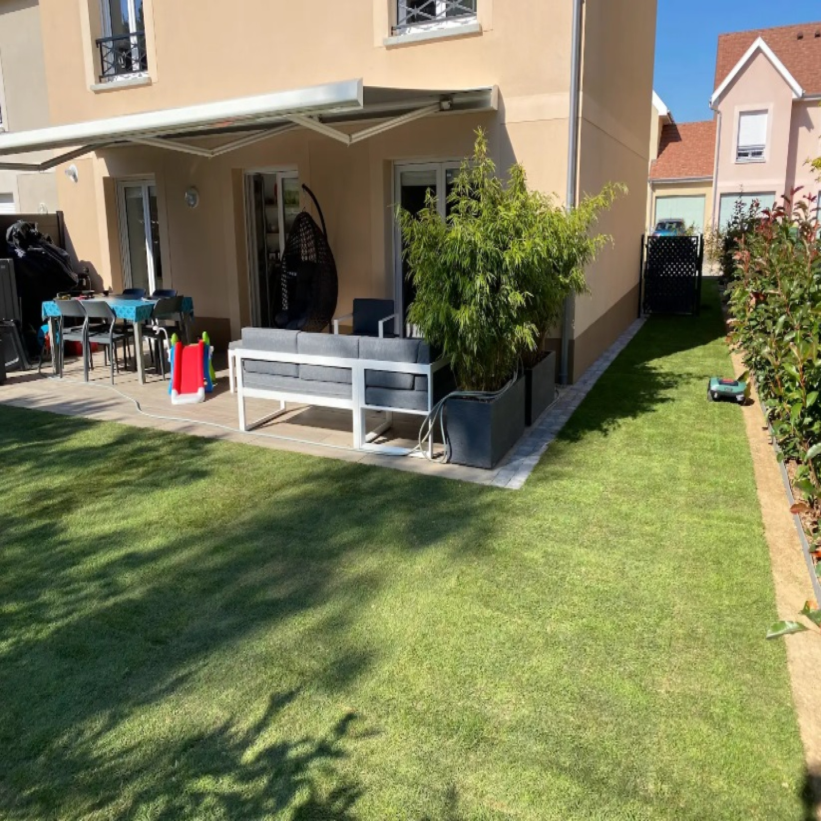 A l'extérieur, vous beneficierez de deux places de stationnement devant la maison ainsi que d'un agréable jardin clos avec terrasse et store banne automatique.