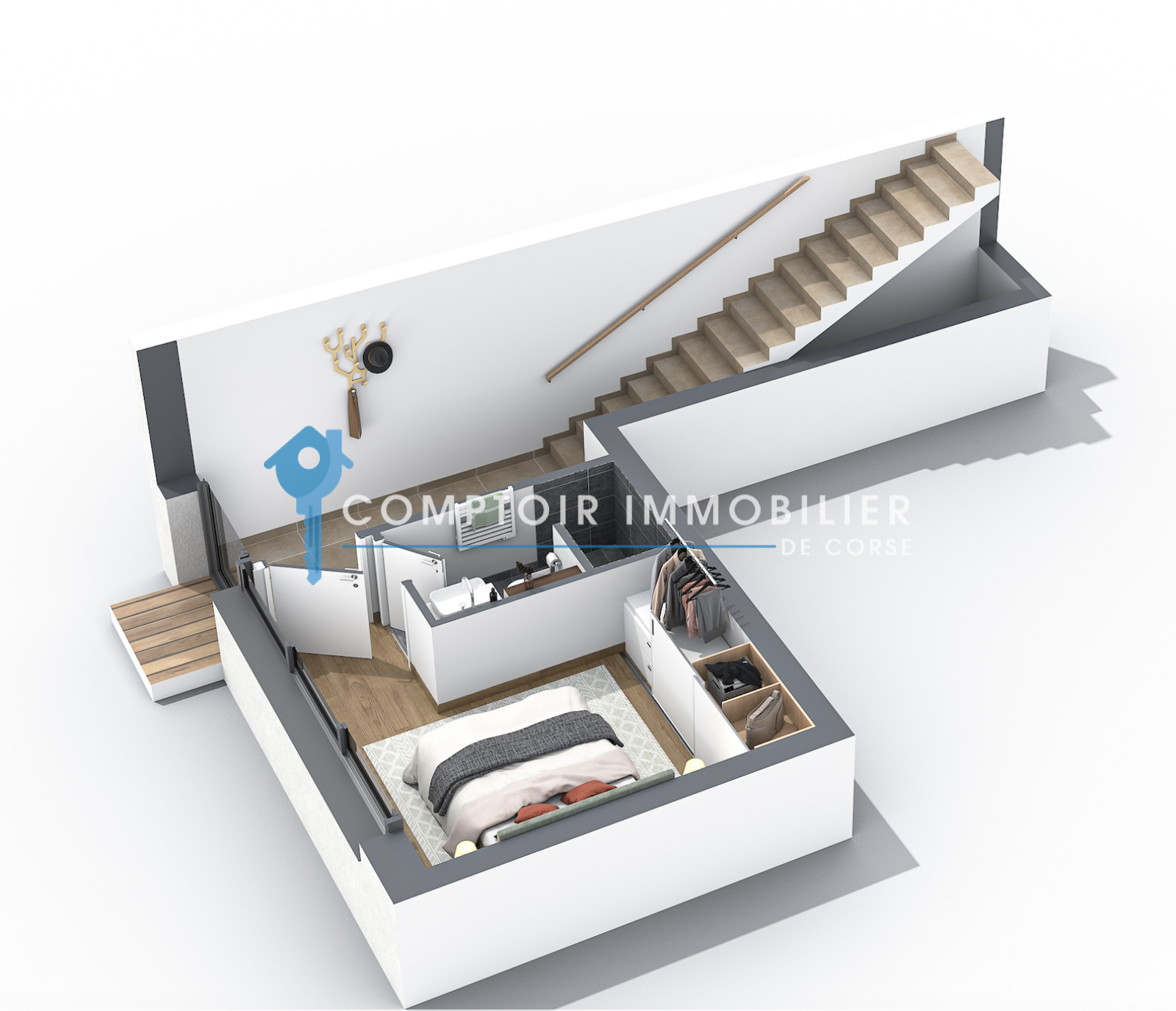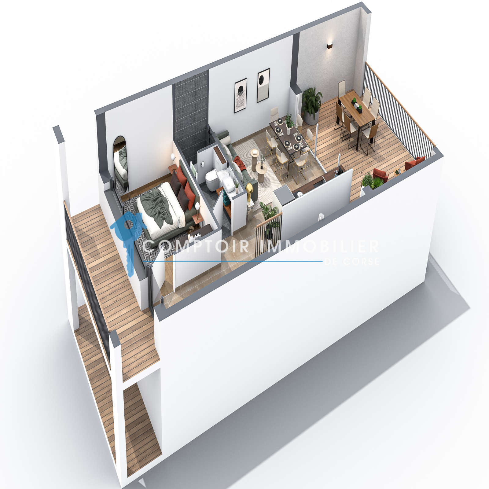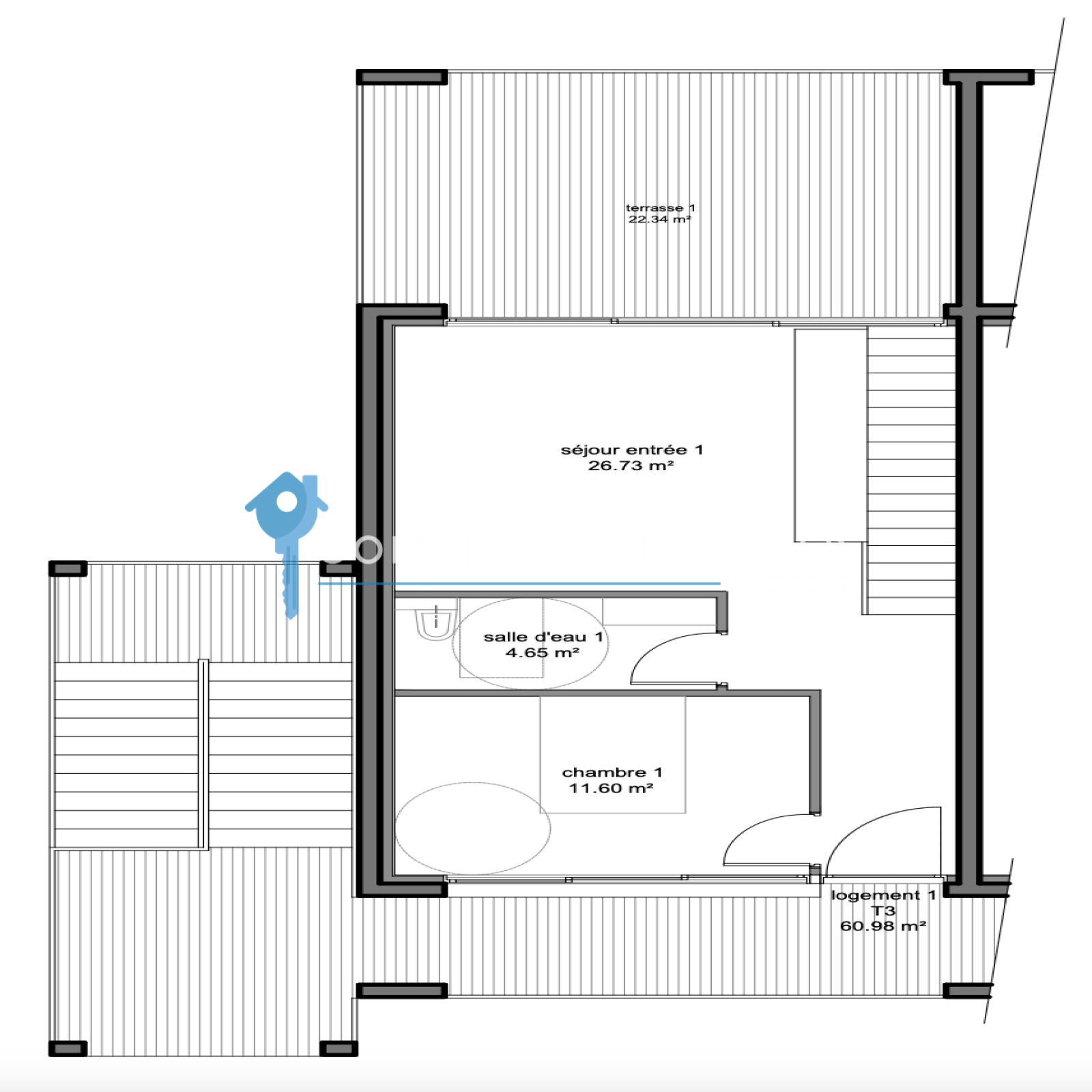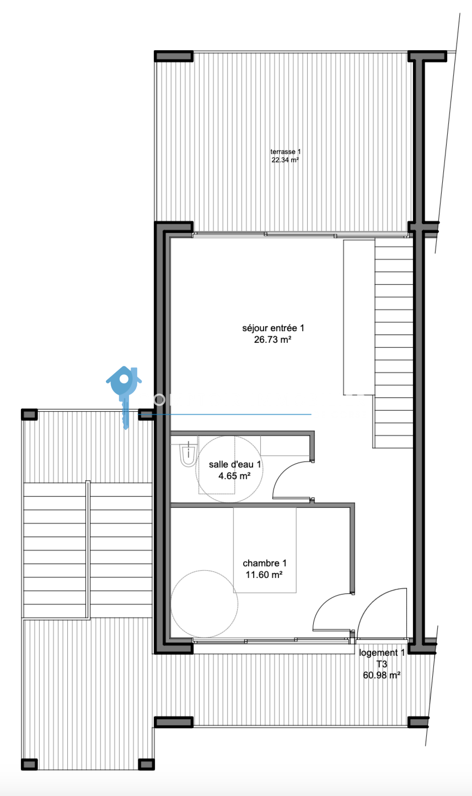 Vente d’un T3 de 60,98 m2 sur 2 niveaux avec terrasse de 22,34 m2 et jardin privatif de 83,72 m2