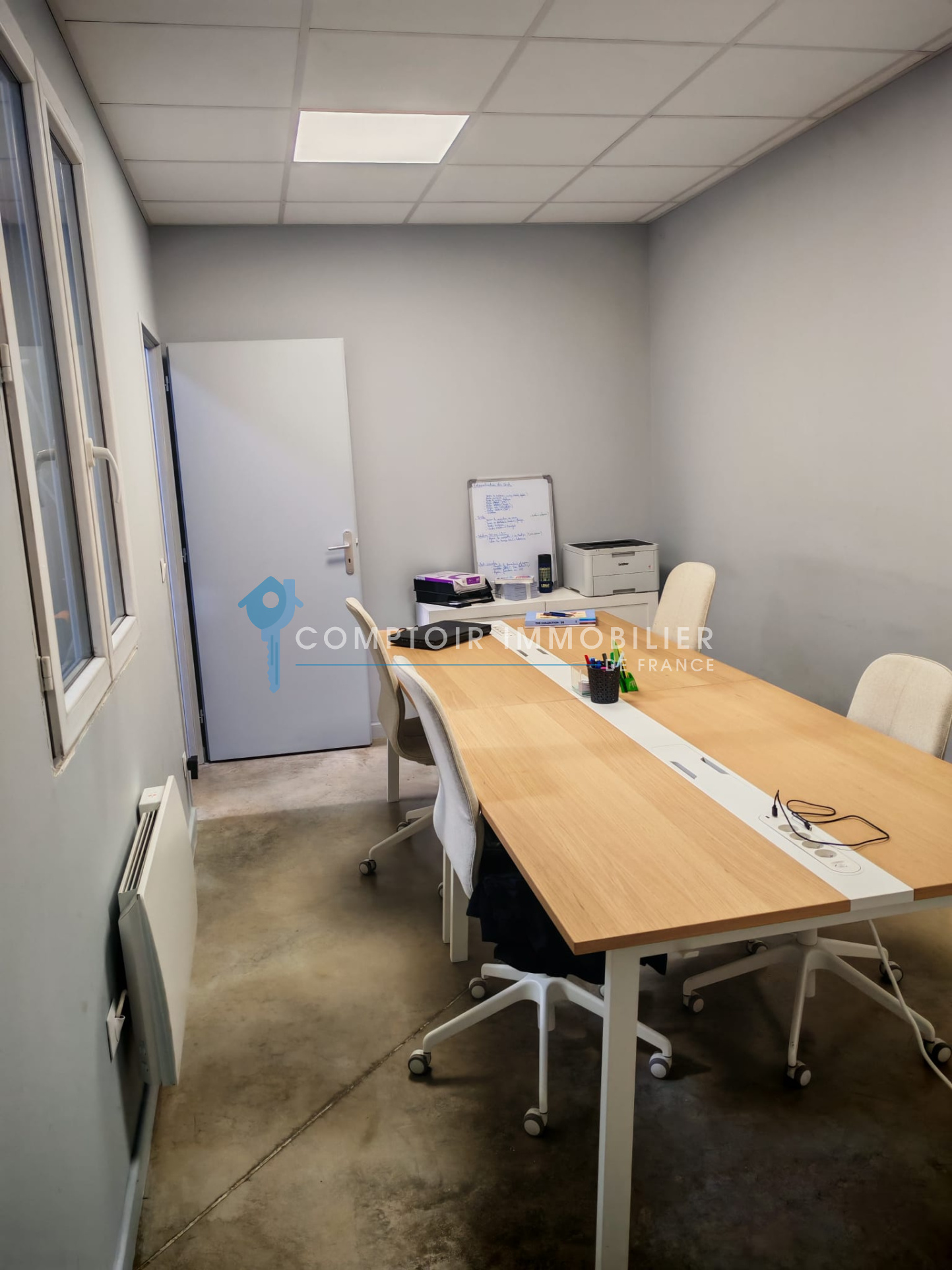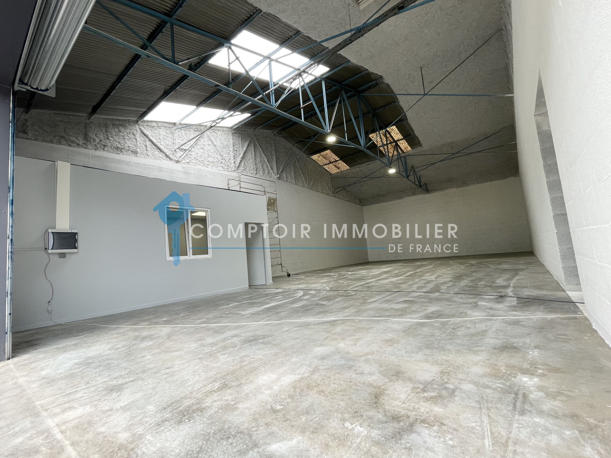 Plateau de 200 m² avec dalle quartz ultra-résistante, belle hauteur sous plafond, porte sectionnelle 4×4m, bureaux chauffés et isolés, sanitaires aux normes.