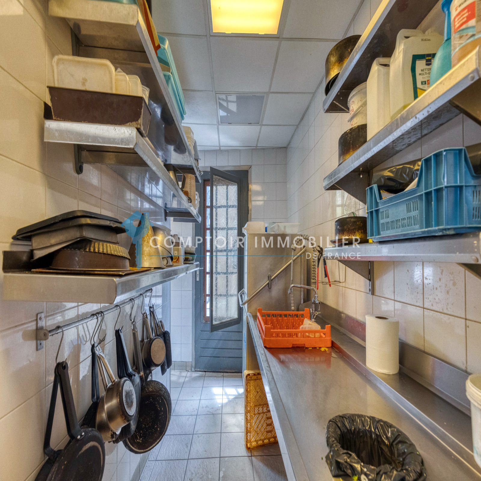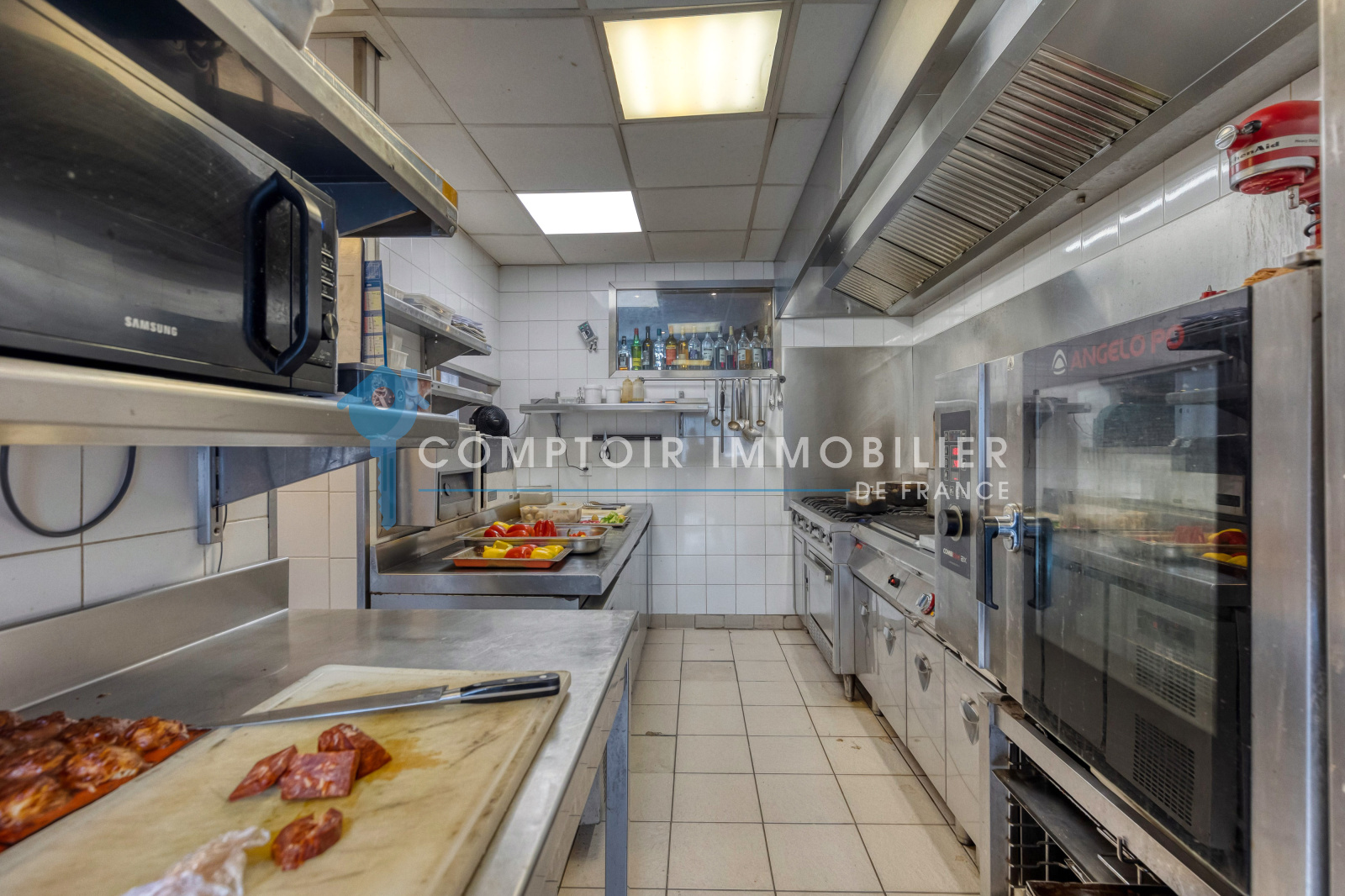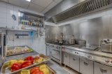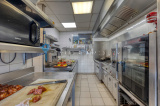 Une cuisine de 30 m2 avec tous ses équipements : ses 2 armoires réfrigérées, un congel, 1 piano à gaz 6 feux, 1 four, 1 plaque coupe feux, 1 machine sous vide, 1 kitchenette, 1 friteuse, 1 plancha et son coin Plonge .