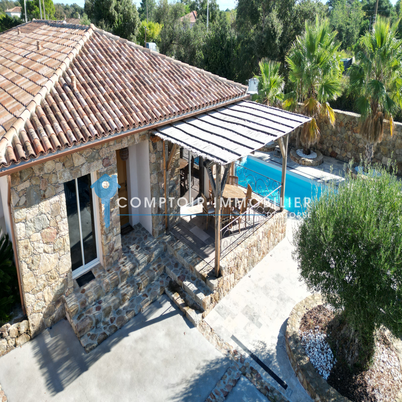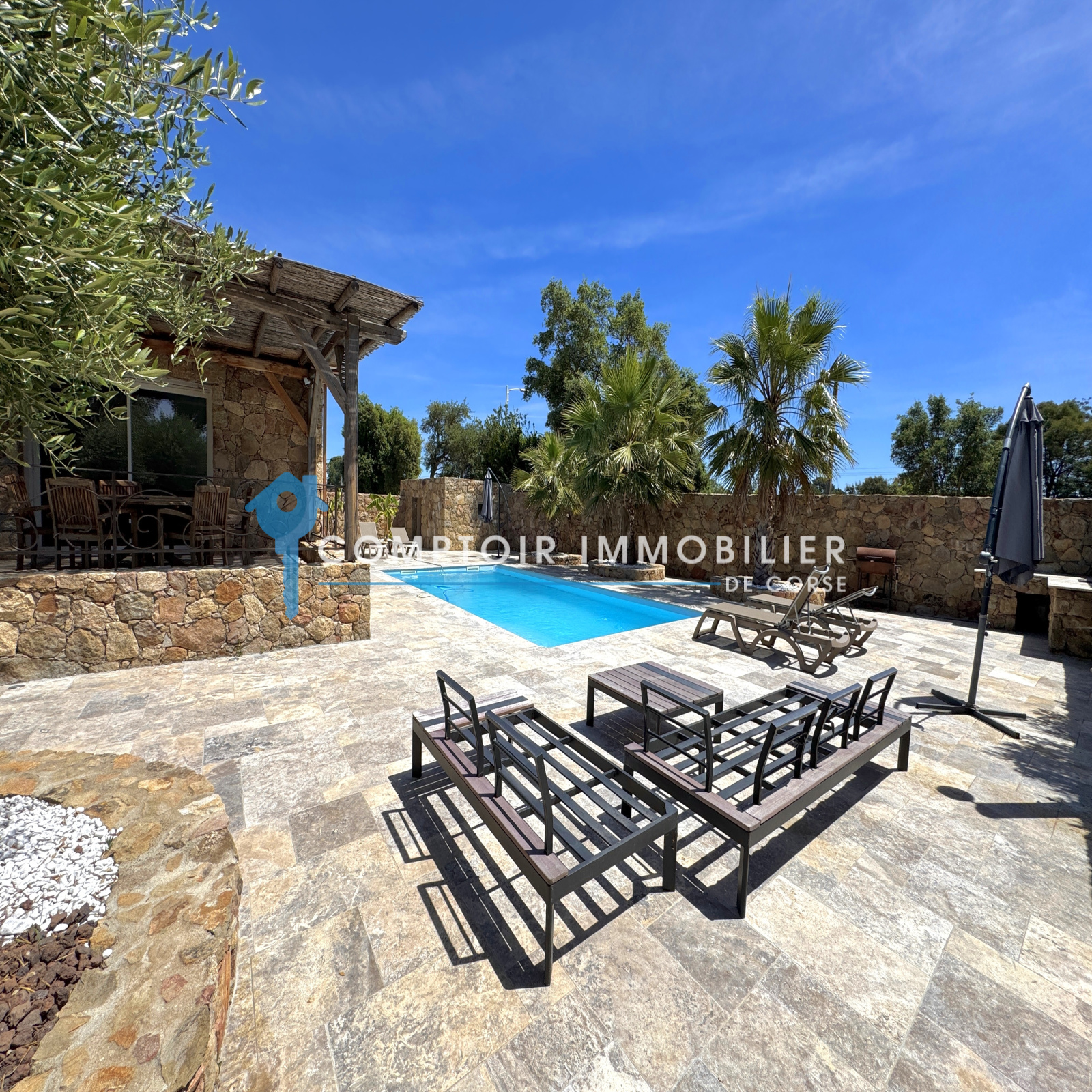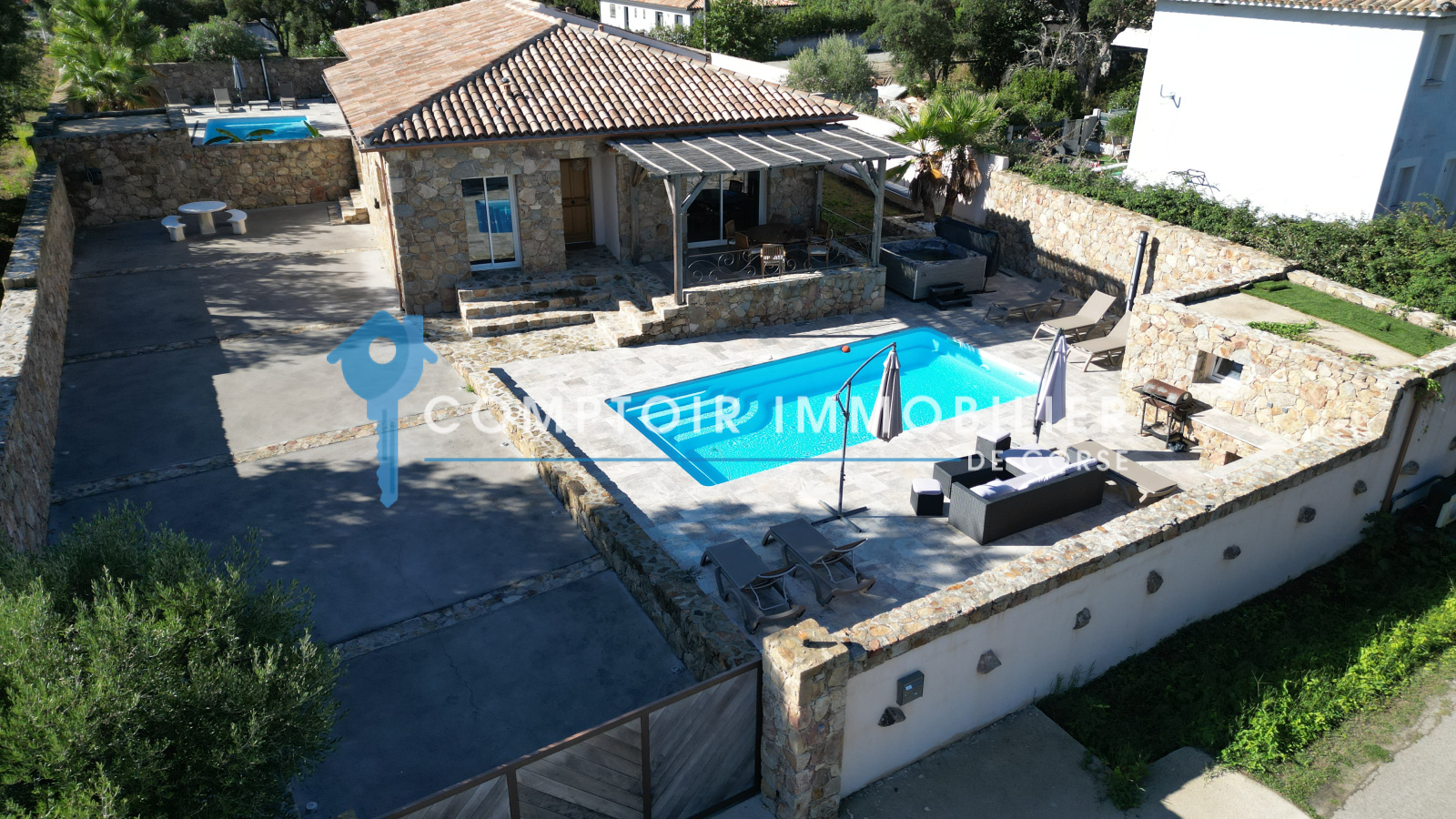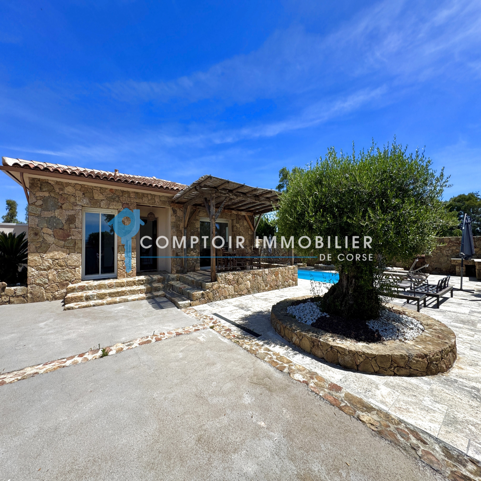 Cette villa T4 (3 chambres) de style bergerie d'une superficie habitable de 91 m2 habitable, habillée en pierres de taille sur une parcelle de 595 m2 non loin des premières plages, seulement 3 minutes en voiture de la plage de QUARCIONE.