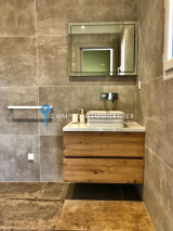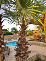 Piscine en coque polyester d'une superficie de 8x4 avec un système de traitement au sel et dotée d'une pompe à chaleur pour nager été comme hiver, entourée de 100 m2 de plage entierement carrelée et arborée avec goût.