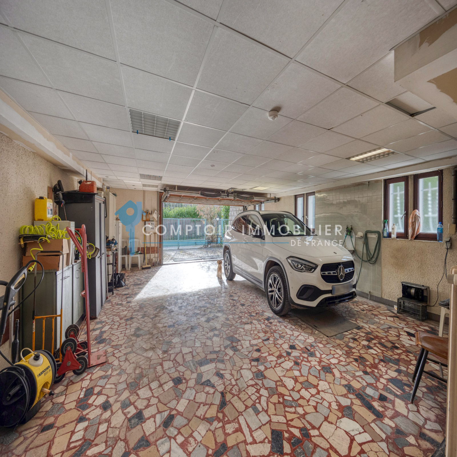 Avec 1 rez de chaussée comprenant 1 grand garage double de 67 m2 avec porte électrique, 1 cellier de 7 m2, 1 chaufferie de 9m2 avec chaudière au gaz avec condensation changée en 2023, 1 atelier de 24 m2 ,1 belle cave a vins de 13m2 et un appartement indépendant T2 de 47 m2 avec une cuisine séparée , 1 bureau, 1 chambre et 1 salle d'eau avec wc.Idéal pour une profession libérale!