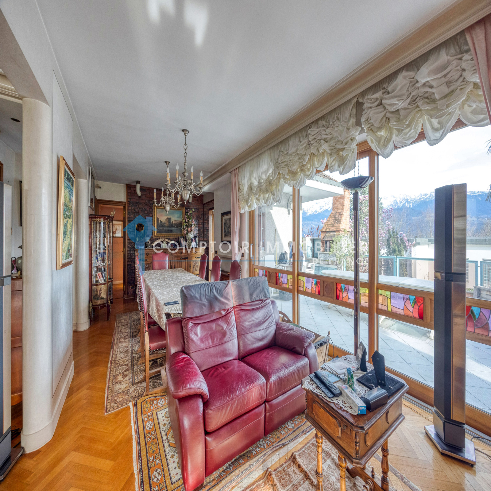 Au 1er étage : Une vaste pièce de vie (salon salle à manger) de 61 m2 avec 2 cheminées + cuisine séparée s'ouvrant sur de larges baies vitrées coulissantes sur une superbe terrasse avec four à pizza offrant une vue panoramique sur le massif de Belledonne. Deux suites parentales dont une avec grand dressing .
