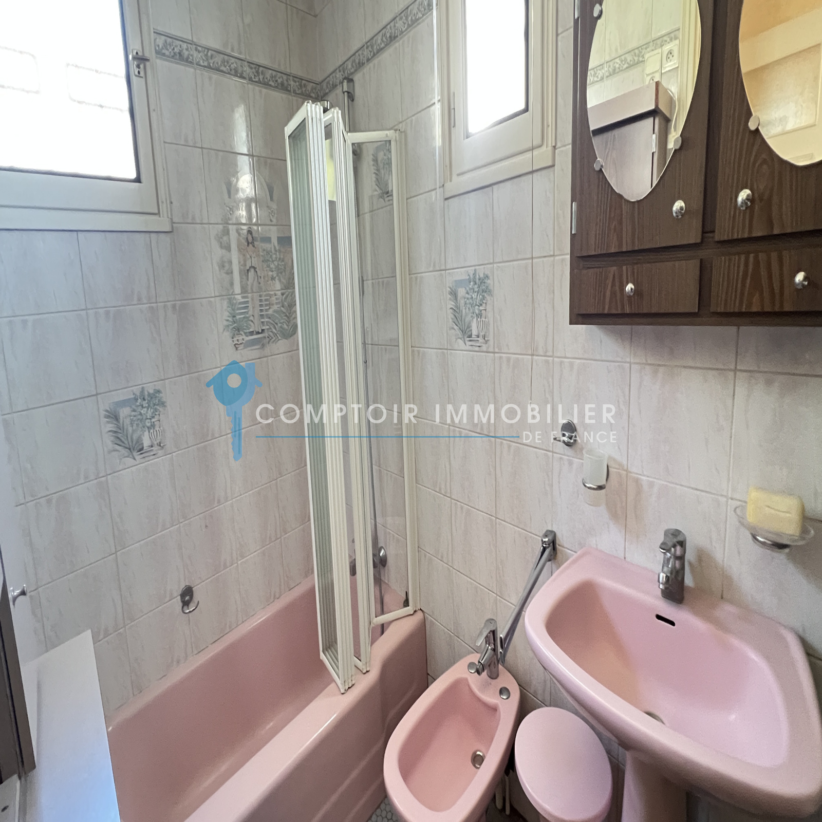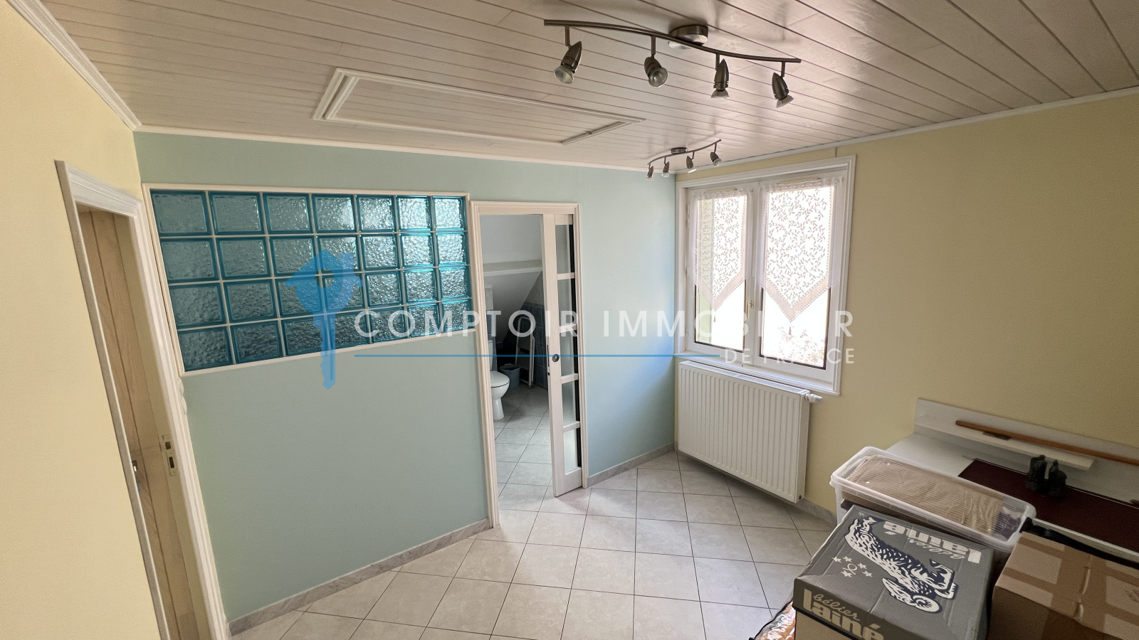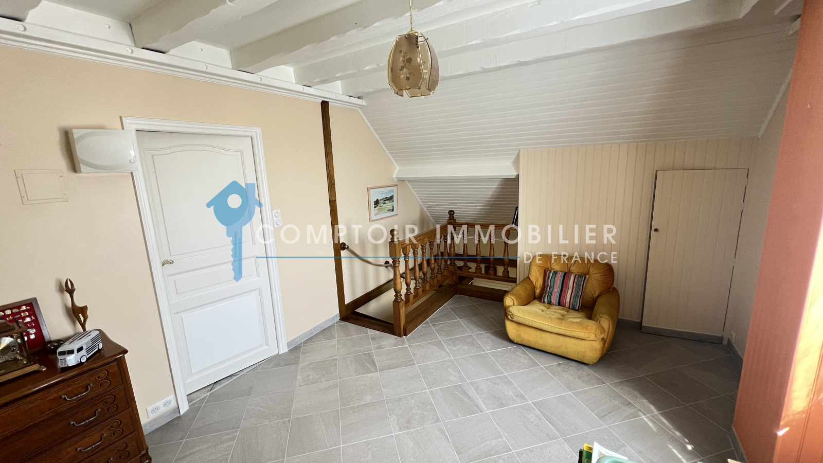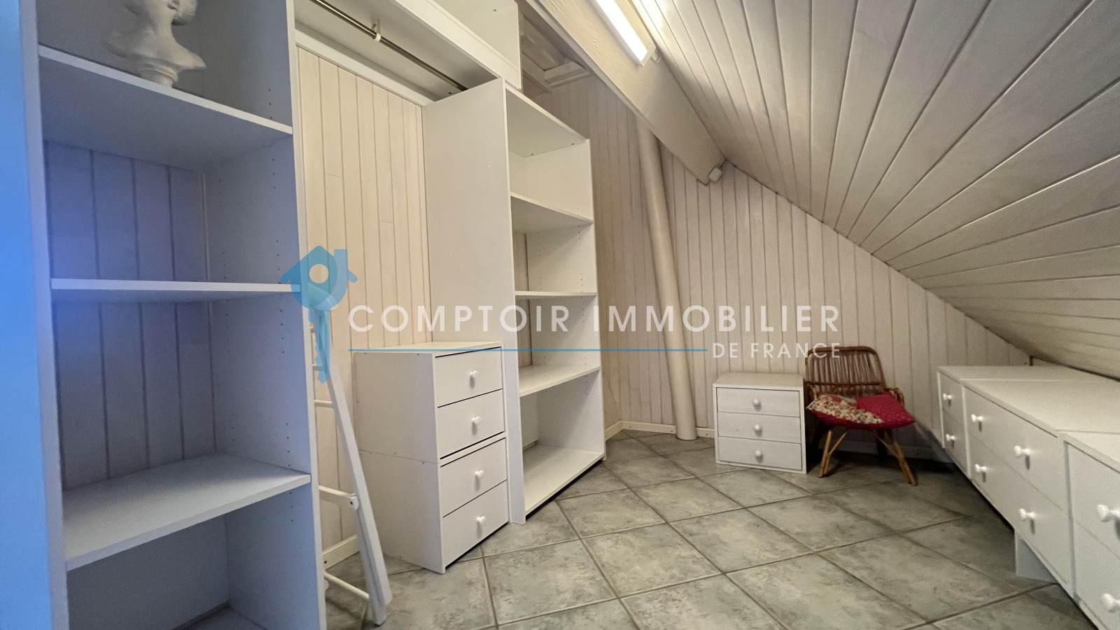 A l'étage : grande pièce palière, deux chambres dont avec sa salle de bains. Nombreux rangements en sous-pente