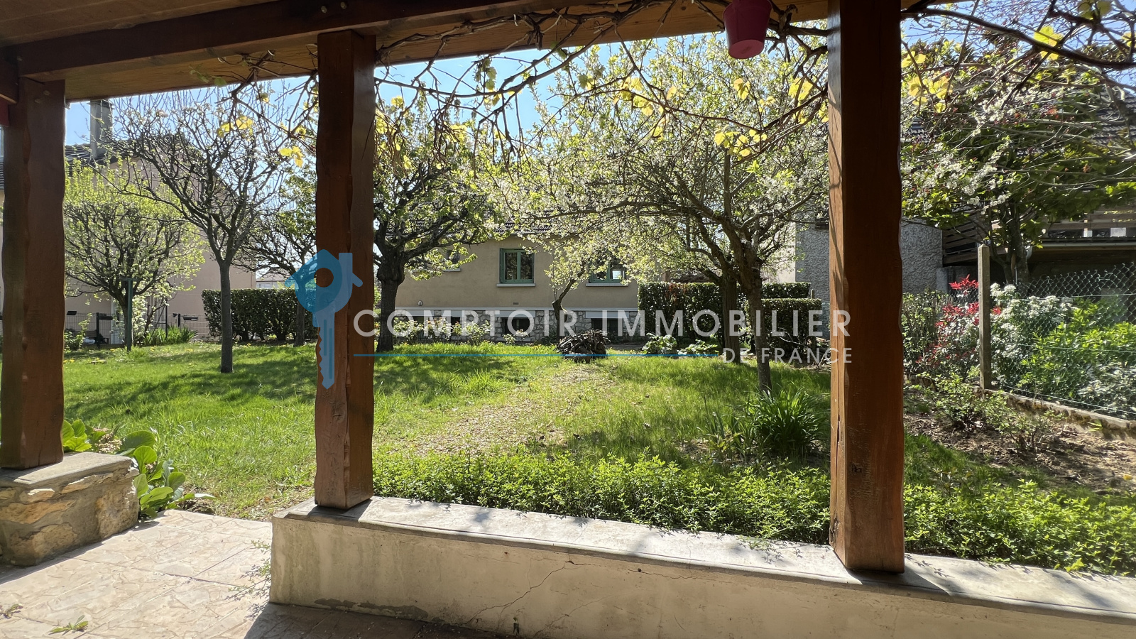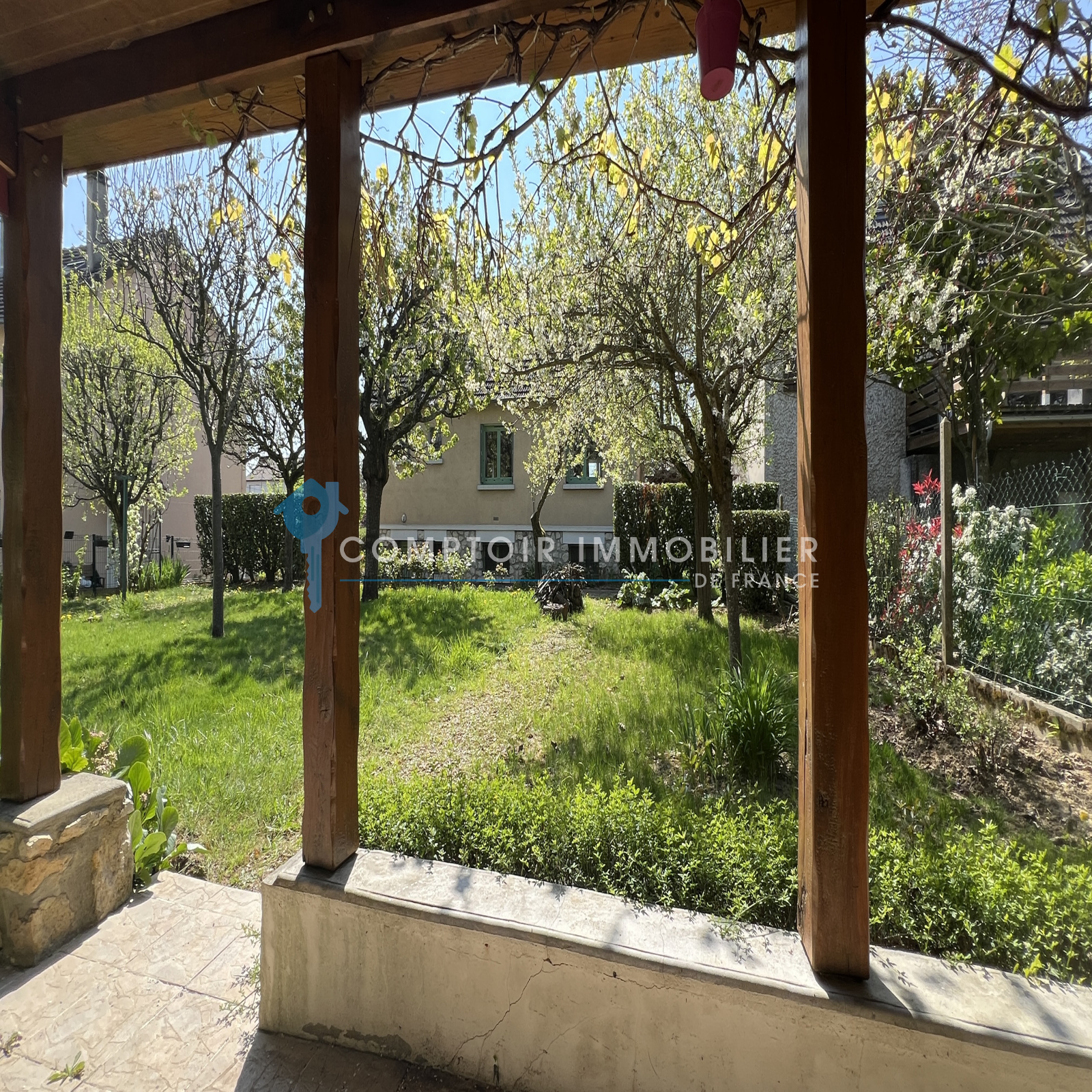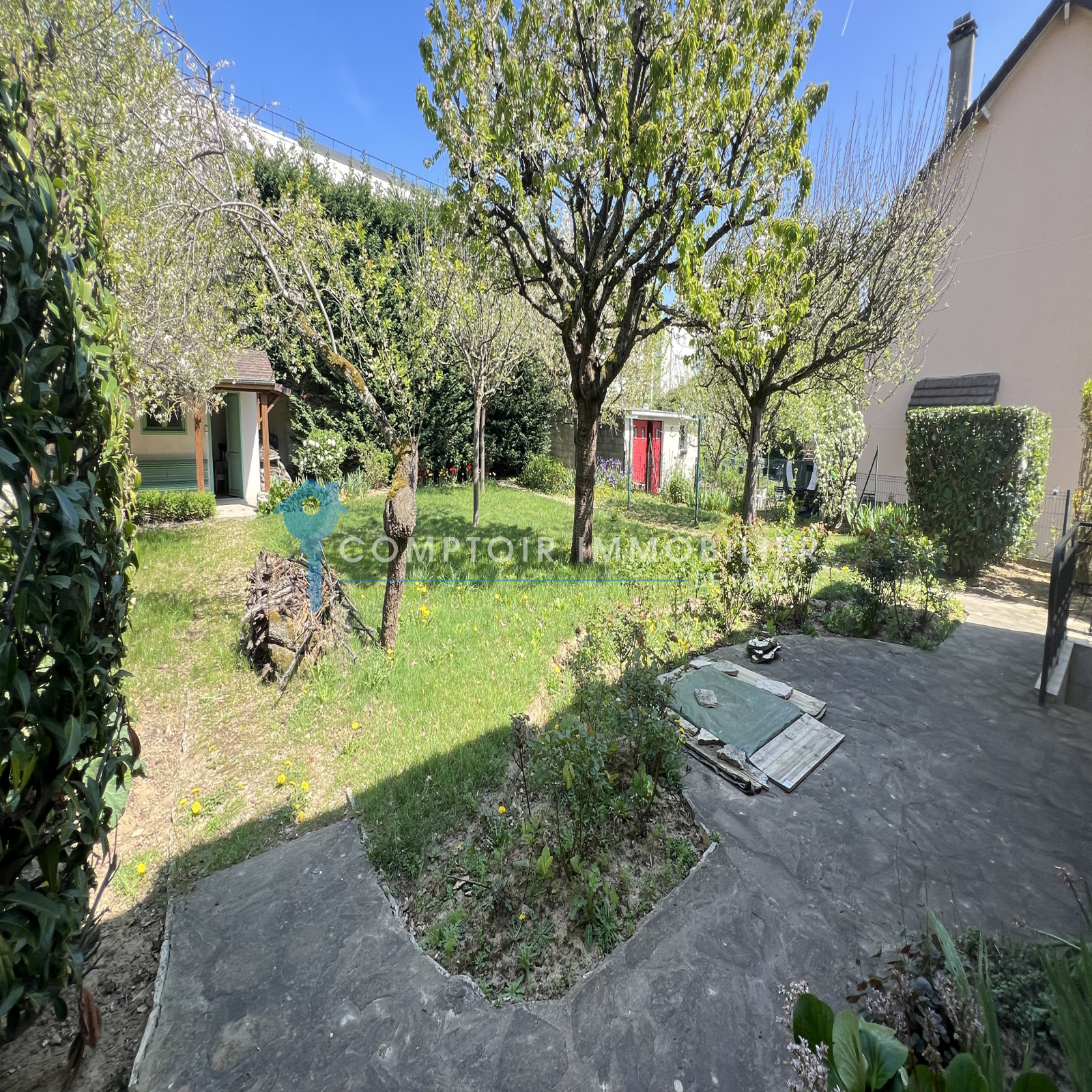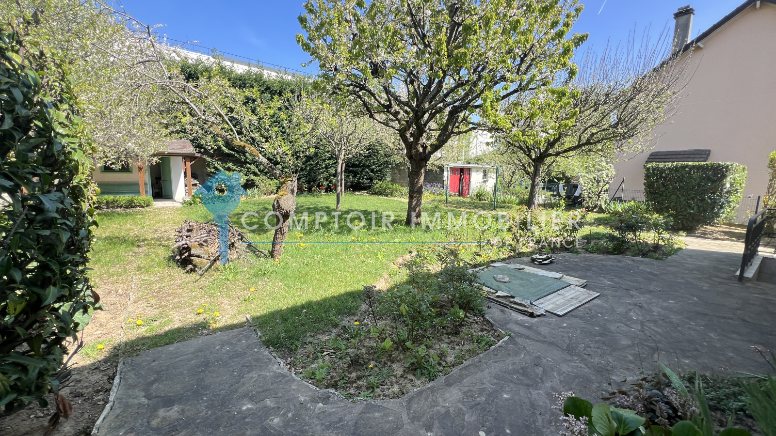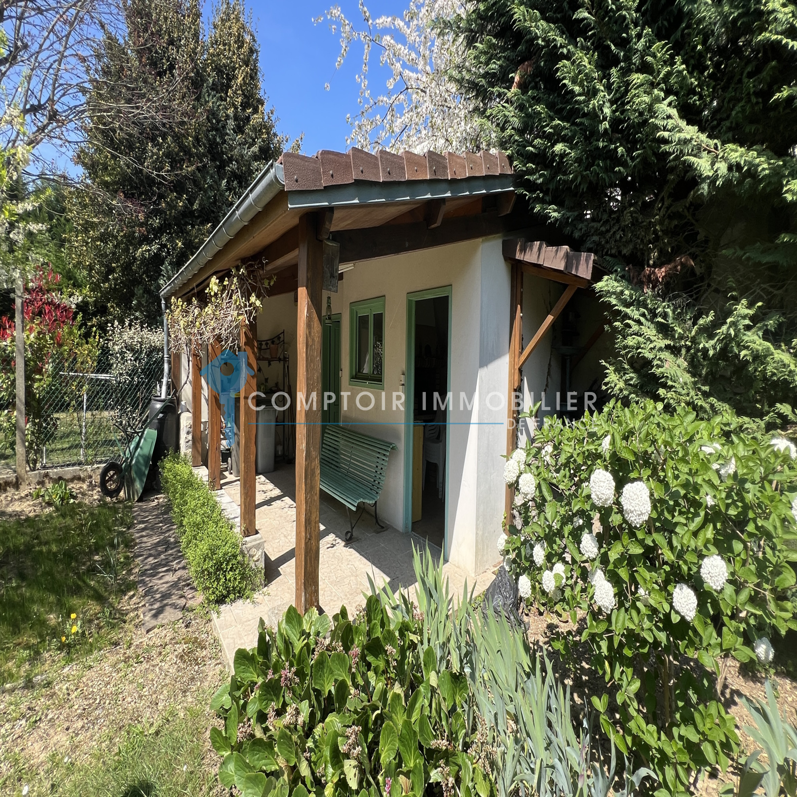 Terrain clos et arboré d'environ 800m2 avec abri de jardin en dur comprenant deux pieces dont une avec barbecue.