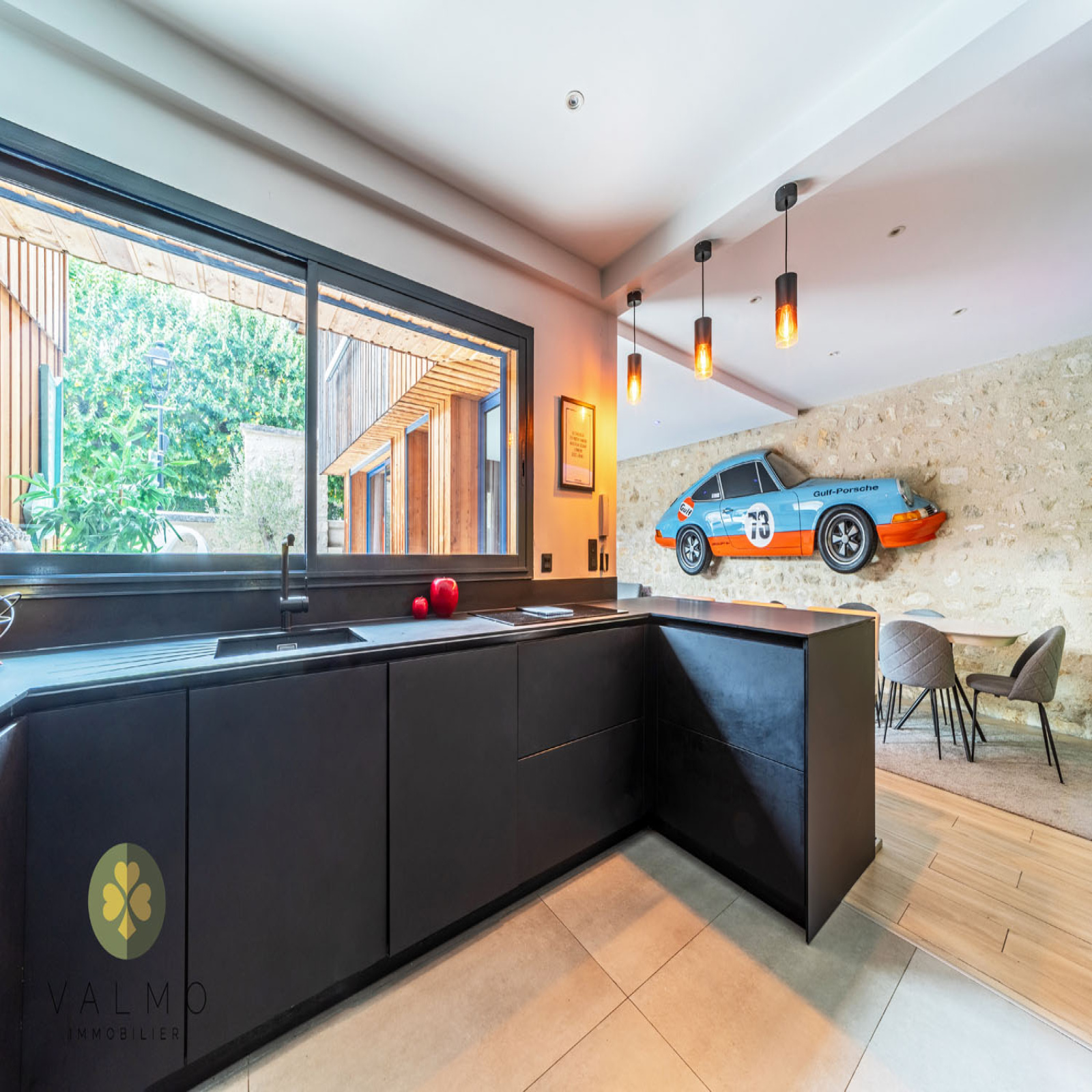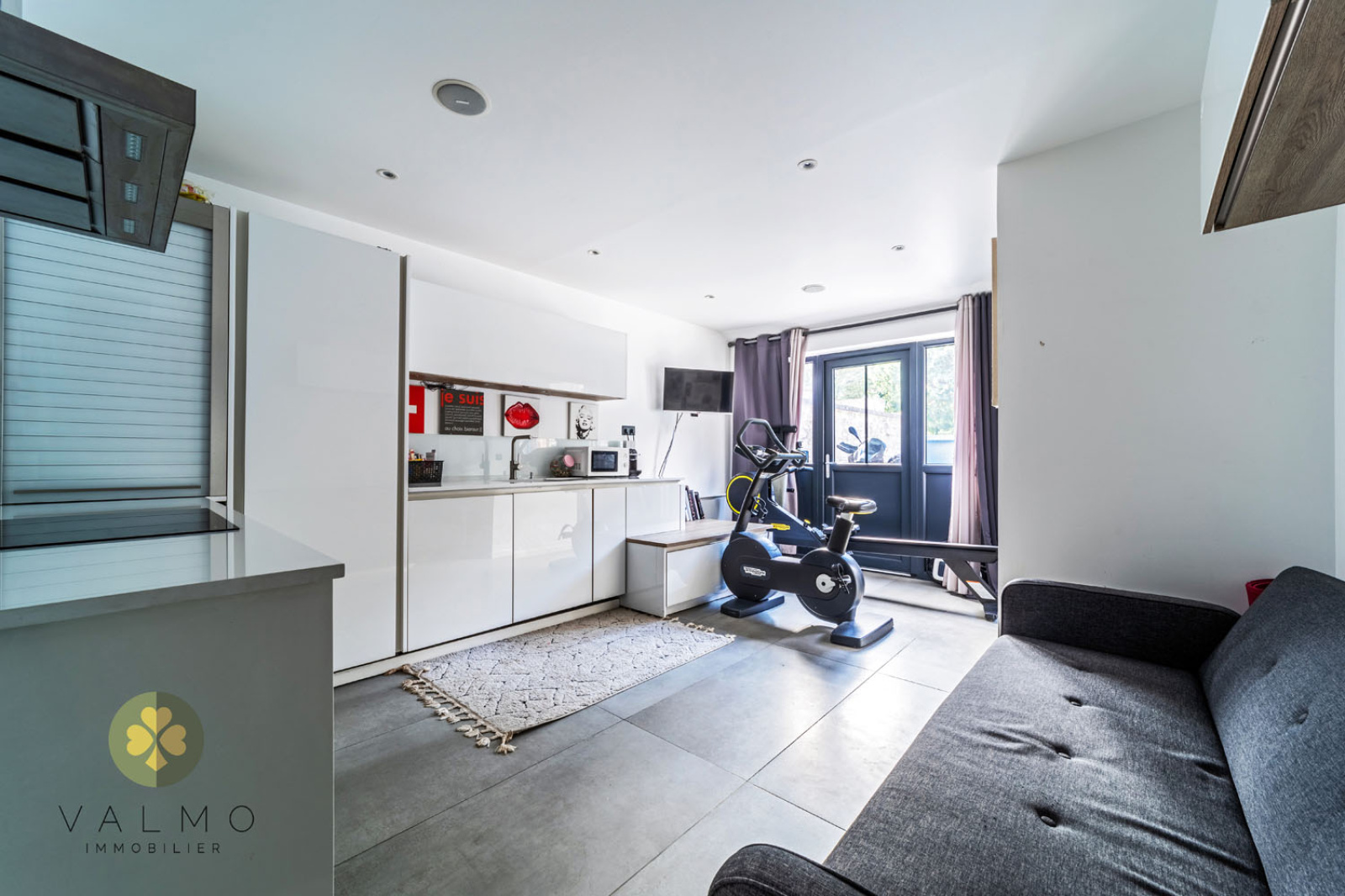 Au rez-de-chaussée : un salon avec cuisine ouverte entièrement équipée de 50 m² avec accès sur cour, un dégagement desservant une buanderie avec wc/lave-mains et rangements, un studio entièrement équipé de 21 m² avec cuisine et salle d’eau/wc avec accès intérieur et par l’extérieur avec la possibilité d'en faire une suite parentale.
