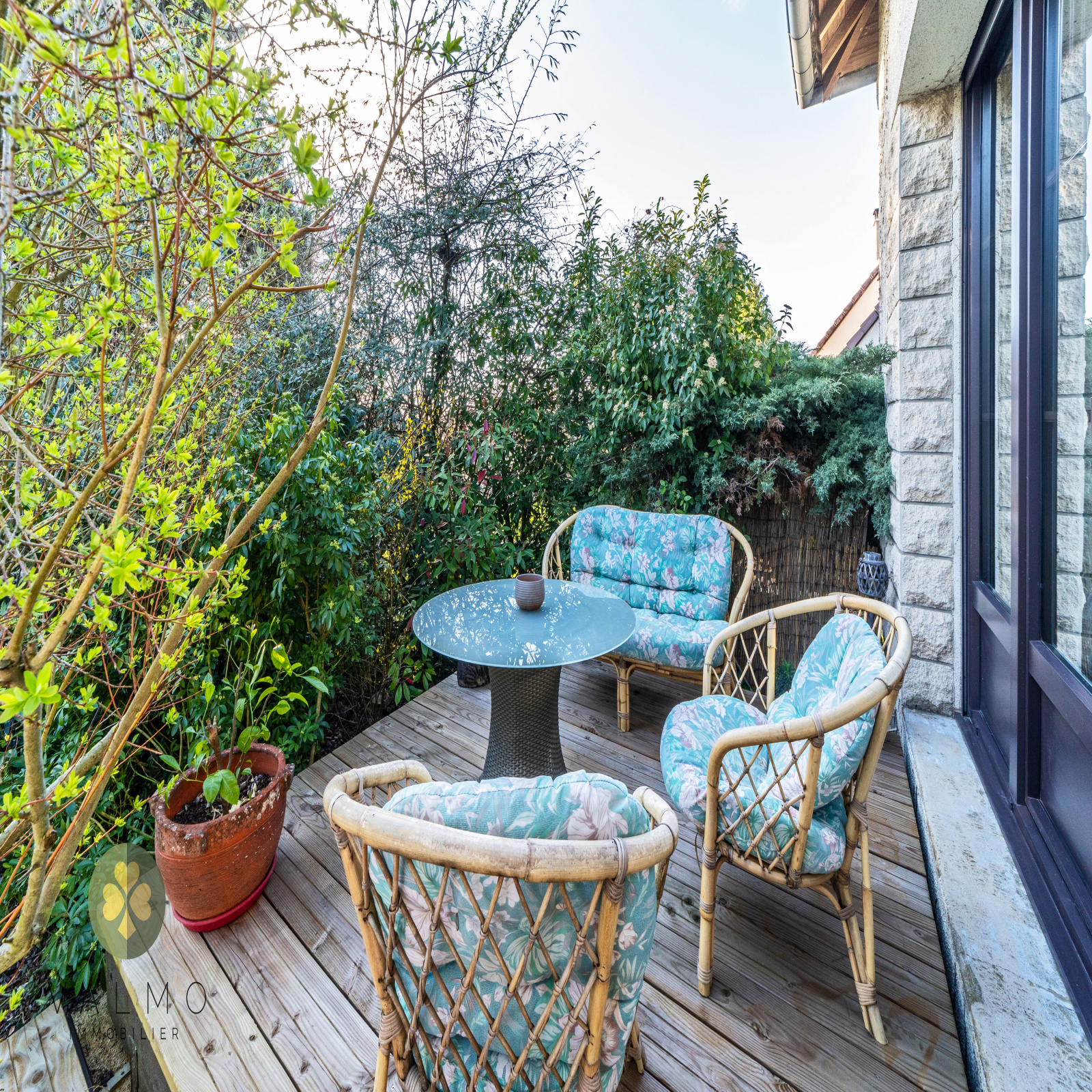 À l’extérieur, la maison bénéficie également de terrasses, dont une à l’arrière, offrant un agréable espace de détente.
