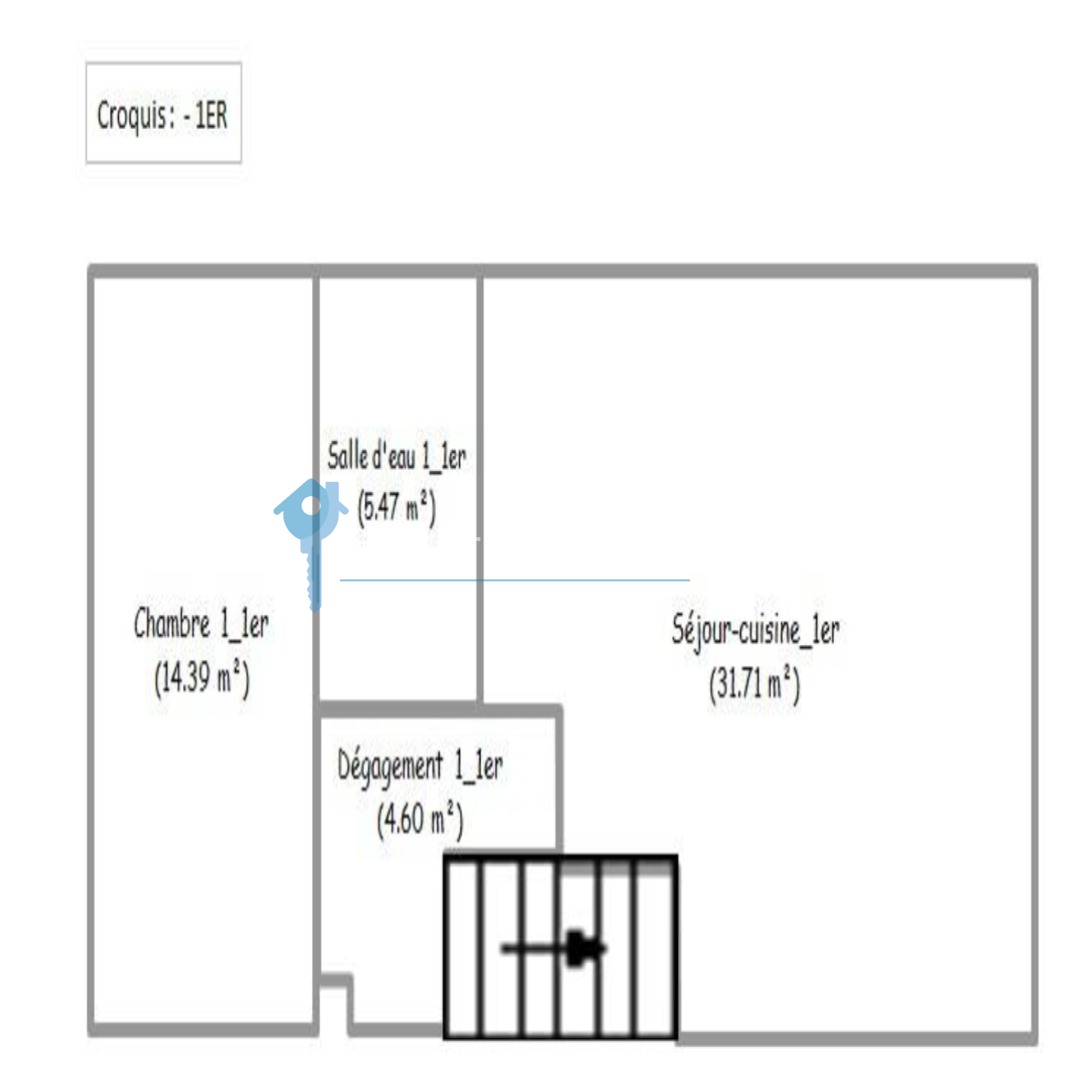 Pièce de vie lumineuse de 31 m² avec cuisine ouverte, une chambre de 15 m², une salle de bains avec WC.
