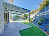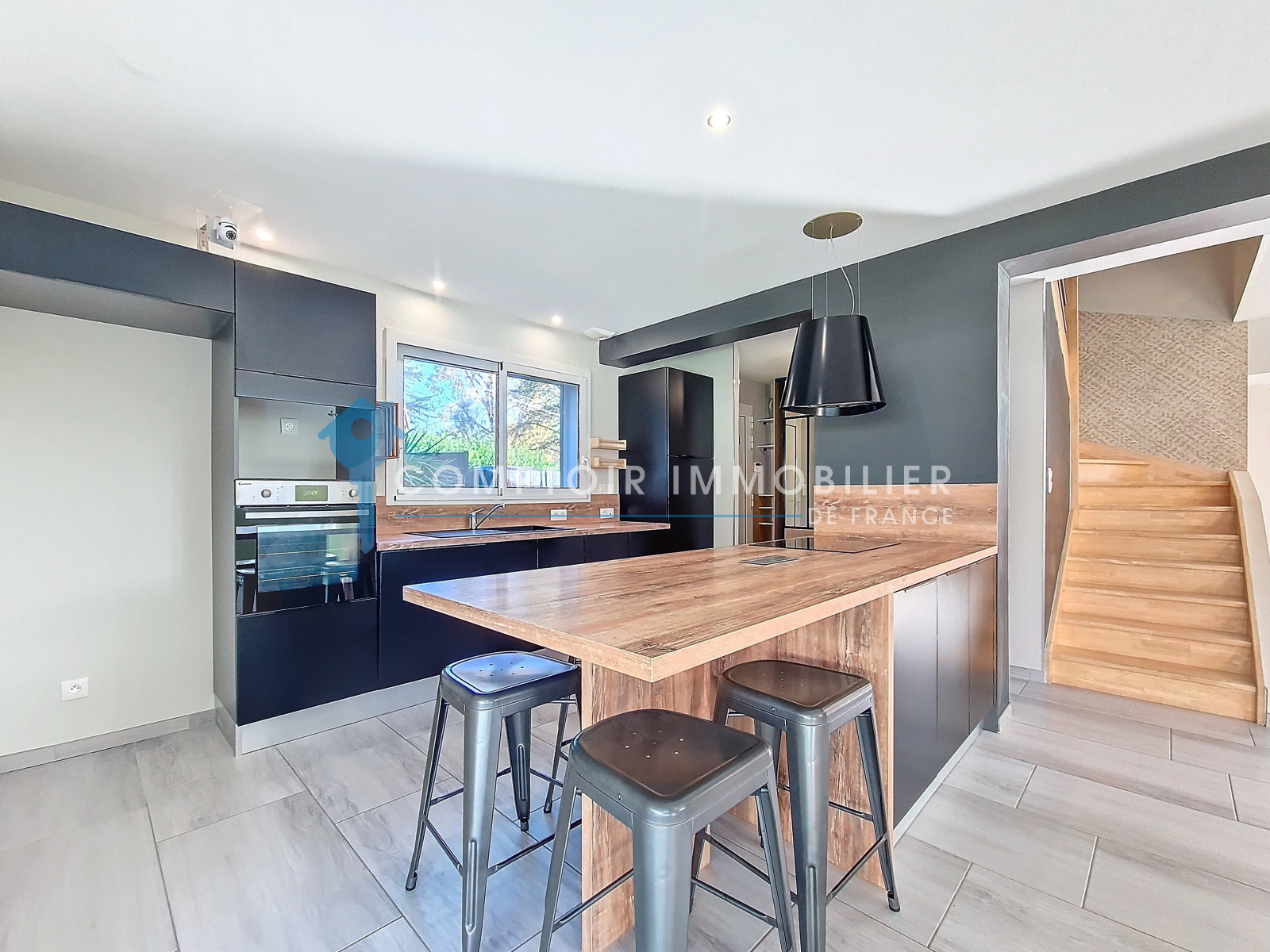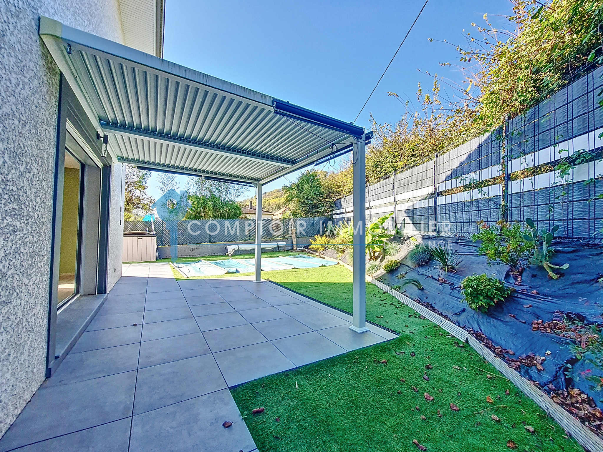 Lumineuse car exposée Sud, elle se compose au RDC d'un hall d'entrée avec placards, d'une cuisine Armony équipée ouverte sur le séjour / salle à manger totalisant 42m² et donnant sur la terrasse carrelée coté Ouest qui comprend une pergola, d'une pièce de 12m² et d'un wc séparé.