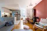 Répartie sur trois niveaux, le rez-de-jardin de la maison se compose d'une pièce de vie de 32 m² avec salon/séjour et cuisine SCHMIDT ouverte, avec accès aux espaces extérieurs, et d’une salle de bains avec WC.