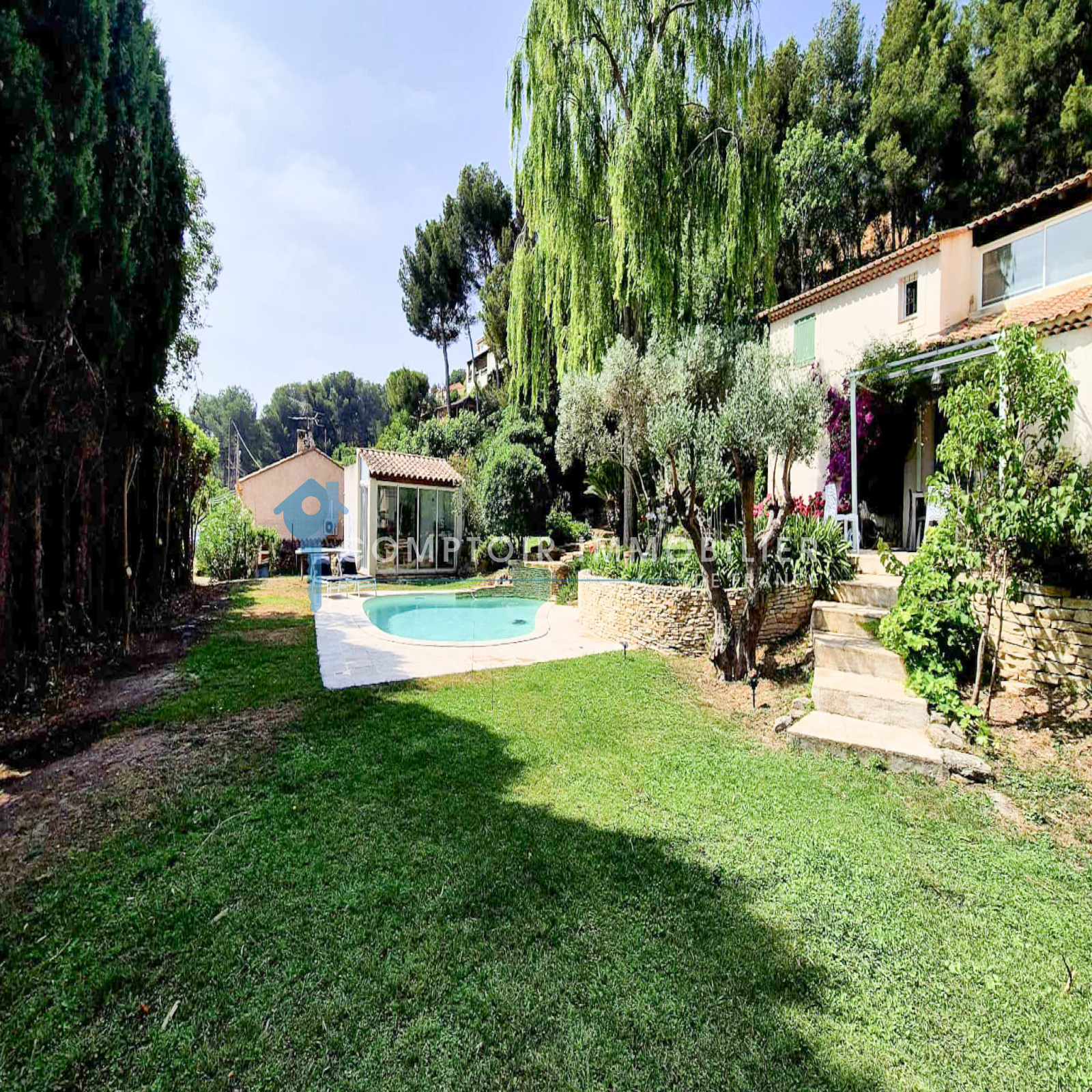 Extérieur : Piscine avec pool house – Jardin arboré – Vue sur l’étang de Berre