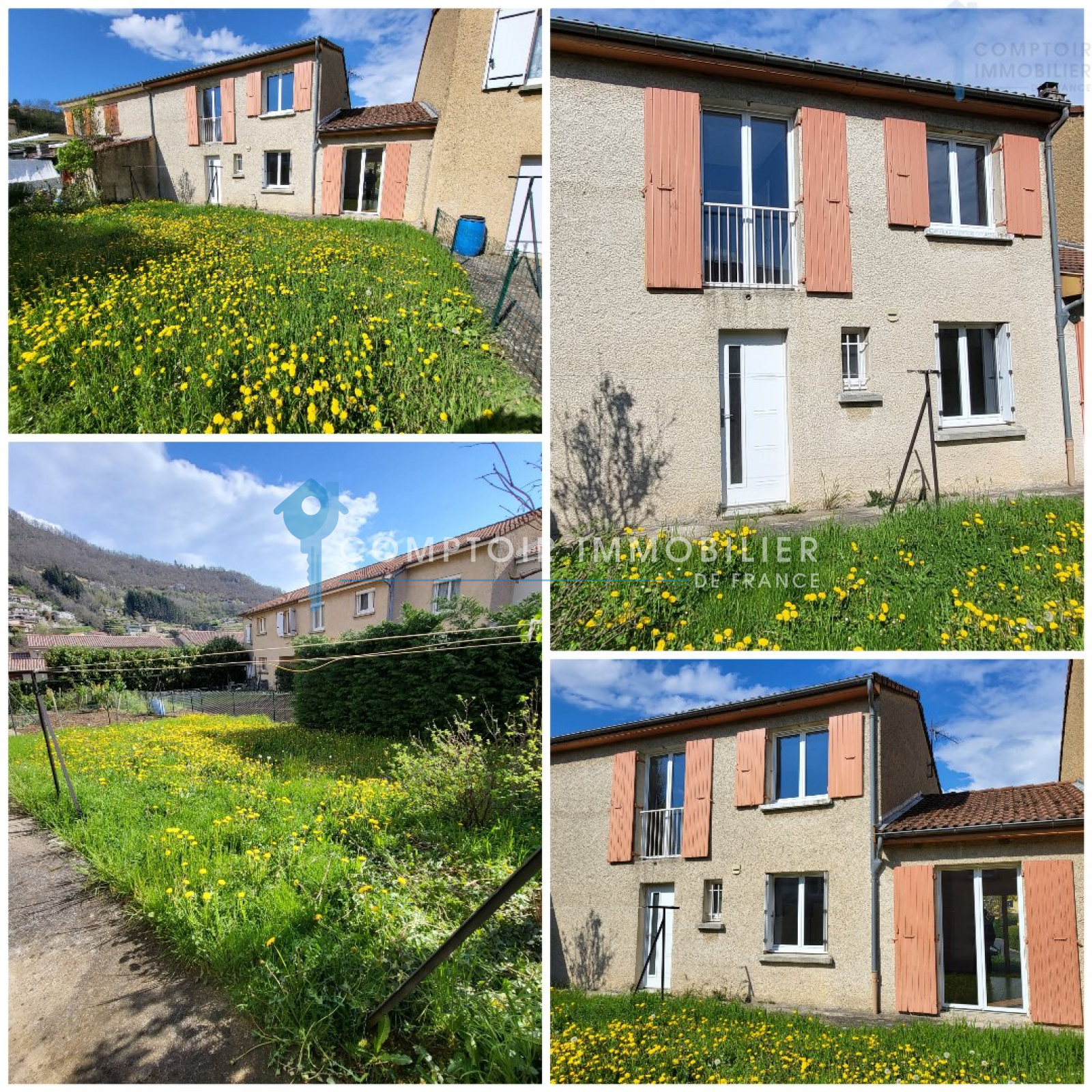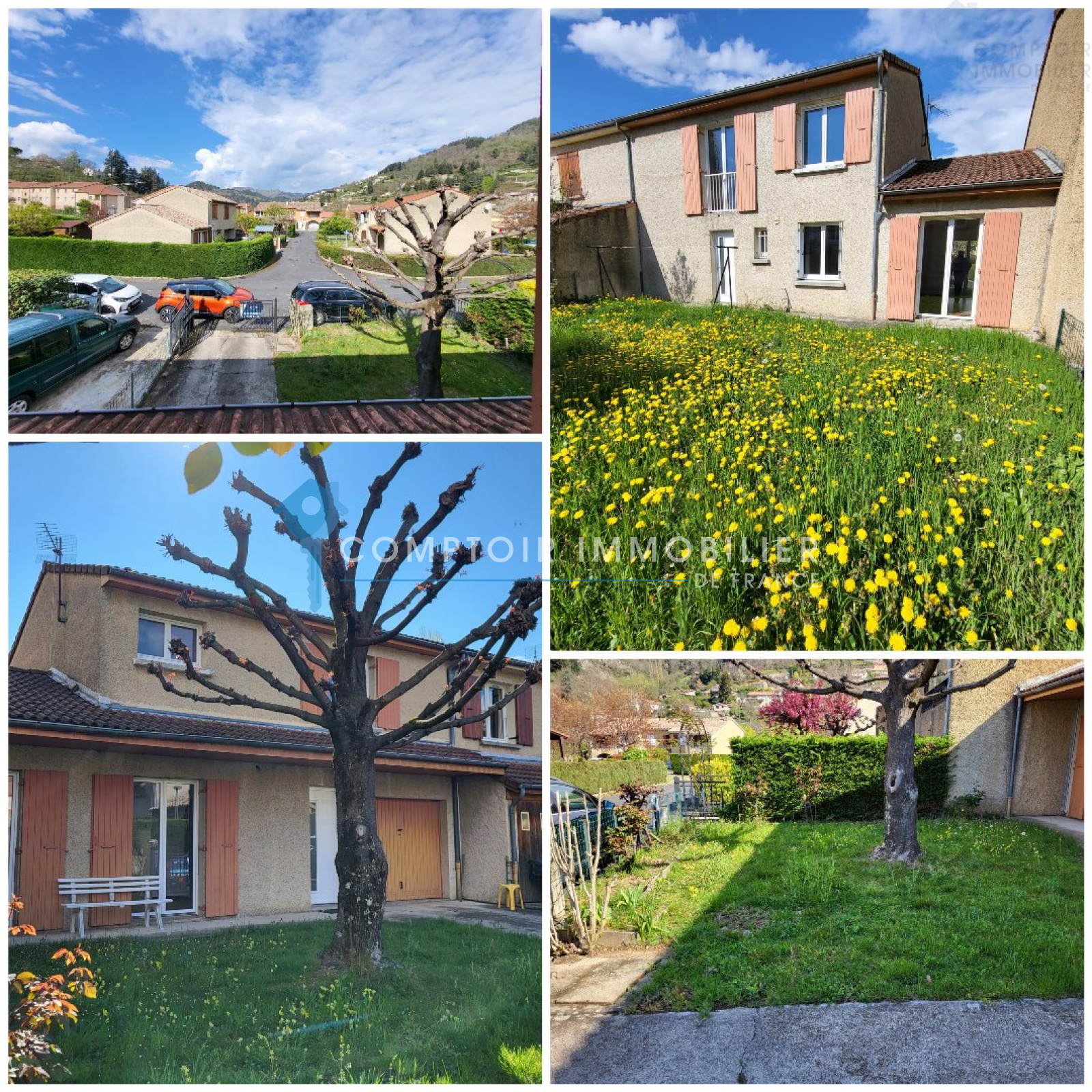Le Cheylard, sur la route de Valence, dans le lotissement "La Palisse Ouest", Comptoir Immobilier de France vous propose de venir découvrir cette sympathique maison T4 de 80m2 mitoyenne des deux côtés, avec son terrain plat en parti arboré et clos de 250m2 env. Ce bien est composé comme suit : au RDC une entrée avec placard mural (2.18m2) distribuant une salle ouverte salon, salle à manger (29.45m2), cuisine (8.82m2), WC séparé (1.61m2) un accès garage (1.61m2) et un escalier en colimaçon offrant à son arrivé une distribution faisant découvrir trois chambres dont deux avec placards muraux respectivement de (10 - 10.70 et 11.34m2), une salle de bains avec son WC équipée d'une fenêtre (5.01m2). Pour compléter ce bien un garage (25m2) avec coin buanderie, traversant avec une porte de service allant sur le jardin de l'arrière et un accès à l'habitation. Le terrain permet de recevoir une piscine et offre plusieurs possibilités pour les passionnés du jardinage ! Renseignements complémentaires : le bien est raccordé au tout à l'égout, eau de ville, électricité, fibre optique. Les menuiseries sont en PVC double vitrage, volets à battants en bois peint, la porte d'entrée est sécurisée, ainsi que la porte de service accès jardin. Chauffage radiateurs électriques, production d'eau chaude par ballon électrique. Les sols sont revêtus de carrelage ou parquet flottant dans les chambres, le sol du garage est en béton. Exposition EST-OUEST. Taxes Foncières 650 €. Travaux effectués : Revoir l'isolation possibilité de faire installer une pompe à chaleur (se renseigner avec la participation gouvernementale, interrogez les professionnels locaux) Déco à revoir ! Avis : Idéalement pour un premier achat, en principale ou secondaire. Cette maison est bien exposée et bien placée, à proximité des commerces. Elle convient pour une famille avec plusieurs enfants pour occuper les trois chambres. Bien qu'elle fasse partie d'un lotissement, il n'y à pas de nuisance, le vis-à-vis est correct. Bien ensoleillée, elle n'attend plus que vous ! Honoraires charge vendeur Prix moyens des énergies indexés au 01/01/2021 (abonnement compris). Montant estimé des dépenses annuelles d'énergie pour un usage standard : entre 1 670 € et 2 300 € par an. CIF AUBENAS - Marc MILAZZO - 06 75 90 71 31 - EI Agent commercial RSAC N° 837 841 048 - Ville du greffe : LYON - Plus d'informations sur cif-immo.com (réf. 16305)