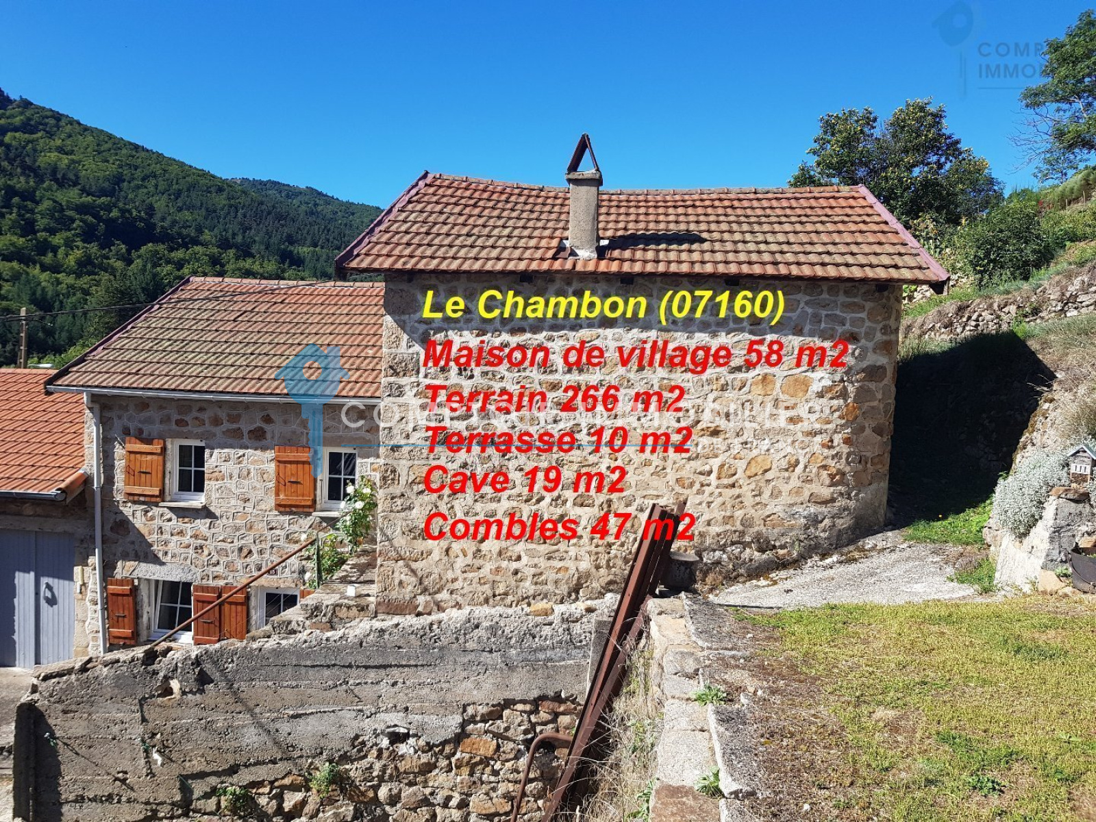 A 15km du Cheylard sur la commune ''Le Chambon'' au c?ur du village nous vous proposons cette coquette maison de village Ardèchoise en bâti pierres, petit budget pour se permettre de prendre du bon temps en pleine nature ! Idéalement en maison secondaire, pour recevoir famille ou amis au calme ! Elle est située sur les monts d'Ardèche, dans un cadre de nature verdoyante, à proximité des forêts, rivières, lacs, montagne, villes. A moins d'une heure de Vals-les-bains, Aubenas à proximité du plateau, des monts : Mèzilhac, Gerbier de jonc, Le Mézenc ! La maison est mitoyenne sur un côté, mais ne laisse apparaître aucune nuisance. Elle est composée dès son entrée, d'une pièce ouverte de 20m2, cuisine et salle à manger, un escalier bois allant à l'étage et distribuant une chambre de 12m2 et deux autres pièces avec fenêtres servant de coins nuits 8,80m2 et 7,33m2, une salle de douche avec WC 4.40m2 et un coin rangements 4.50m2. Accolée à la maison une cave semi enterrée 19,50m2 équipée d'un WC. Puis par l'extérieur vous aurez accès aux deux combles 28 et 20m2. Pour compléter ce bien, rare pour une maison de village, un terrain attenant et plat de 150m2 env à l'abri des regards et une autre parcelle non attenante vers la rivière 80m2 env. A l'extérieur les murs sont très propres, très belle aspect, à l'intérieur il faudra revoir la peinture. Si vous souhaitez venir hors période d'été, prévoir la création d?un système de chauffage (poêle à granules, pompe à chaleur ou poêle à bois) ! La menuiserie est en PVC double vitrage et les volets à battant en bois, les toits ont été refaits et sont isolés (20 ans), fosse septique. Taxe Foncières 128 €. Ce bien n'attend plus que vous, venez le découvrir ! (photos et vidéos sur demande). Honoraires charge vendeur CIF AUBENAS - Marc MILAZZO - 06 75 90 71 31 - EI Agent commercial RSAC N° 837 841 048 - Ville du greffe : LYON - Plus d'informations sur cif-immo.com (réf. 15238)