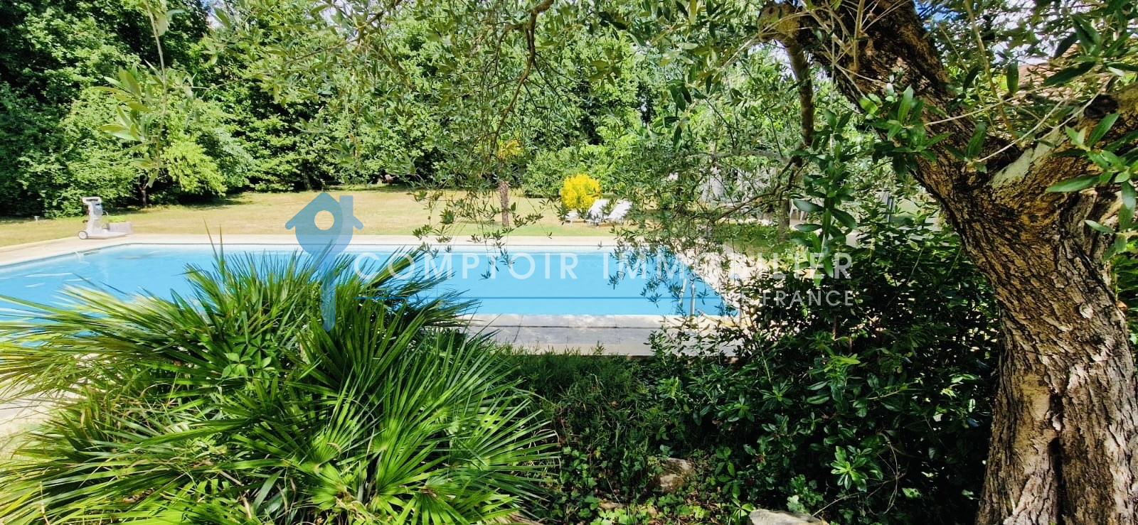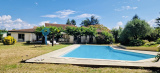 A l’extérieur : des terrasses, une magnifique piscine (11,50m x 5) bordée par la prairie, des arbres fruitiers, un coin potager