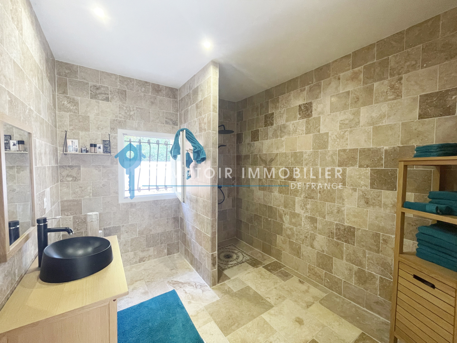 La maison étant de plain-pied, nous retrouvons au même niveau les 3 chambres de 10 à 13,5m2, une salle d'eau en travertin, un WC séparé et une buandrie donnant accès au sous-sol de 110m2 (2 portes motorisées).
