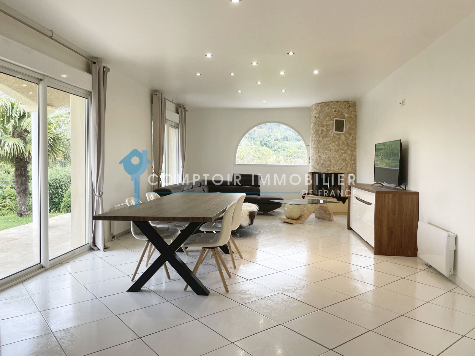 L'entrée se fait sur une pièce de vie spacieuse et lumineuse de plus de 55m2 comprenant d'un côté la cuisine entièrement équipée, et de l'autre un espace salon-salle à manger. Les 2 espaces ont un accès direct à la terrasse.