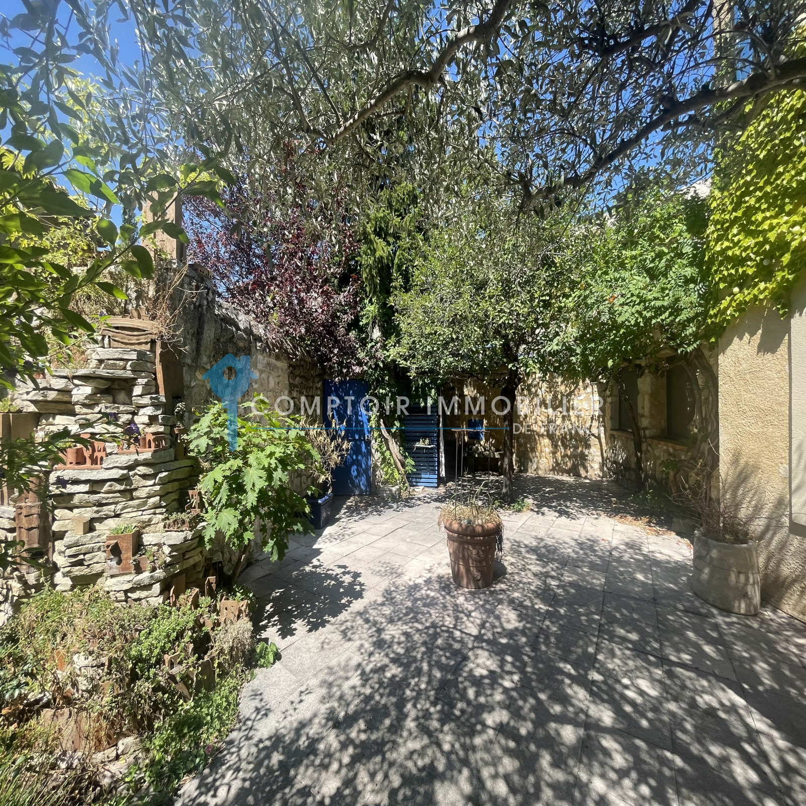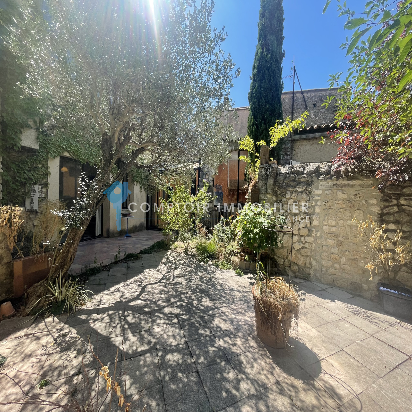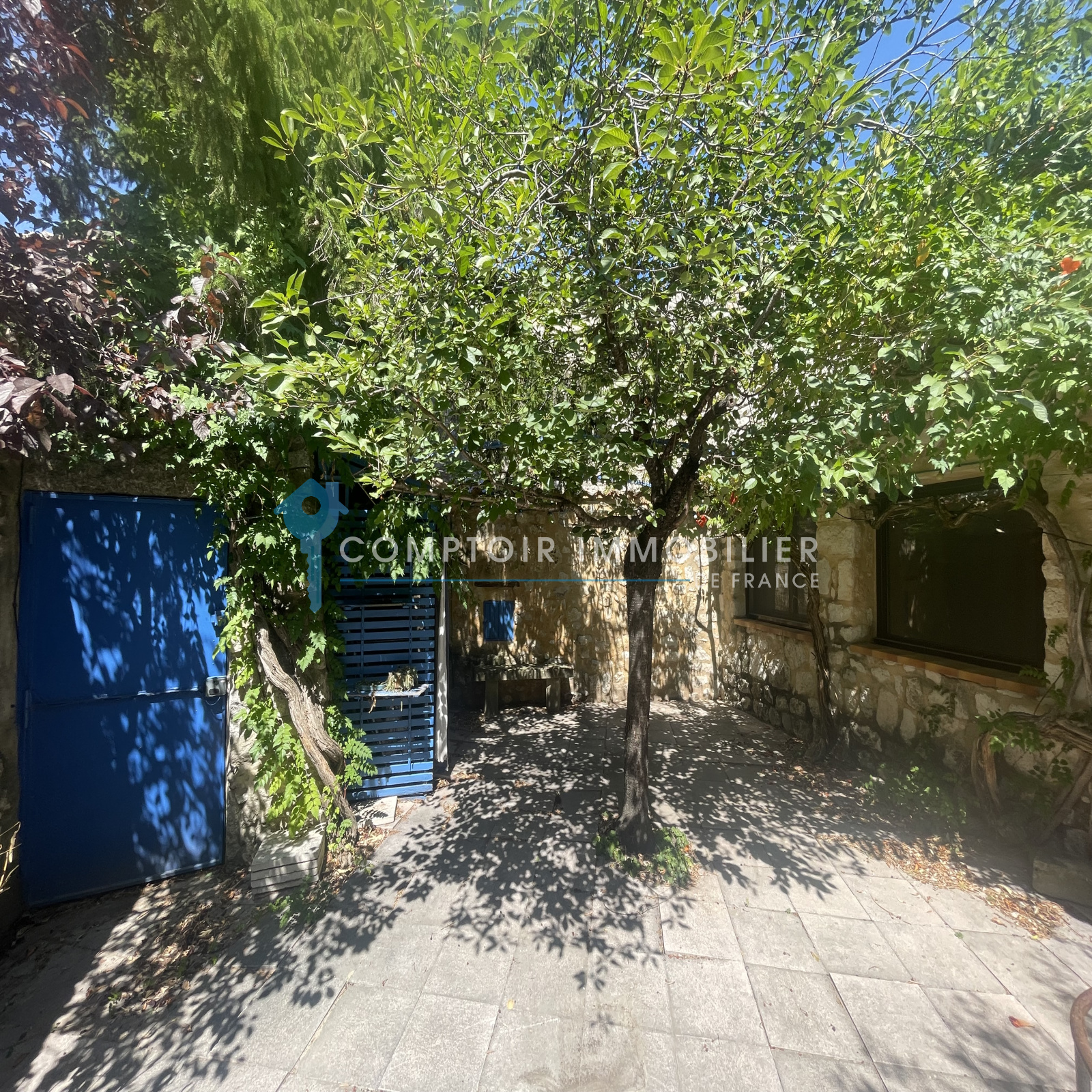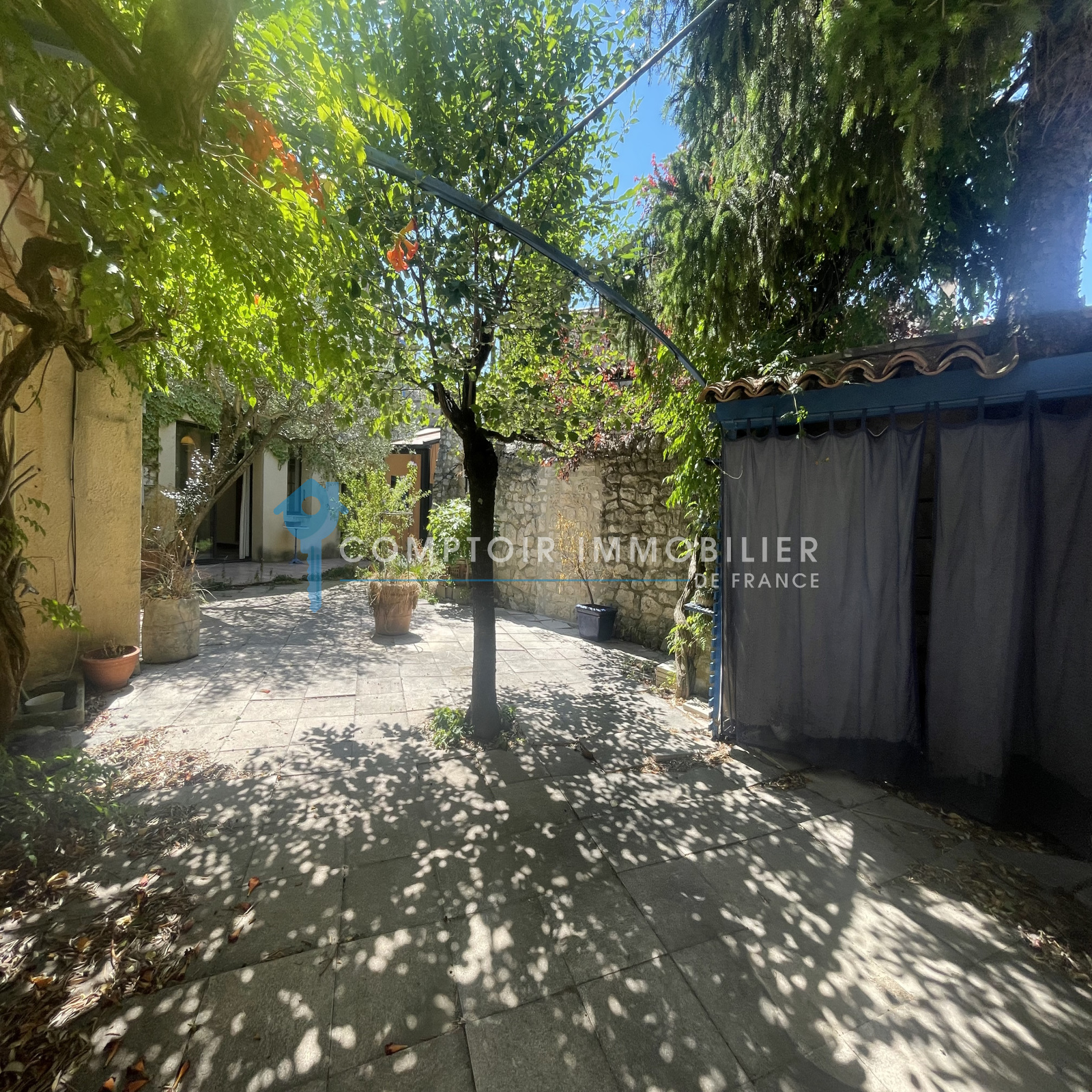 Dans la continuité de la pièce de vie, une cuisine équipée et son cellier. Aussi, une veranda de 27m2 climatisée et chauffée est accessible depuis la cuisine et depuis la cour privative sans vis-à-vis et joliement arborée.