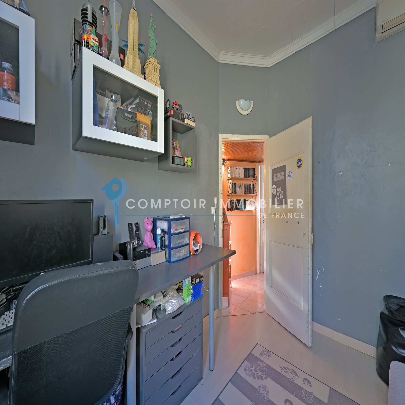 Au rez de chaussée, une cuisine ouverte sur le séjour, une salle d'eau avec WC, un bureau et le petit extérieur