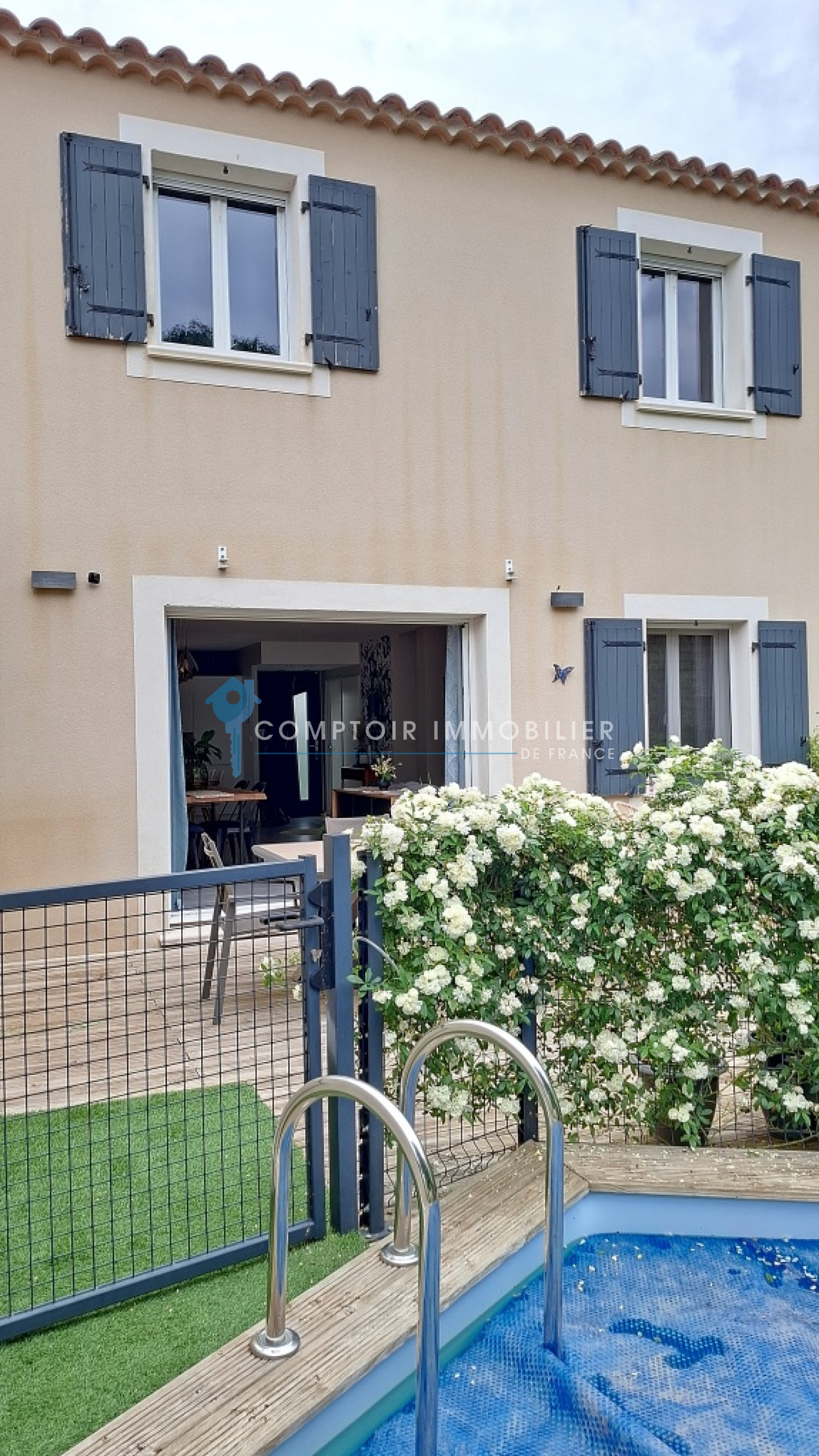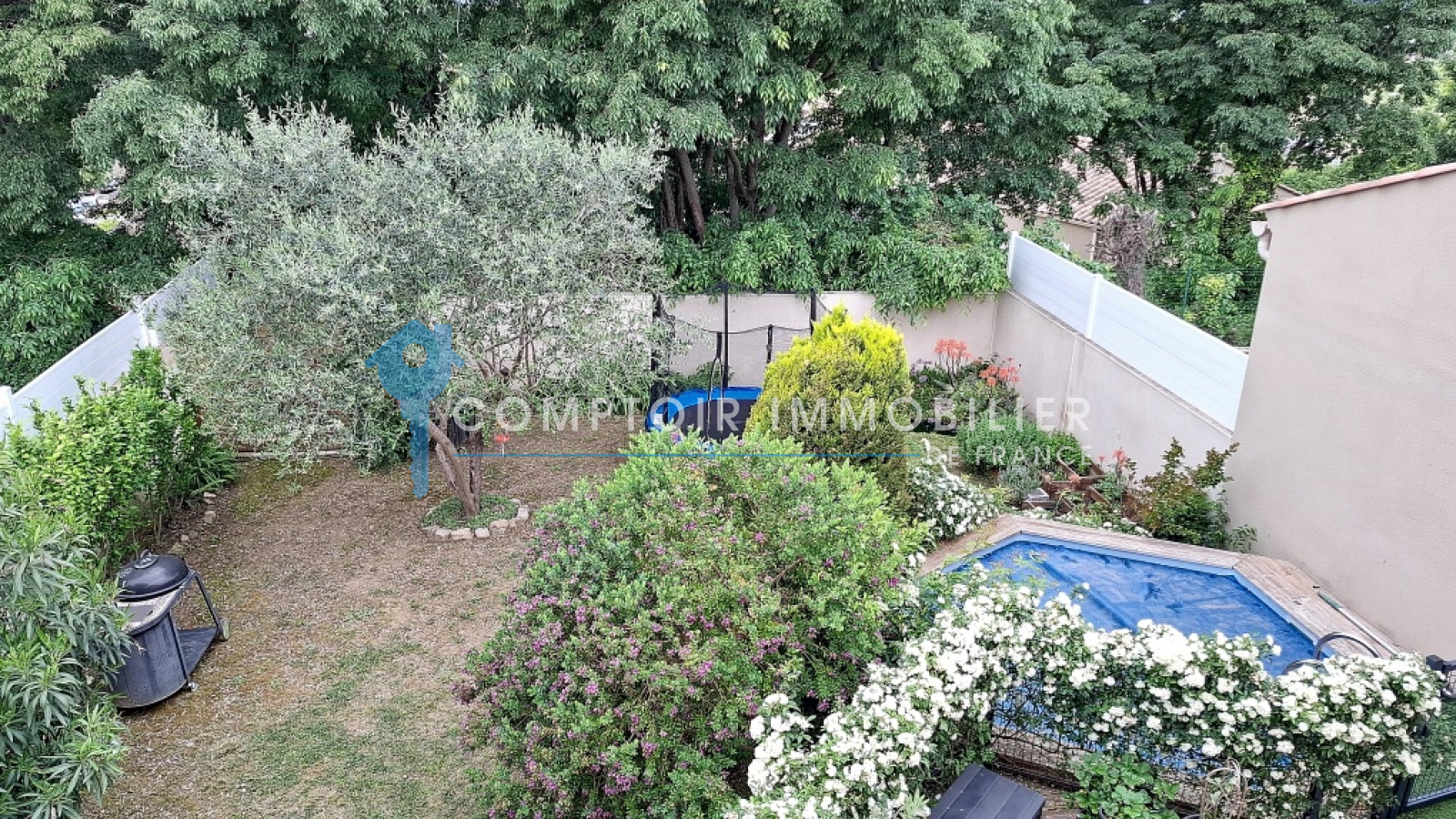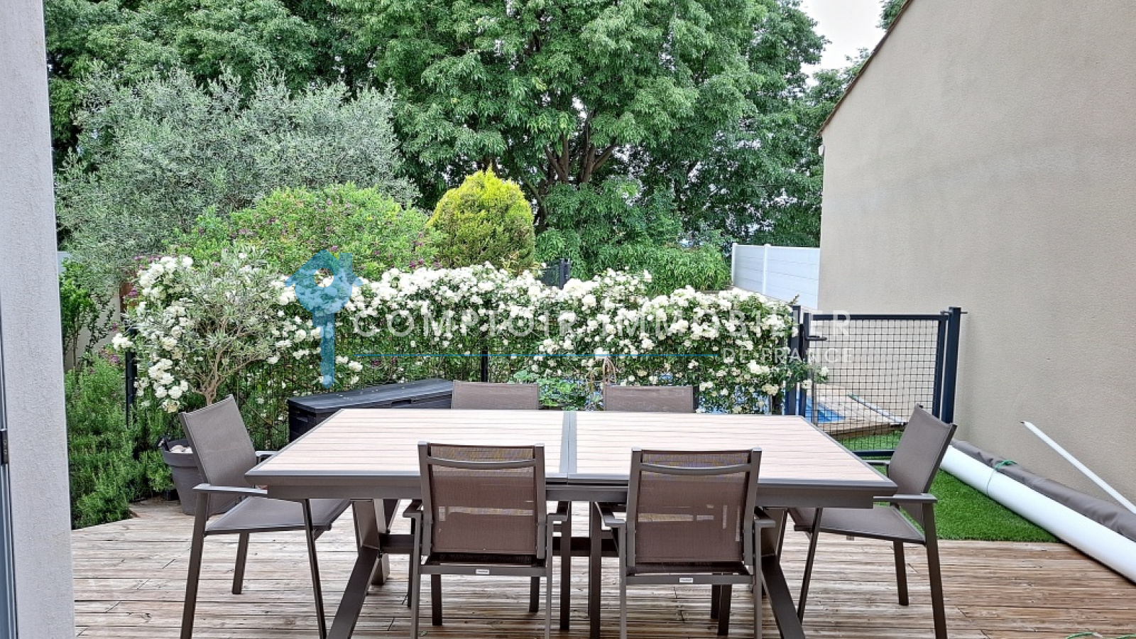 Cette maison est située au calme et vous pourrez ainsi profiter d'un jardin magnifiquement entretenu avec une belle terasse ainsi qu'une piscine hors sol bien intégrée dans la continuité de celle ci.