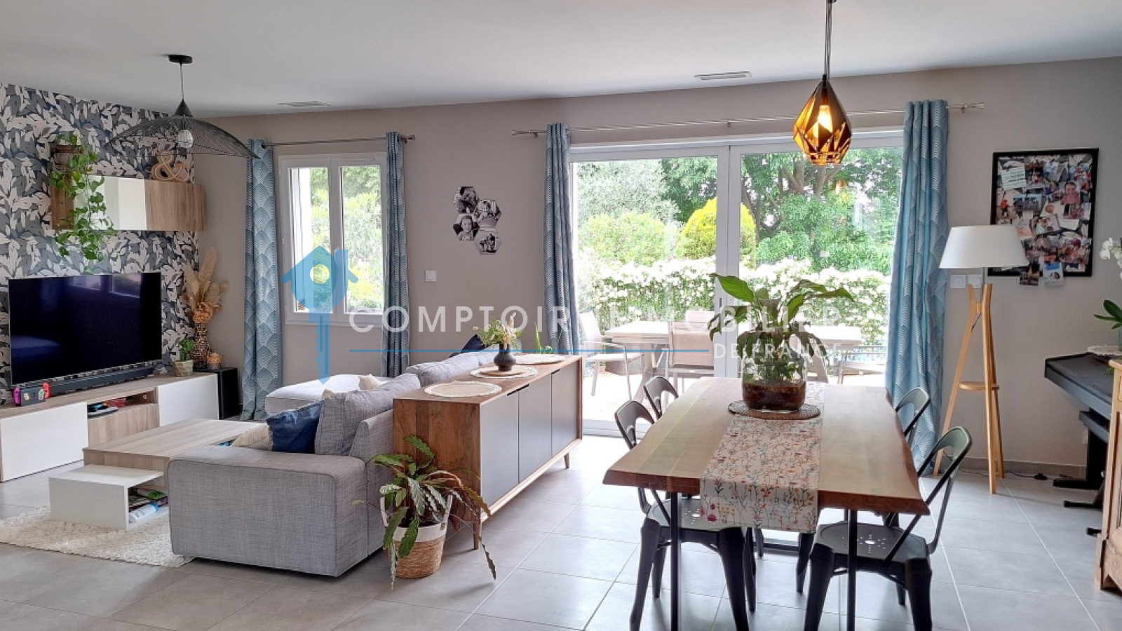 Vous entrez sur une grande pièce de vie avec sa cuisine ouverte entièrement équipée avec une vue agréable sur le jardin fleuri.