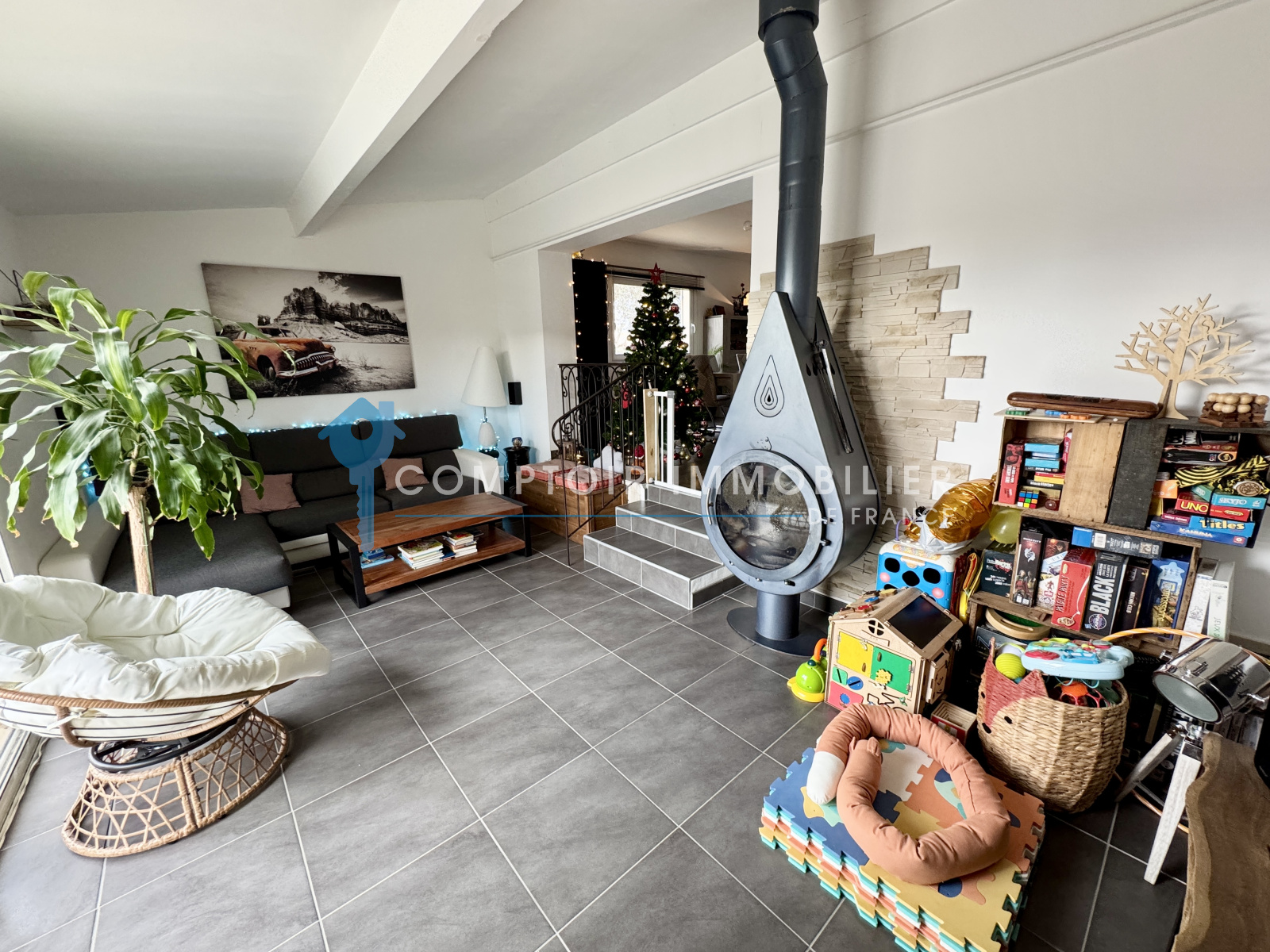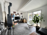 Grande pièce de vie lumineuse avec un poêle à bois et climatisation
