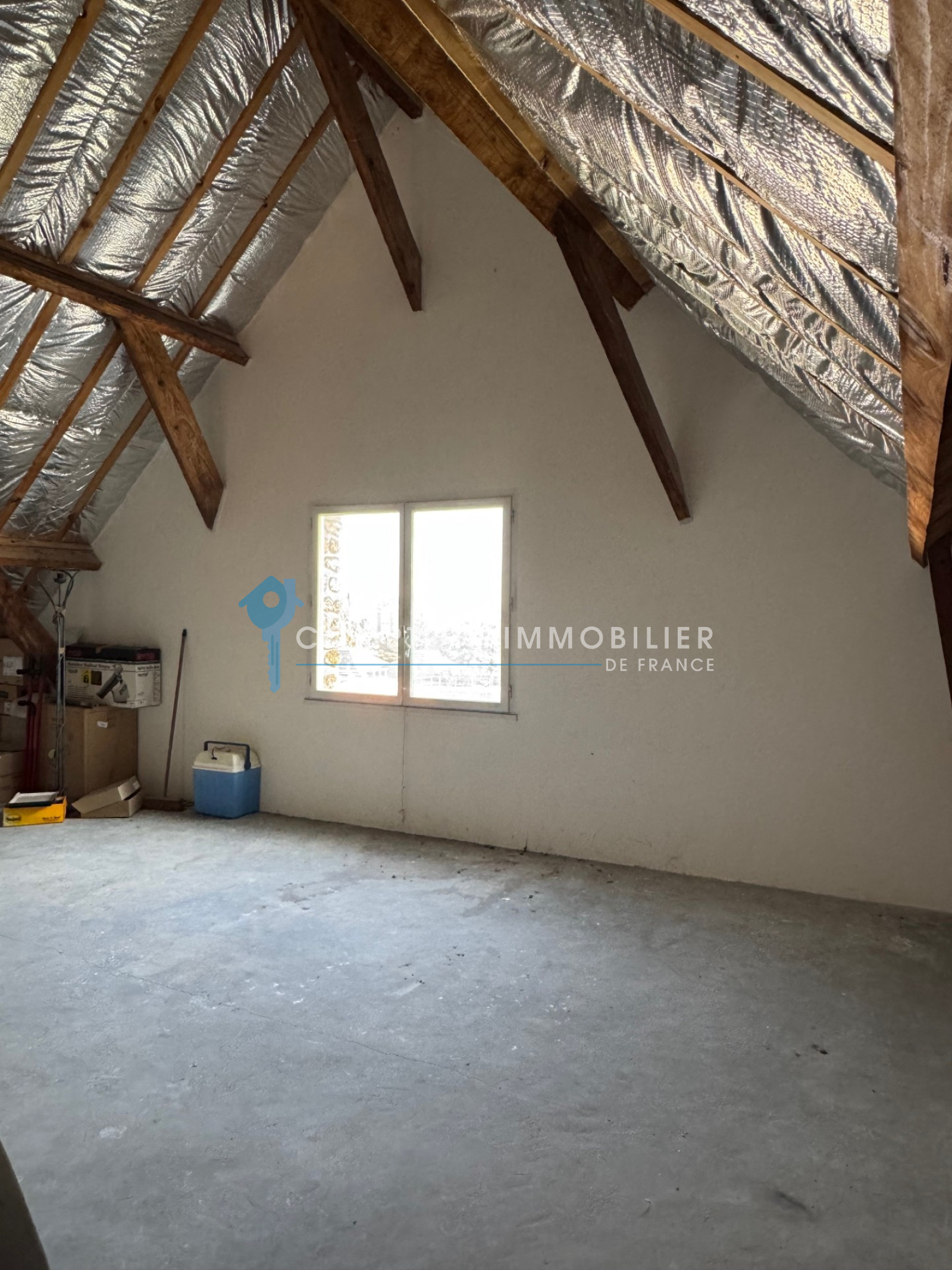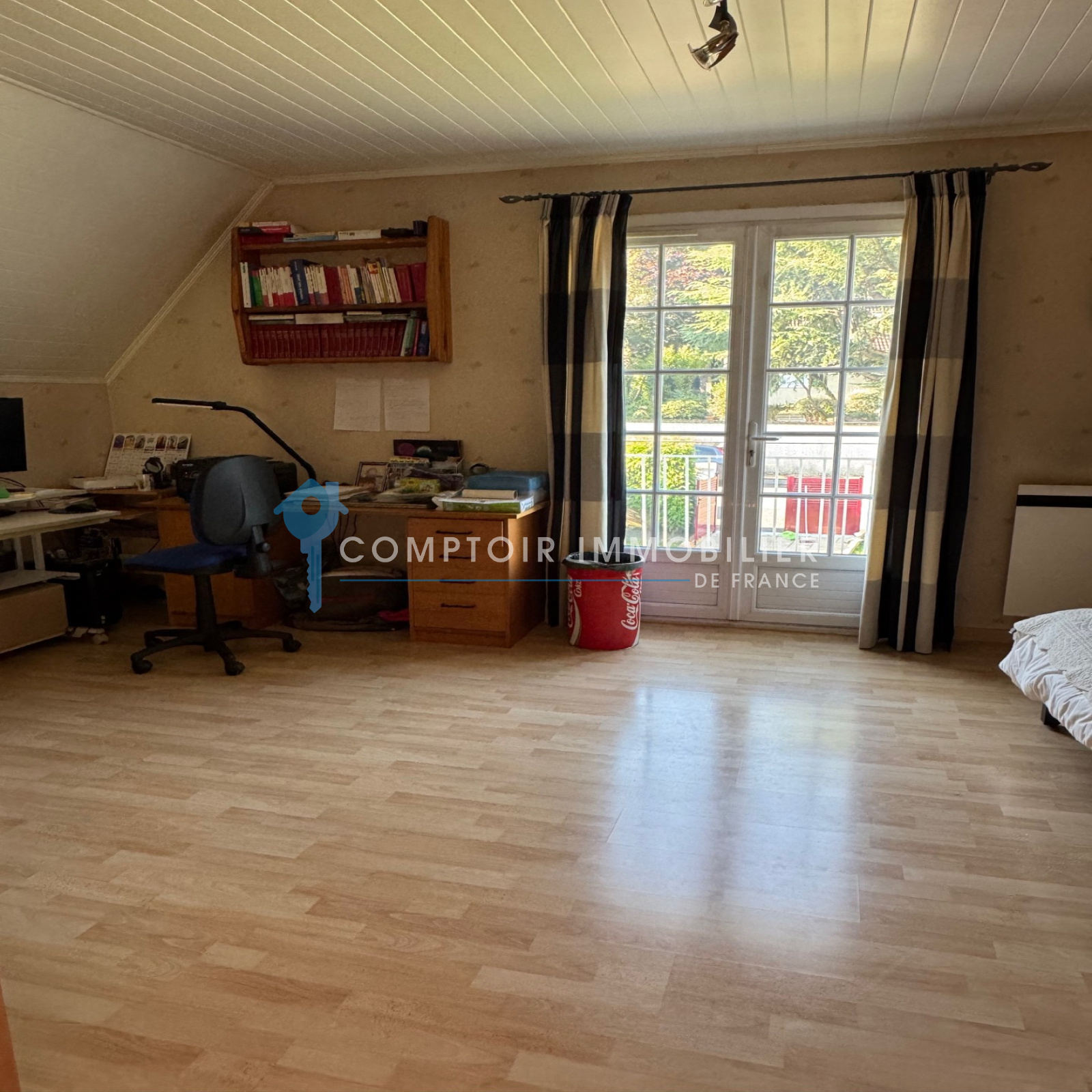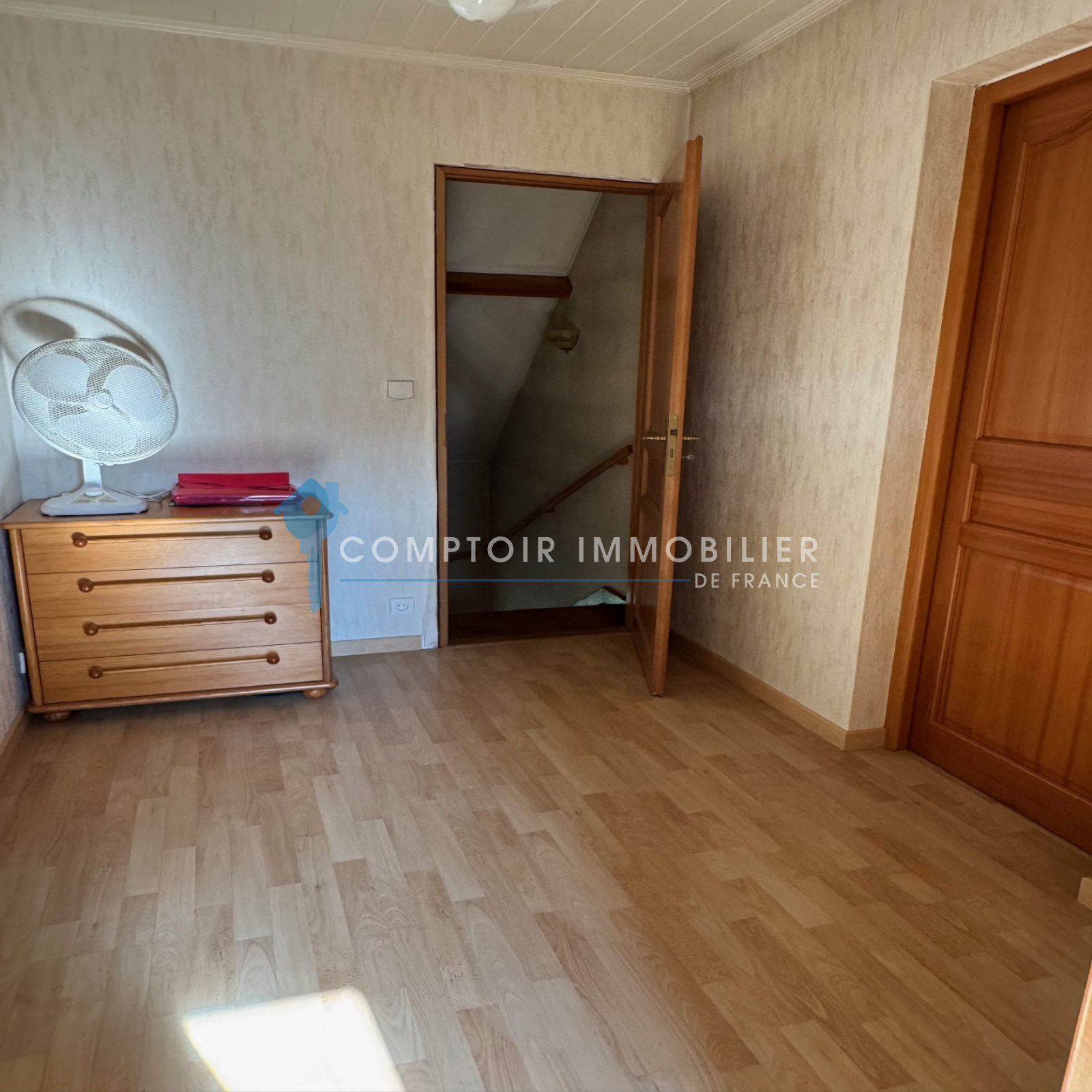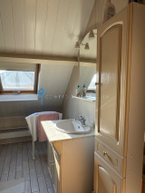 A l'étage: une chambre de 21 m², une salle d'eau avec wc et un vaste grenier (28 m²) à aménager (suite parentale....).