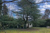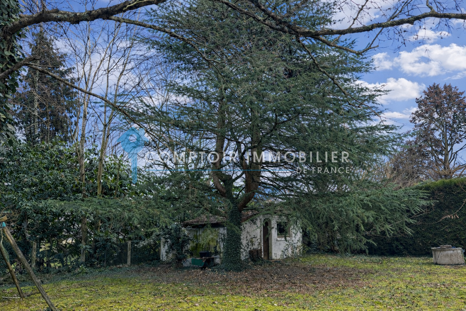 Terrain clos et arboré de 830 m² avec un abri de jardin et un puits.