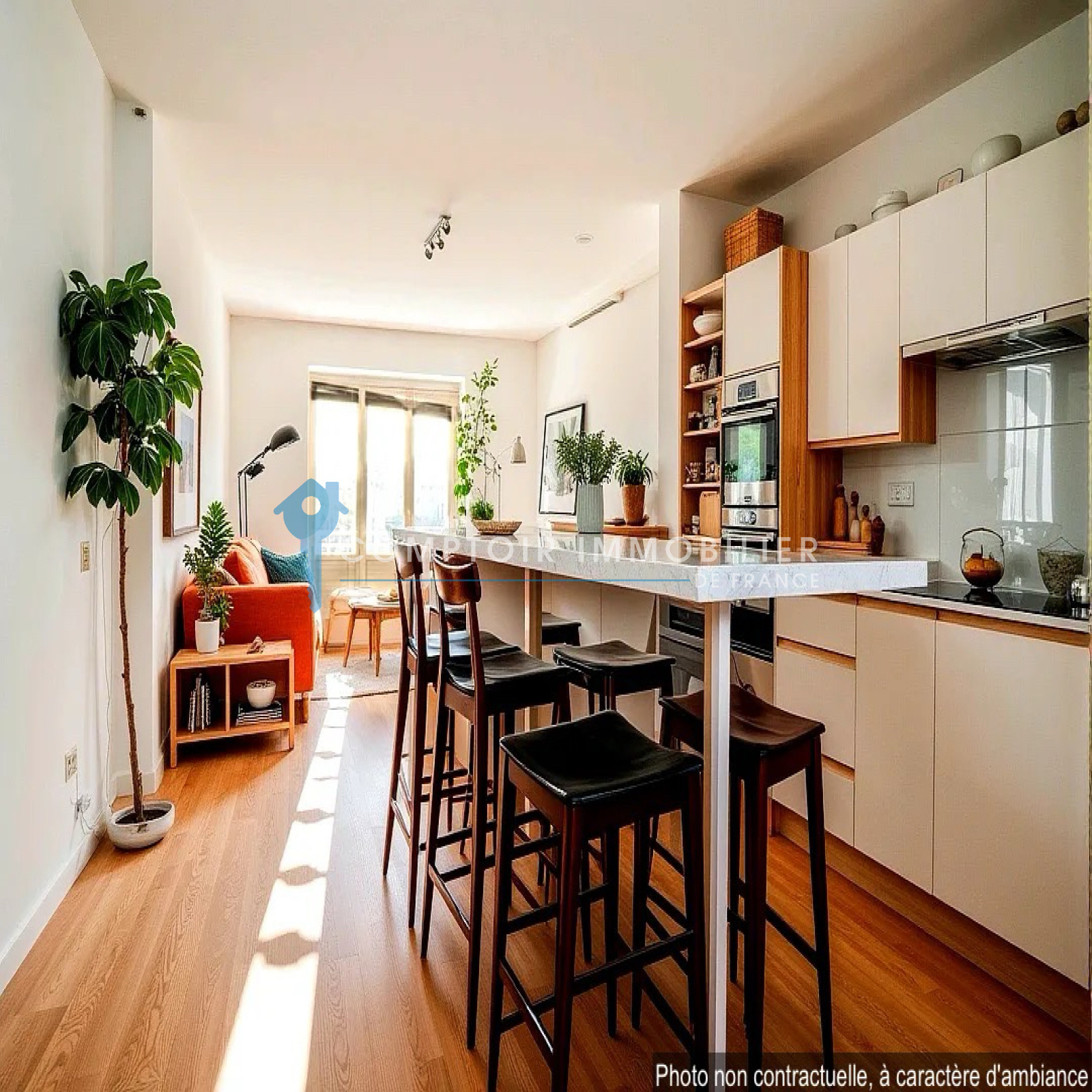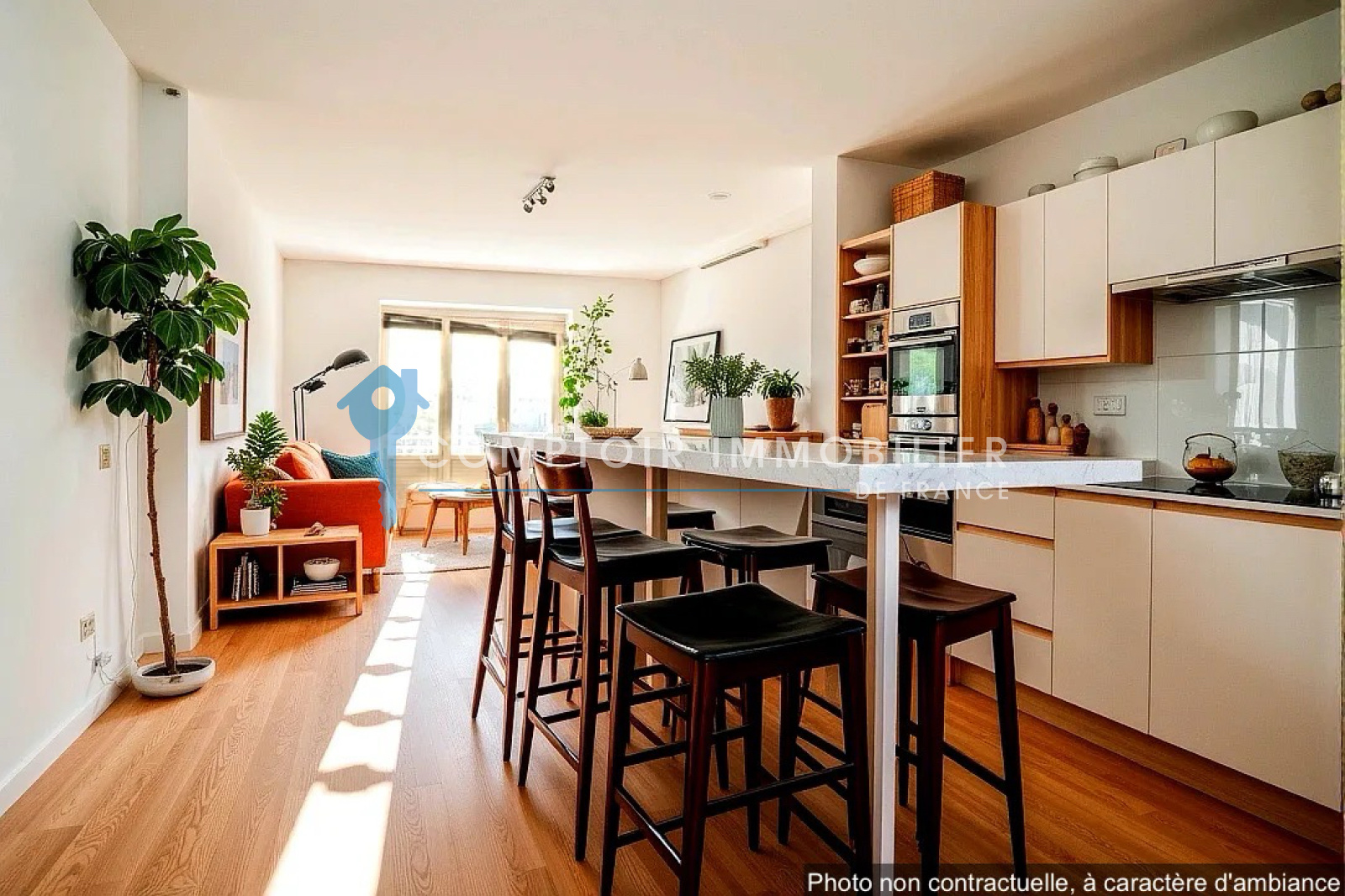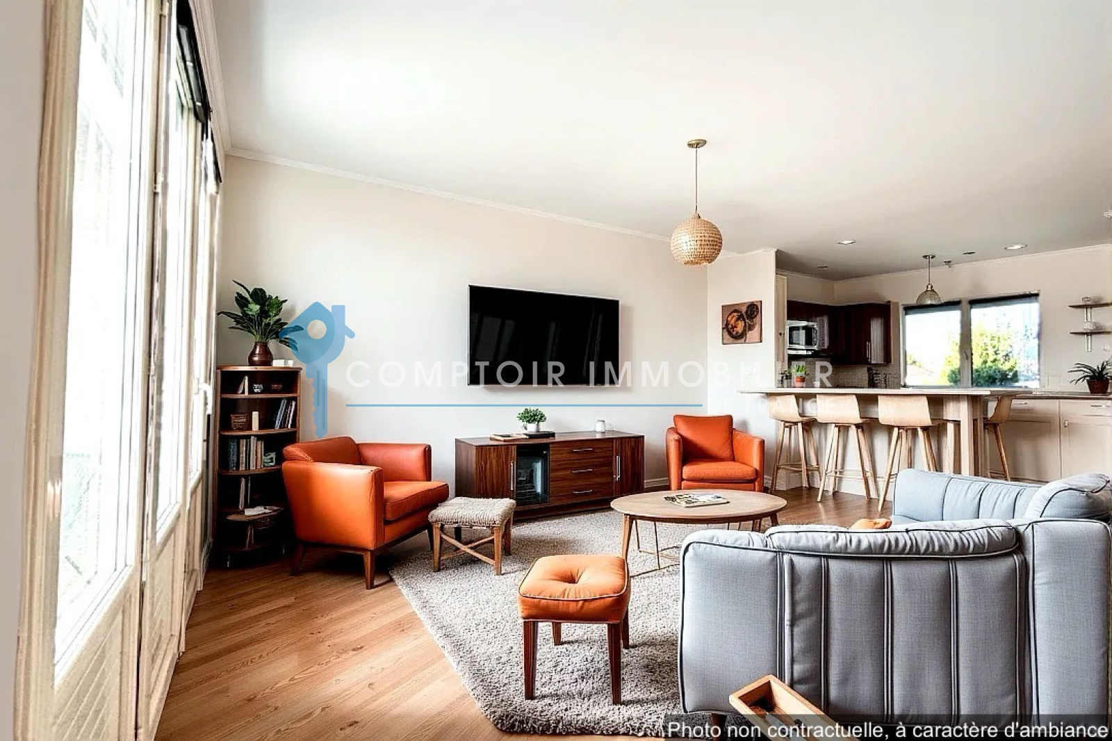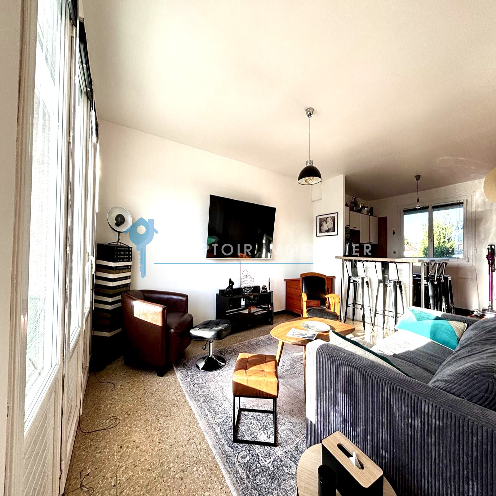 La pièce de vie spacieuse et traversante vous accueille dans une ambiance chaleureuse et moderne. La cuisine ouverte, entièrement aménagée et équipée, s’intègre harmonieusement à l’espace, invitant aux moments conviviaux en famille ou entre amis.