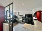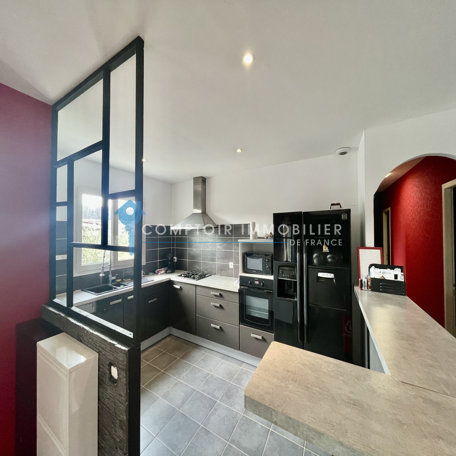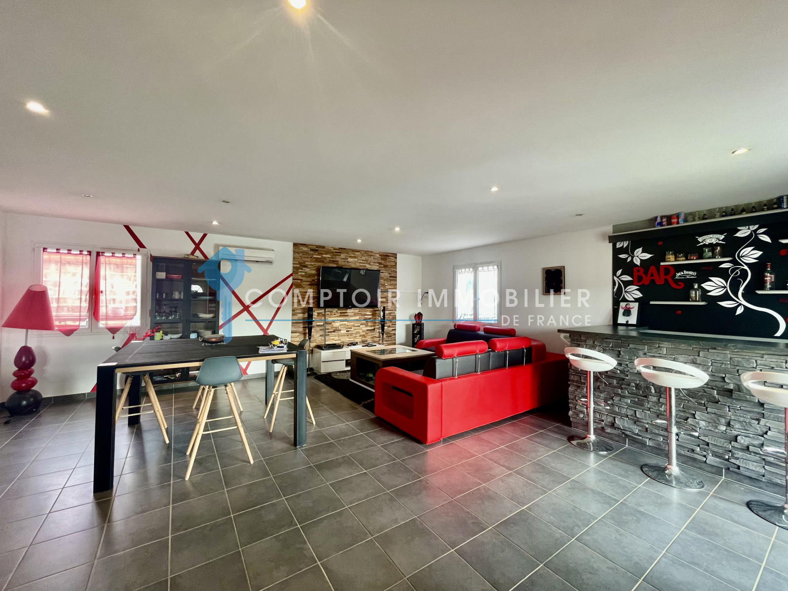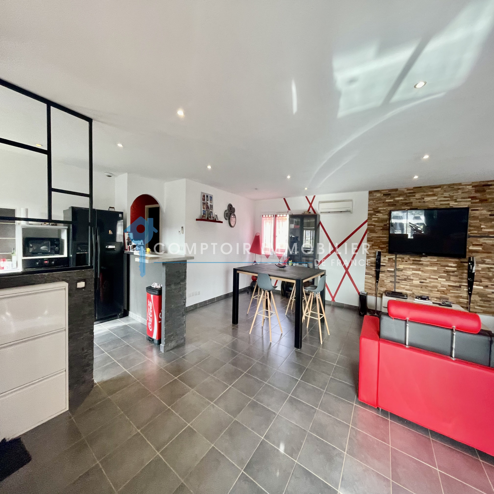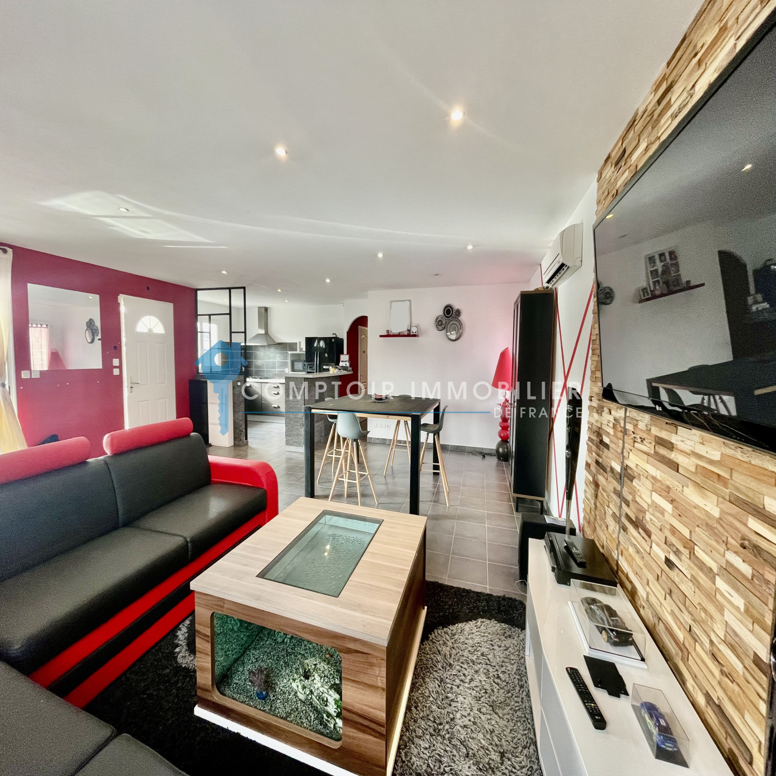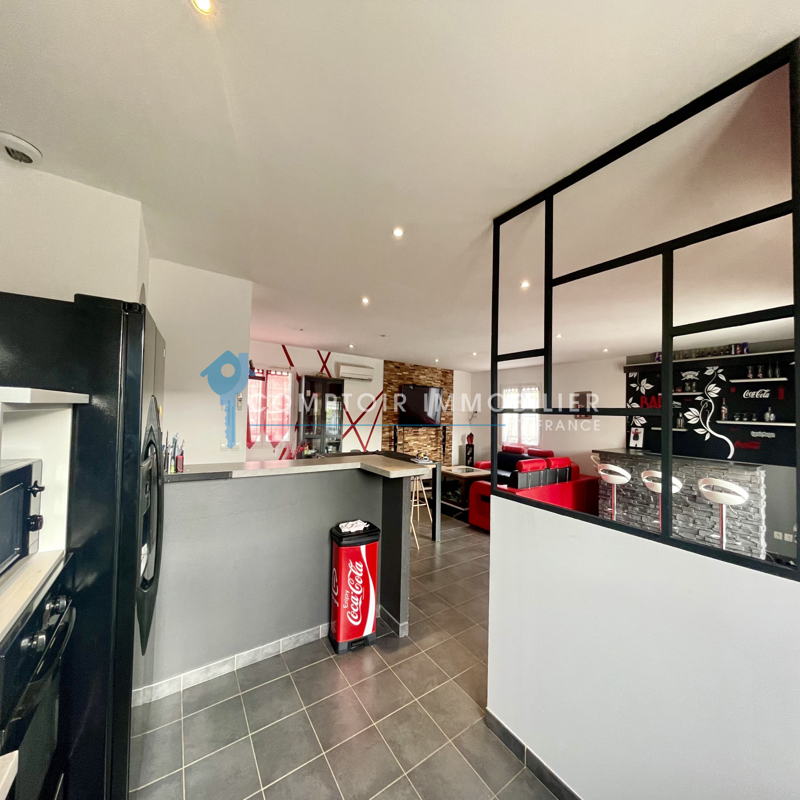 Cette maison de plain-pied propose dès l'ouverture de la porte, une pièce de vie lumineuse de plus de 60m2 avec une cuisine ouverte et équipée.