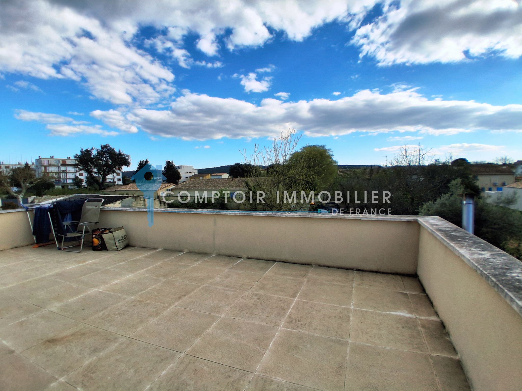 À l’étage : 3 chambres, salle de bain et grande terrasse.