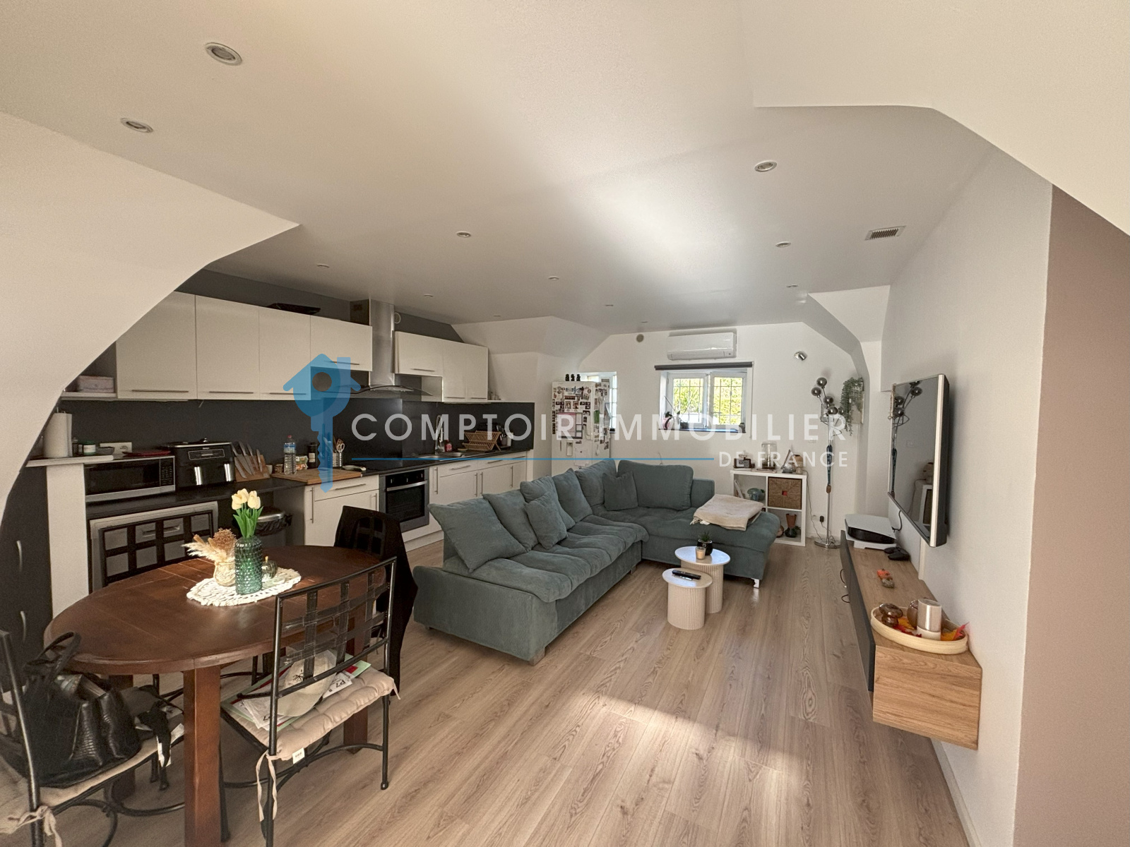 Une pièce de vie lumineuse intégrant une cuisine ouverte moderne, idéale pour la convivialité. Un garde-mangé attenant à la cuisine vient compléter la pièce principale.