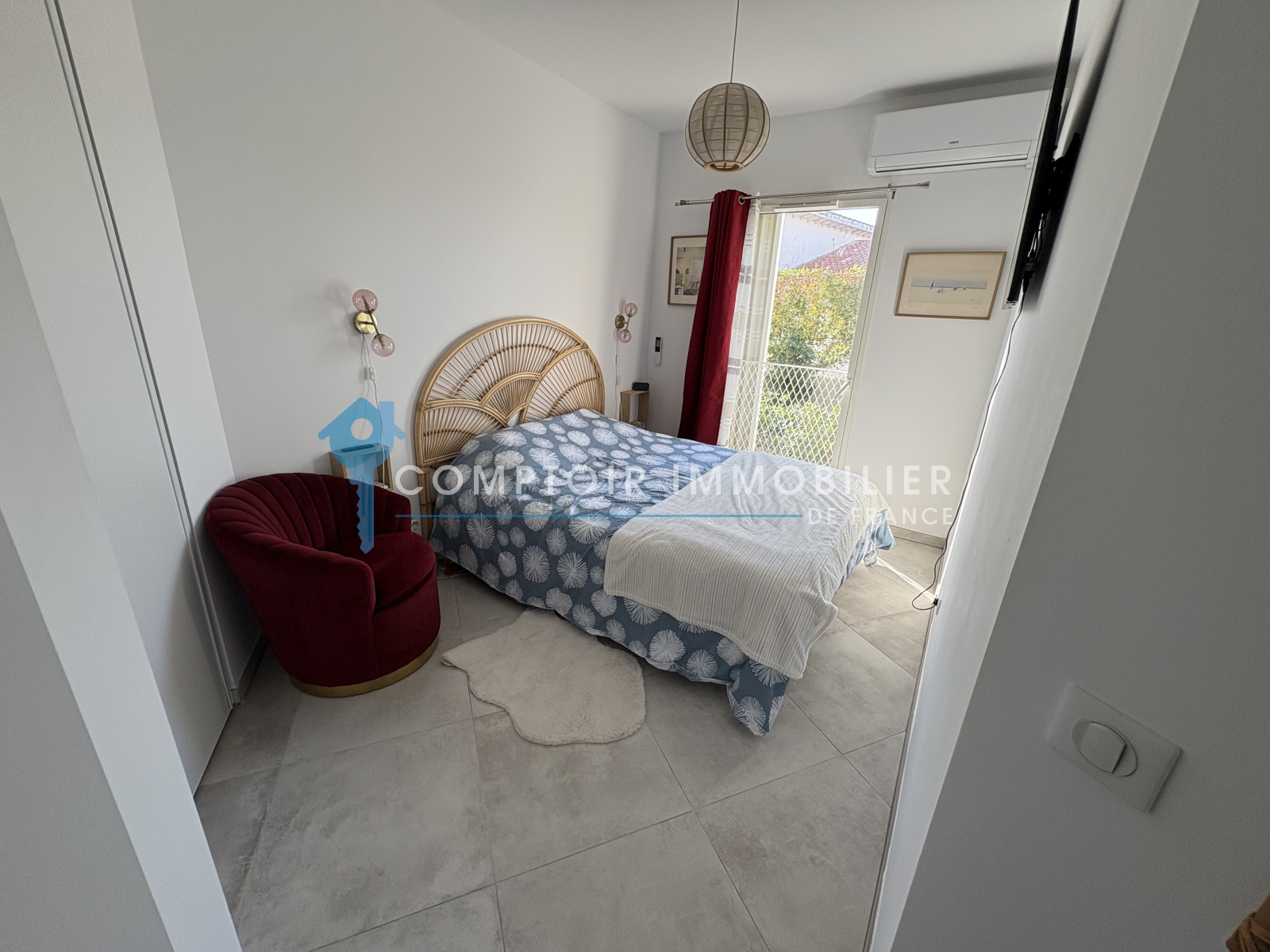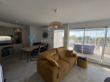 Au niveau zéro: une piece à vivre avec cuisine-sejour, un wc avec lave-mains et des rangements. Vous pourrez également profiter d'une belle terrasse avec vue sur l'étang et la mer.