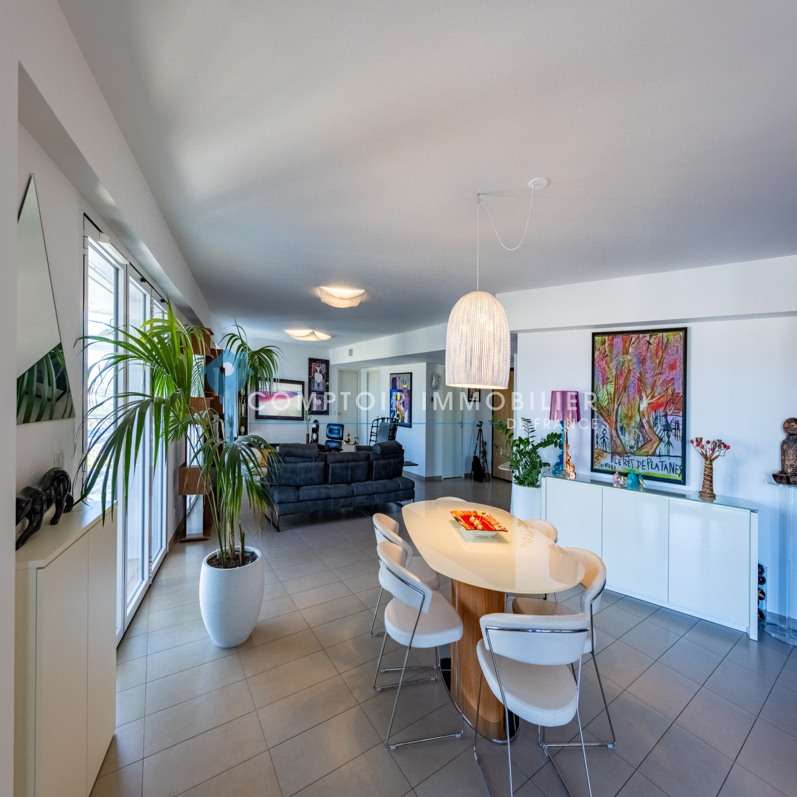 La pièce de vie des plus généreuses avec ses 80M², est éclairée par 3 belles baies vitrées ouvertes sur deux vastes terrasses pour des repas et des bains de soleil conviviaux. Vous pourrez admirer de beaux couchés de soleil sur la ville et l'arrière-pays.